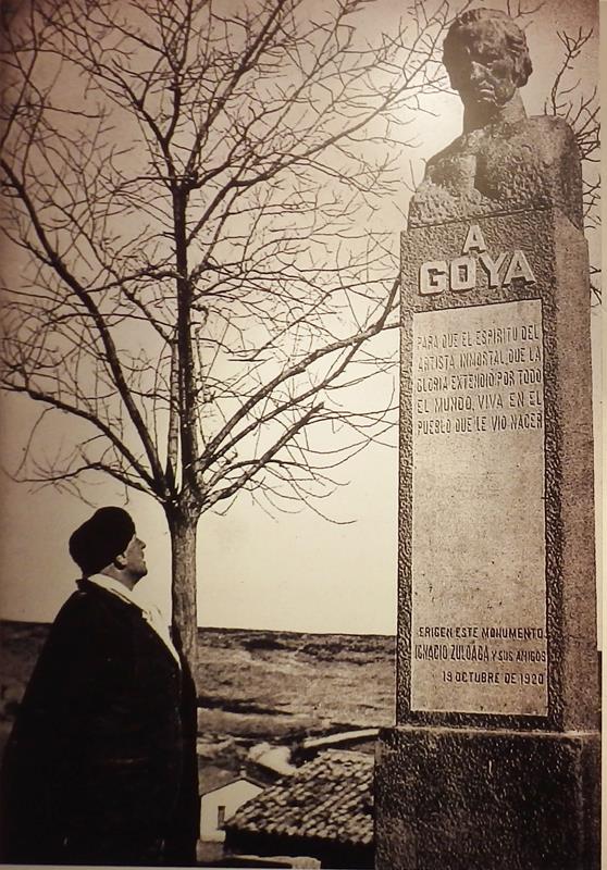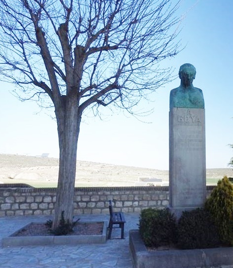 Llego a un espacio junto a la iglesia y desde donde se contempla todo el horizonte y parte del pueblo. Hay erigido un busto de Goya sobre un pequeño monolito, es el que colocaron en 1.920. Comparo la foto que había en la casa de Goya en la que aparece dicha escultura, y la que hago ahora, y está todo prácticamente igual, a pesar del paso del tiempo. Hay un árbol a la izquierda del busto que aunque mucho más viejo, aún sigue ahí. Tiene más de cien años seguro.