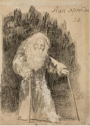 A continuación, nos enseña un dibujo de un autorretrato que se hizo ya de muy mayor, en 1826, con 80 años. Lo conoce poca gente.Luce barba blanca y larga, y va caminando ayudado de unos bastones. Goya escribe arriba, “aún aprendo” con lo que nos resume el espíritu del pintor y su forma de entender la vida. Representa, el espíritu del ser humano genuino, el que nunca deja de disfrutar, cuyo sentido de la curiosidad es inagotable aunque el cuerpo no le responda ya.