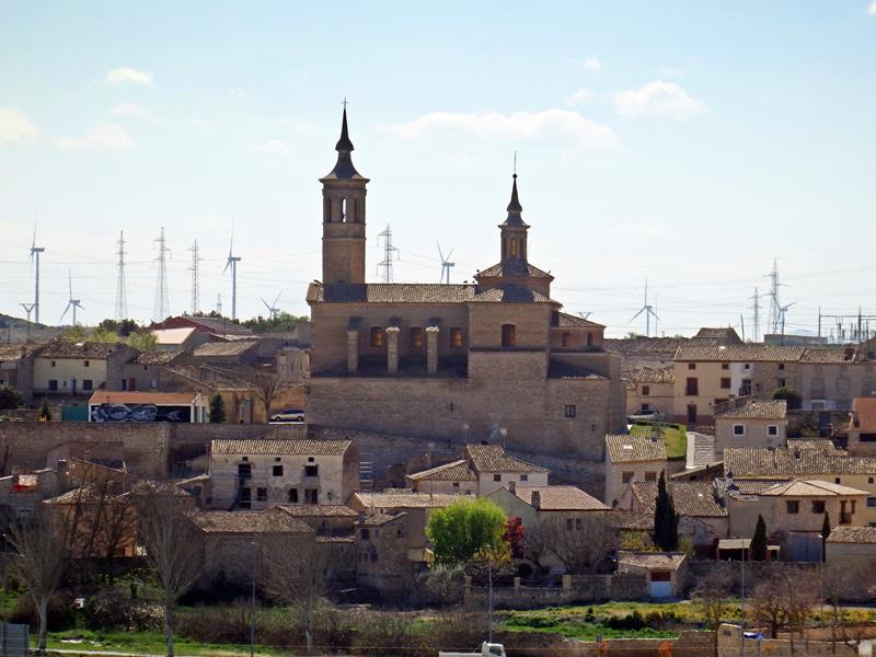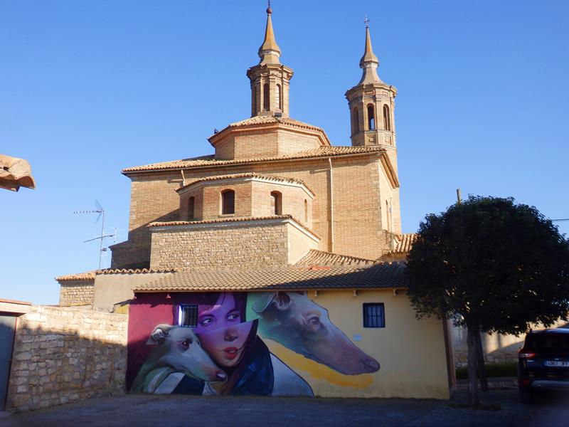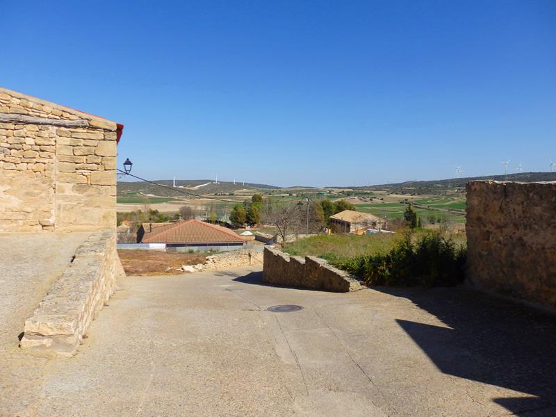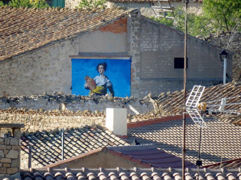 Desde allí tengo buenas vistas del entorno y de toda la zona colindante. A lo lejos diviso una puerta de lo que parece ser un garaje que está decorado con una pintura de vivos colores en la que aparece una mujer llevando un cántaro. Se nota que esto es el pueblo natal de Goya.