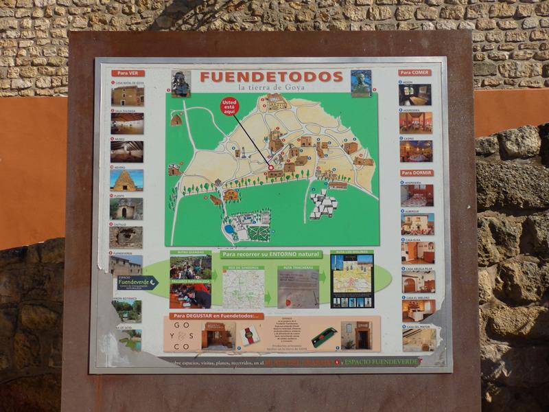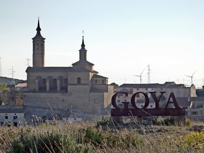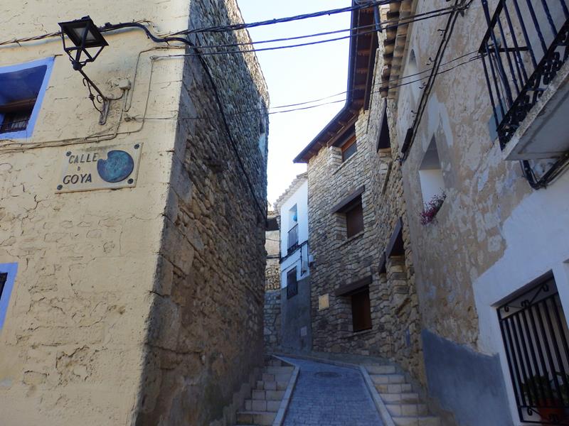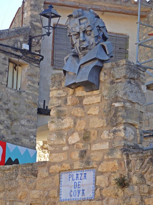Por fin, al cabo de unos 15,5 km desde que dejé Jaulín aparece Fuendetodos. El pueblo se ve a lo lejos, sobre una loma, y en un lateral de la carretera distingo unas letras de metal que dicen: “GOYA”. Voy avanzando con el coche y descendiendo hacia el pueblo,llego a mi destino.