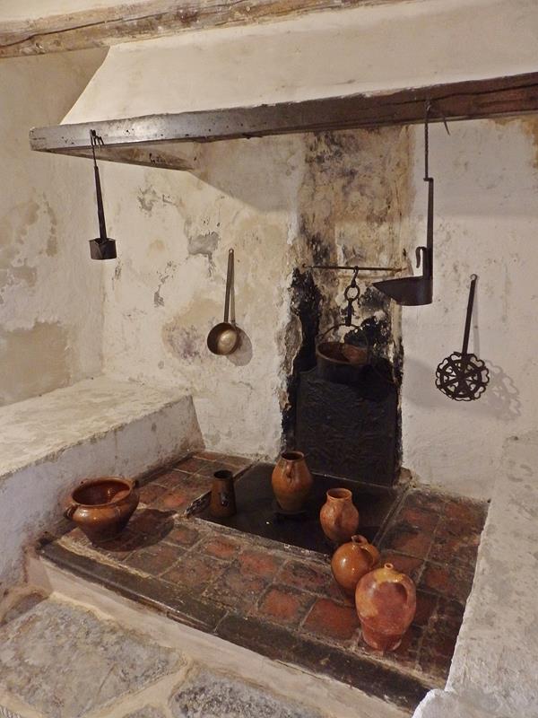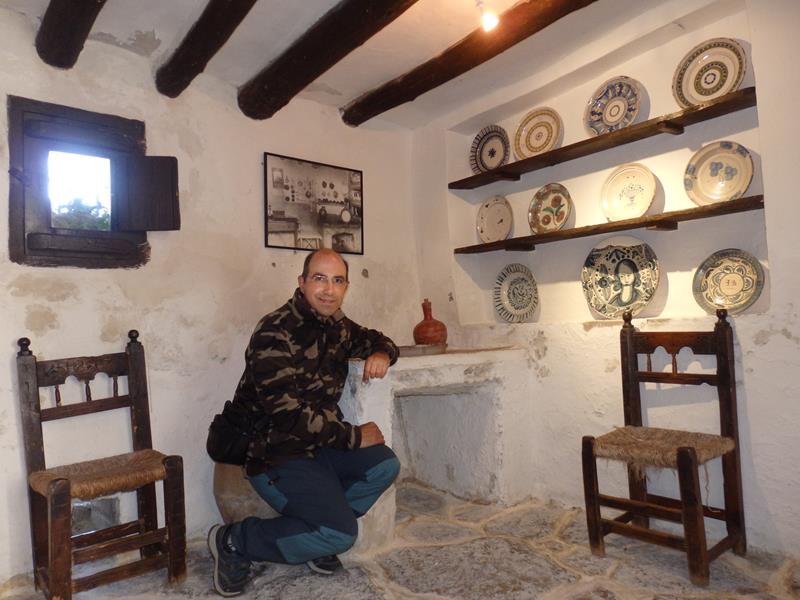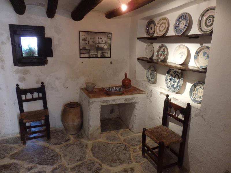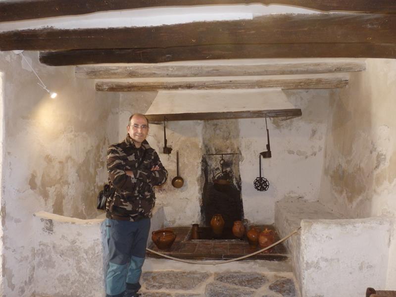 La cocina era el lugar donde se vivía habitualmente, donde se hacia la mayor parte de la vida. Ahí se comía, pero también se charlaba. En Fuendetodos hacía mucho frío en invierno, así que el fuego de la cocina, de la cadiera, como se dice en Aragón, se mantenía encendido todo el tiempo. Sacaba tanto humo la chimenea de cada casa que a los habitantes de este pueblo les llamaban los fumarados. El guía nos dice que imaginemos el olor que desprendería toda esa gente. A ambos lados del hogar que es donde se colocaría la olla, hay dos bancadas hechas del mismo material que las paredes, de obra, y que sirven para sentarse. Nos dice que los muebles que pueden verse, aunque antiguos, no son los originales, ya que no se han conservado, pero todo lo demás, es tal y como era en vida de Goya. Contigua a la cocina está la despensa, lugar donde se almacenaban la mayor parte de los alimentos.