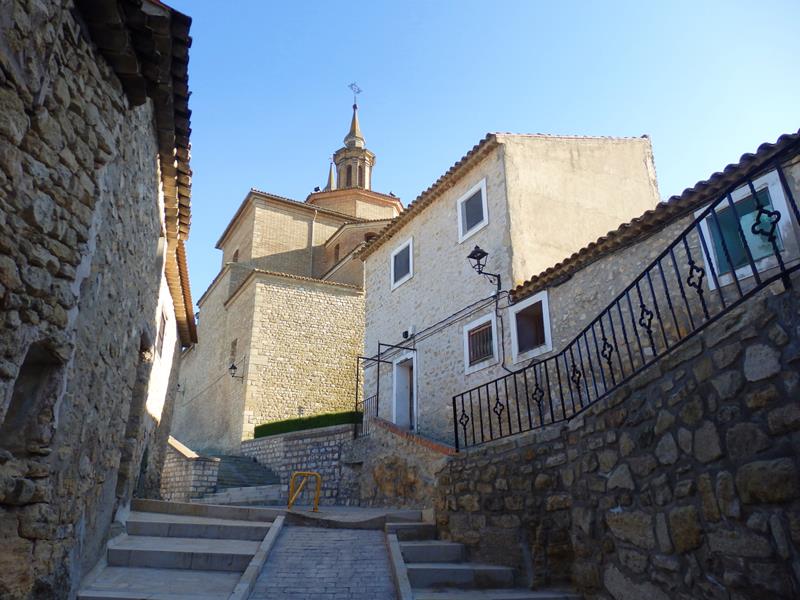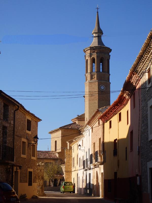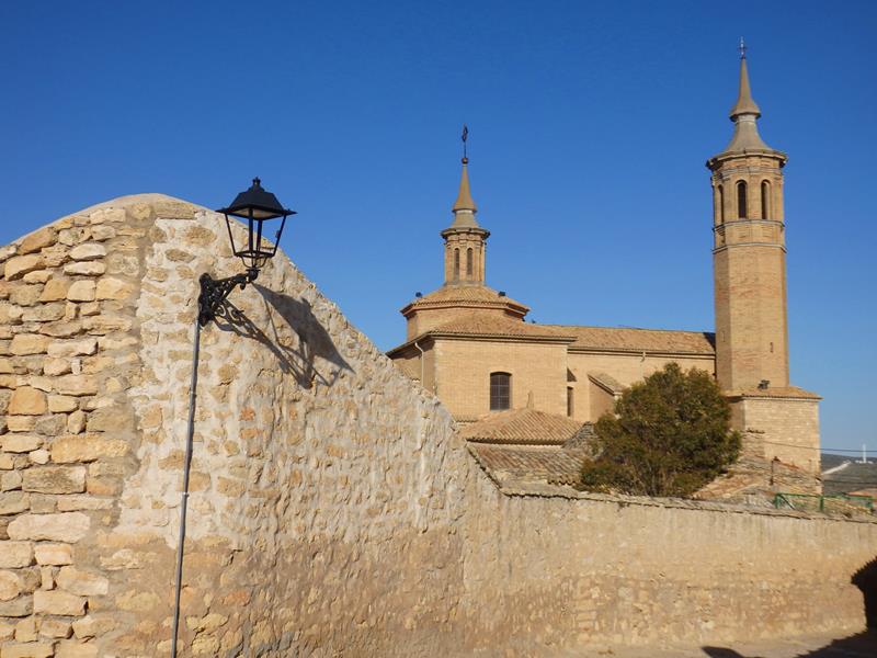 Casi todo el grupo de gente que sale de la casa y que me ha acompañado antes, o se monta en sus coches y se va, o como oigo decir a algunos, se van al bar a tomar algo. De nuevo no hay nadie por las calles. Voy subiendo otra vez las calles en cuesta y llego a la zona donde está ubicada la iglesia. Es del siglo XVIII, se llama Nuestra Señora de la Asunción, pero fue prácticamente destruida durante la Guerra Civil Española. Después la reconstruyeron. La pila bautismal, donde Goya fue bautizado, se sigue conservando hoy en día.