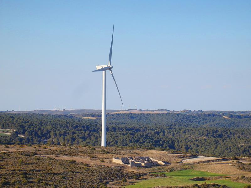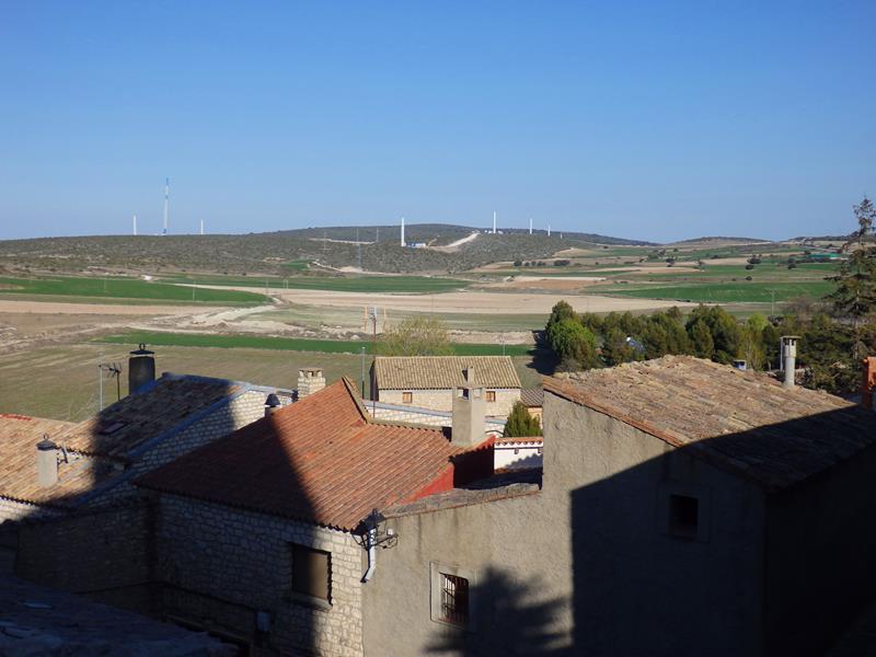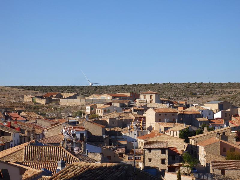 Se van tomando más curvas hasta que llegas arriba, donde ya no hay turbinas, pero el paisaje que queda abajo está salpicado de ellas, me parece una vista muy chula. Ahora apenas me cruzo con algún coche. Al rato distingo un cartel con letras blancas y fondo morado en el lado izquierdo de la carretera que dice «vestigios de la guerra civil». Paso de largo, mi objetivo es Fuendetodos, pero pienso que si vuelvo con tiempo, me pararé a ver de qué se trata.