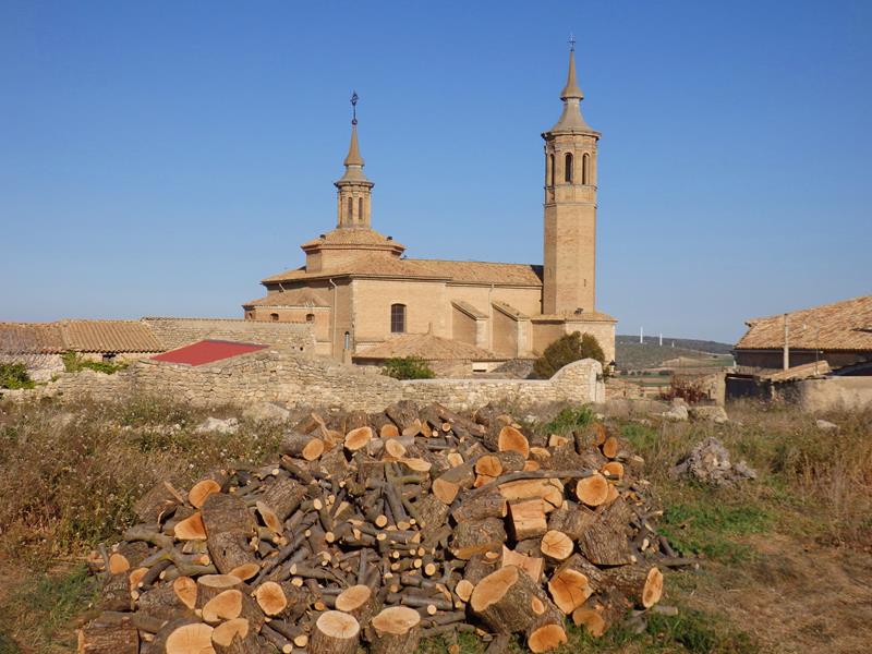 Sigo caminando. Ahora sí que ya no queda pueblo. Lo que sigue son campos. Estoy en la parte más alta. Alguien ha amontonado leña. Con la iglesia de fondo, la foto no puede quedar más rústica.