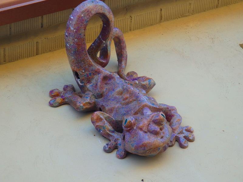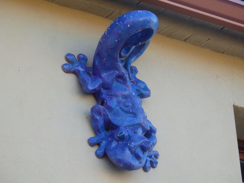 Voy bajando ya hacia el coche. Me encuentro con un cartel que anuncia el espacio de naturaleza Fuendeverde. Me acerco. Está cerrado. En la pared del edificio hay dos salamandras decorativas.