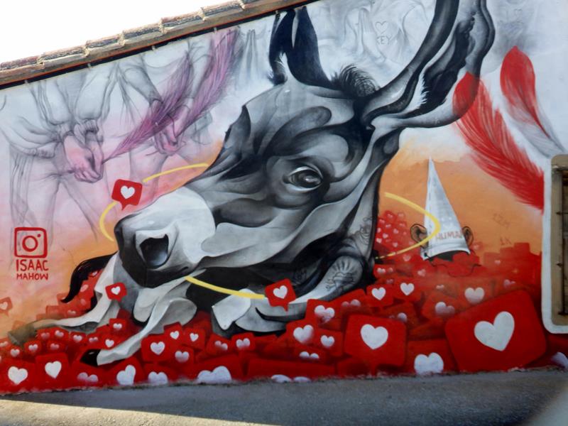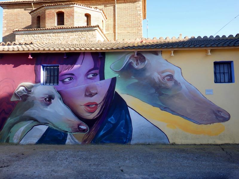 Después sigo el paseo y vuelvo a acercarme a la zona de la iglesia con intención de bajar hasta donde tengo el coche aparcado. Atravieso una especie de plazuela, y descubro que en los muros de las casas que la forman han pintado unos grandes murales de estilo moderno. Quedan chulos. Al poco accedo a una plaza más amplia, donde hay aparcados varios coches, y en el centro, una figura de un Santo en lo alto, metido en una especie de urna, y sobre un pedestal.