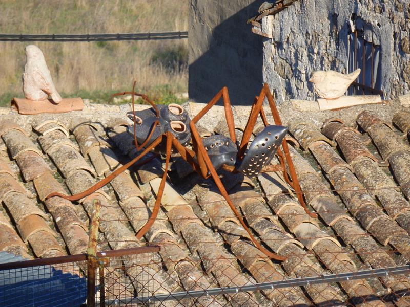 Desde ahí vuelvo a tener vistas de la parte del pueblo que queda más abajo, y de los tejados. Sobre uno de ellos han puesto lo que parece ser una hormiga gigante de metal. Decididamente pienso que se nota que aquí nació Goya, y que la gente se ha dejado contagiar en cierta forma del espíritu creativo del pintor.