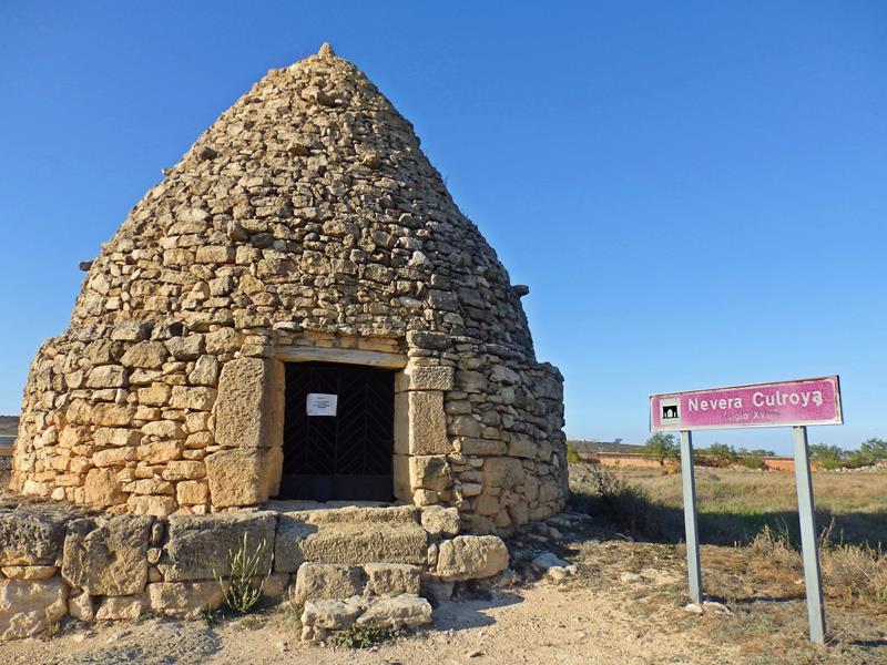 El nevero de Fuendetodos es el más monumental de la comarca de Belchite. Su construcción está datada en el siglo XVIII y se conoce popularmente como Culroya. Destaca por su cúpula construida en piedra con forma cónica. El nevero se puede visitar, pero en ese momento está cerrado, que pena. Para otra ocasión será.