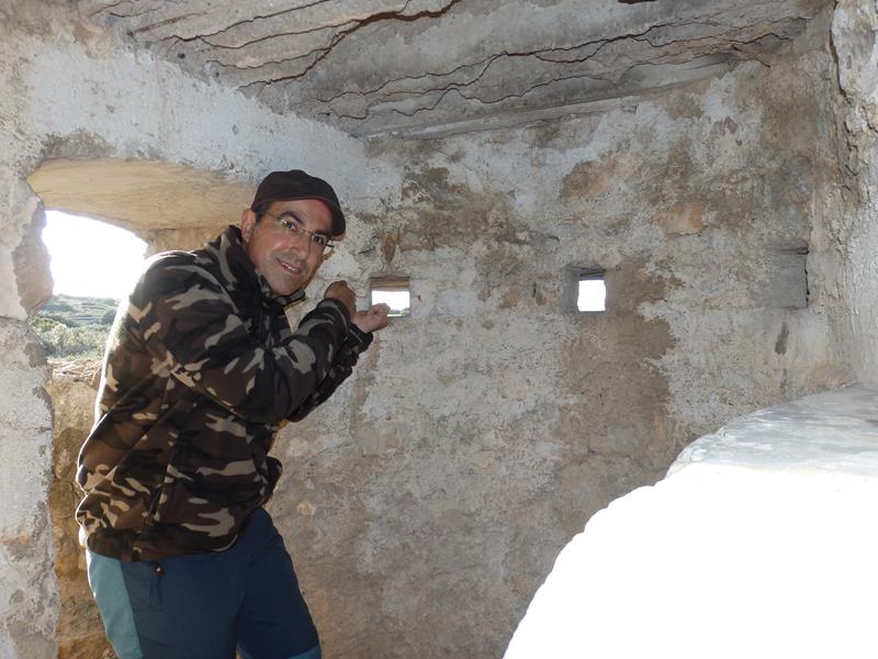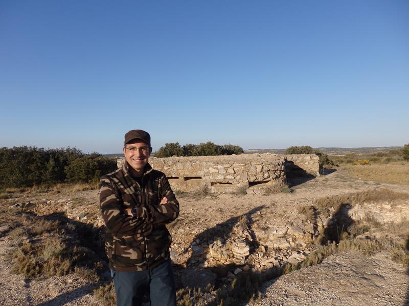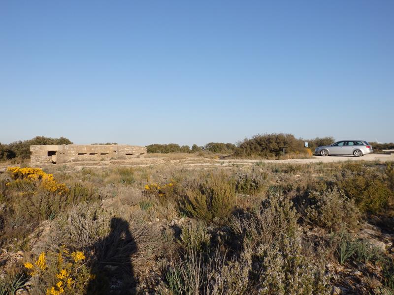 De un vistazo rápido, veo una especie de búnker, o nido de ametralladoras, cubierto. Y algunas trincheras rodeando el conjunto. También hay una plataforma de hierro, a modo de pasarela, que han puesto para superar una de las trincheras y que facilita el acceso a la construcción defensiva. Vienen cruzándola. Es una familia, nos saludamos y a una chica joven que me pasa cerca, y antes de que se vaya, le pido por favor si me puede hacer una foto en el lugar, a lo que se presta muy amablemente. Mientras, un hombre del grupo se está dedicando a arrancar manojos de romero y tomillo de los alrededores y a comentar lo bonitas que están “esas florecillas amarillas” que aparecen por doquier. Al final montan en su coche y se van.