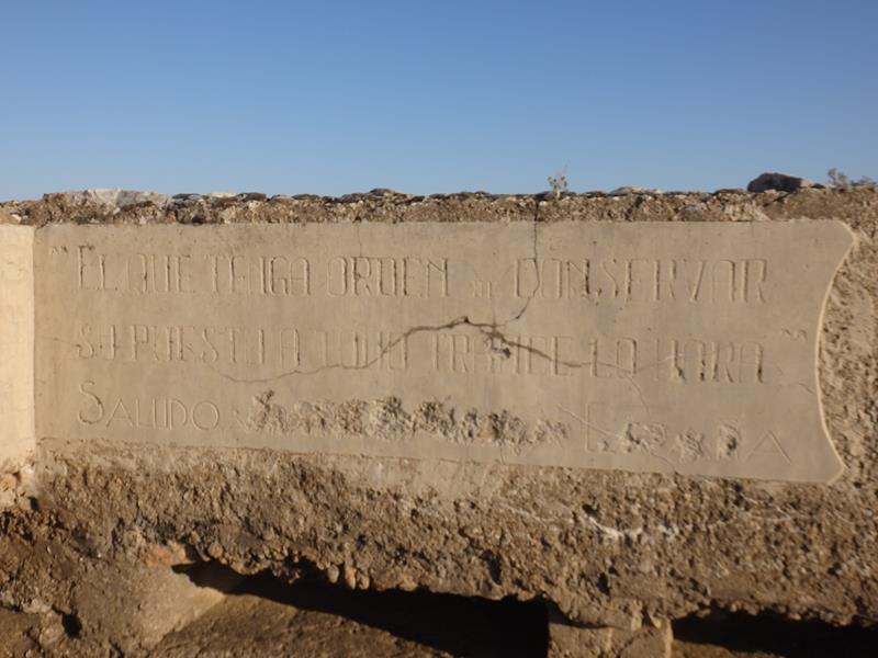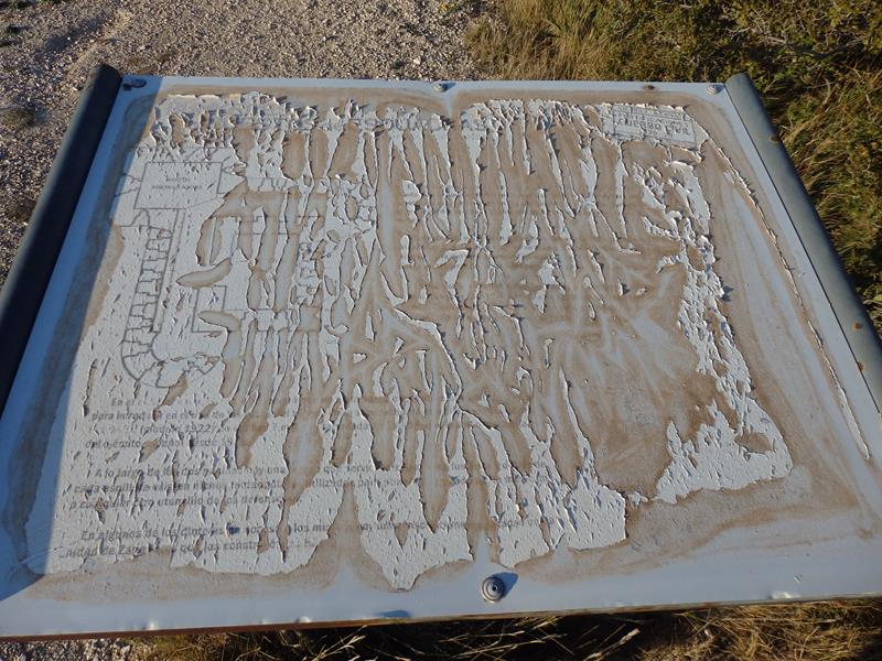 Me aseguro de cerrar bien el vehículo, y comienzo a caminar. Casi sin darme cuenta me topo con un panel explicativo que está cercano a los restos. Pero me llevo una gran desilusión ¡no se ve nada!. Lo han dejado deteriorarse hasta el punto de convertirse en totalmente ilegible. Alguien debería hacer algo al respecto, la impresión de abandono y desidia, es total. Mientras estoy ensimismado en estos pensamientos, aparecen y vienen hacia mí, en animada charla, unas cuantas personas que salen de entre los restos. Son los dueños del otro coche, y ya se van.