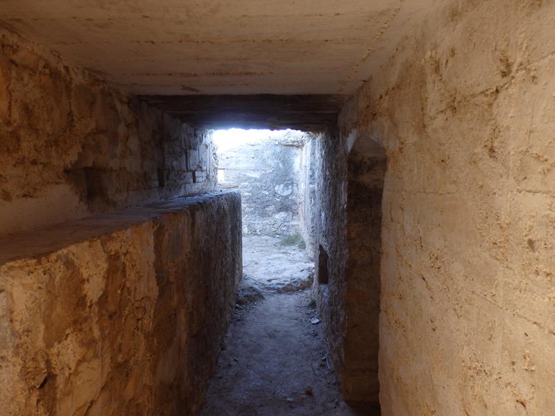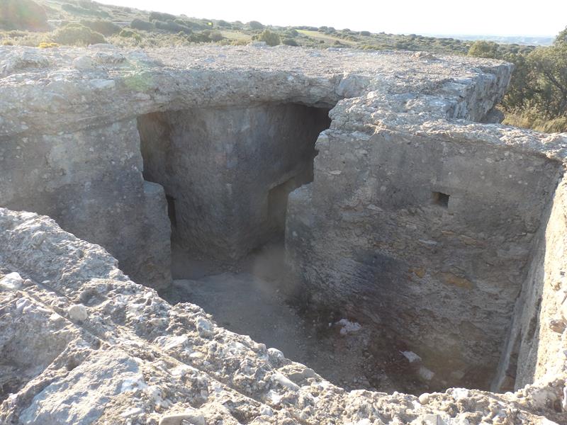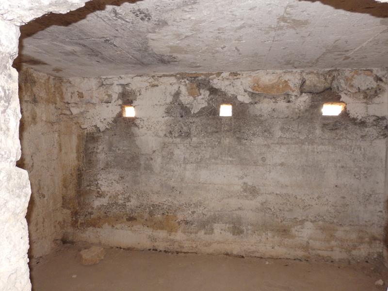 Una vez dentro, la sensación es de muy poco espacio, bastante agobiante. En un lateral una pequeña dependencia por llamarlo de alguna forma, donde se adivina una especie de zona en la que supongo dormirían por turnos los soldados que estuvieran a cargo de la posición. Parte de la estructura tiene techo, otra parte no, seguramente se ha caído por el paso del tiempo.
