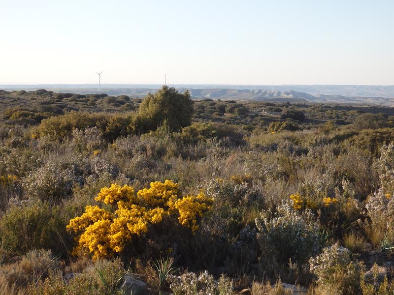 Así que después de rehacer el camino, pero en dirección contraria, llego a la zona donde había visto esa señal. Voy despacio con el coche, no me la vaya a pasar. La carretera discurre entre algunos encinares y monte bajo. Ya he pasado la primera zona de los aerogeneradores, en la planicie, pero me queda por pasar la que se ve más abajo, desde lo alto, así que estoy por decirlo de alguna forma, entre ambas.