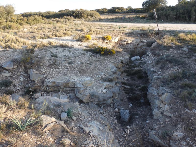 De pronto, tal y como recordaba, en un lateral de la carretera, y a mano derecha dirección Jaulín, aparece la típica señal de color morado rosáceo indicando el acceso a los restos. Giro y entro en un camino de tierra. A los pocos metros llego a un espacio donde se puede aparcar el coche. Hay otro vehículo. No soy el único que ha pensado en parar aquí. Por un lado me alegro, pues si lo necesito, puedo pedir a alguien que me haga una foto de recuerdo, pues no hay ningún lugar donde apoyar mi pequeño trípode, por otro, no, pues me gusta ver las cosas tranquilo.