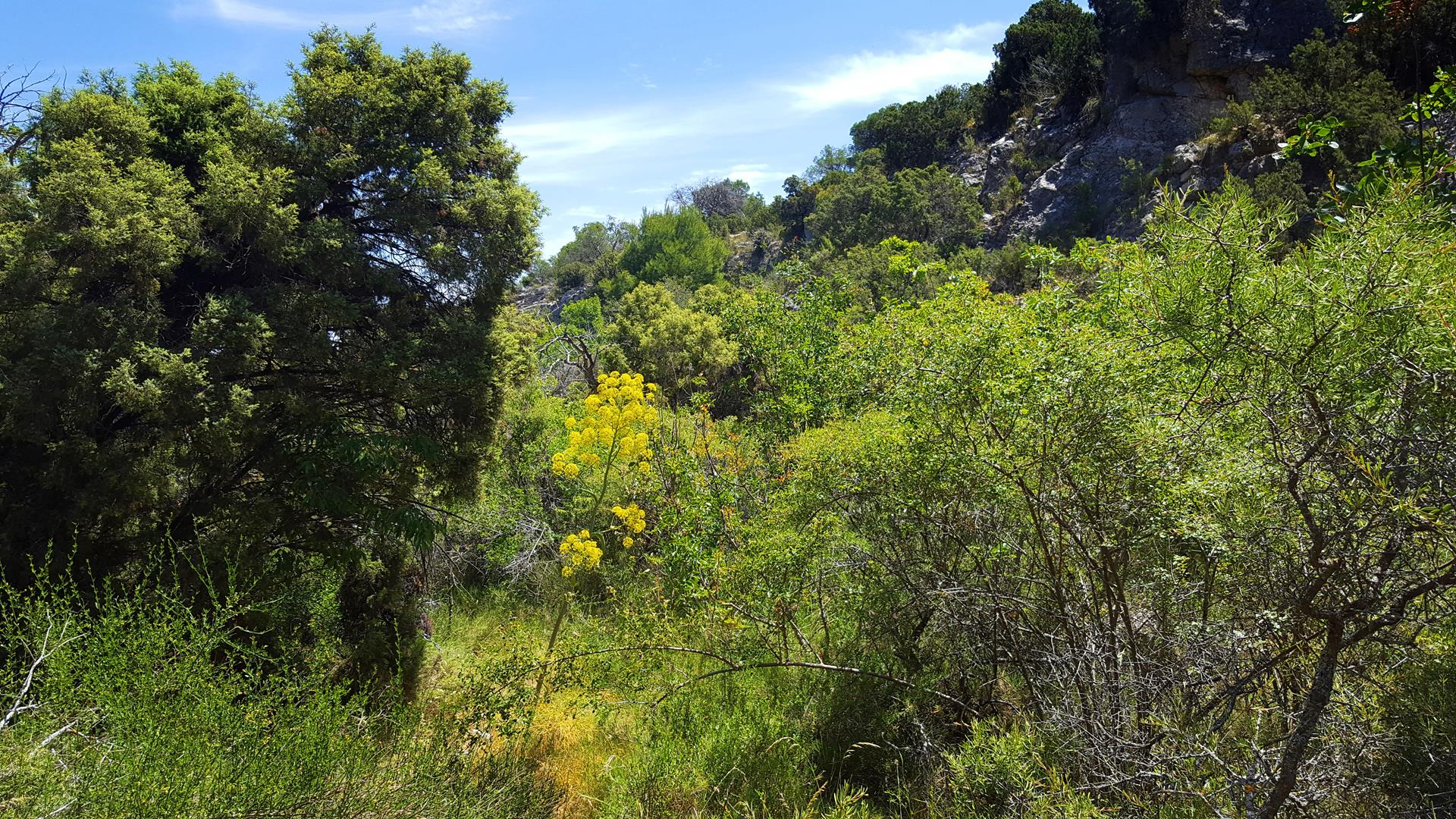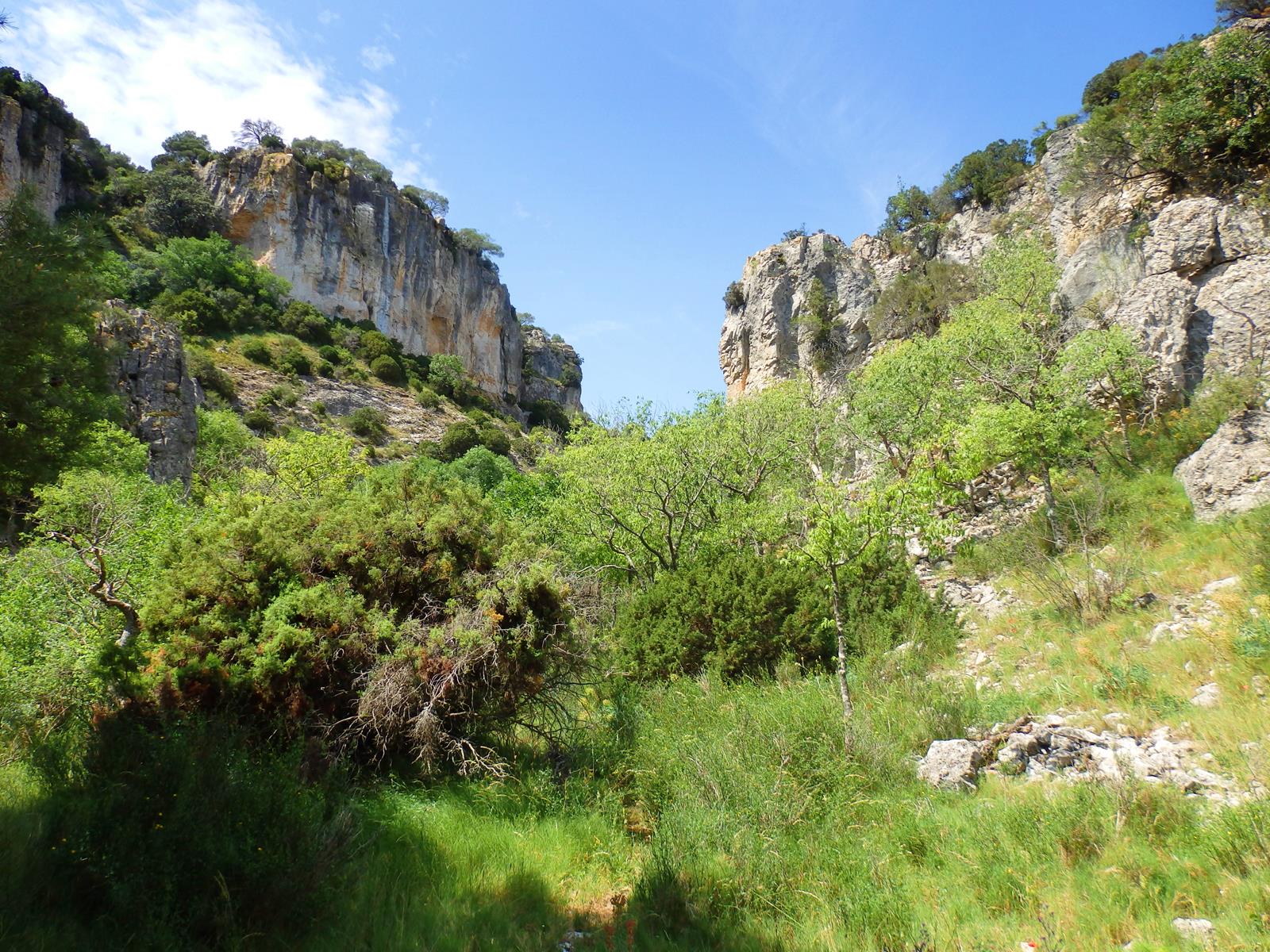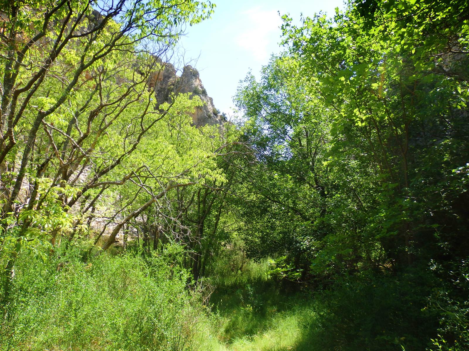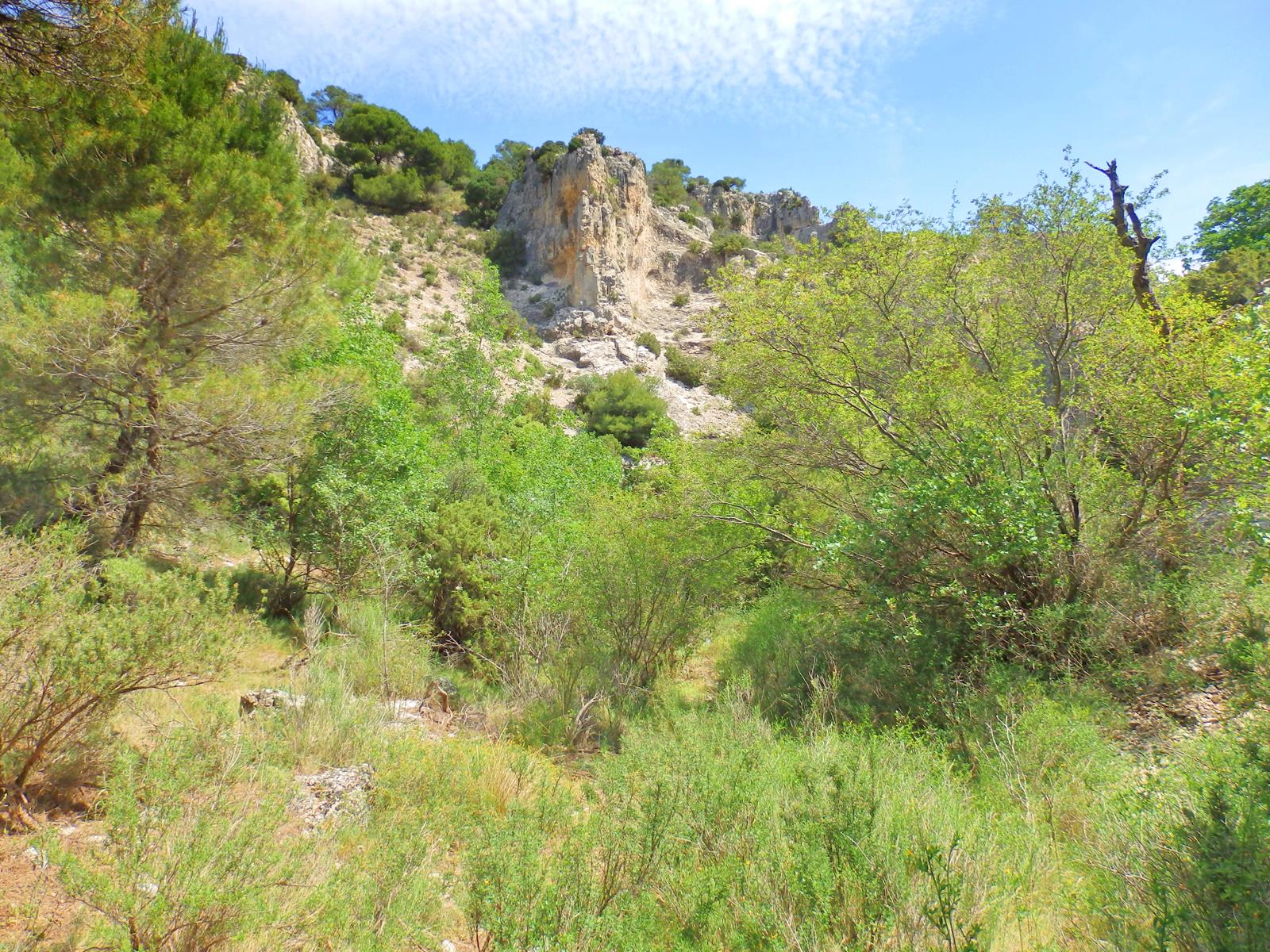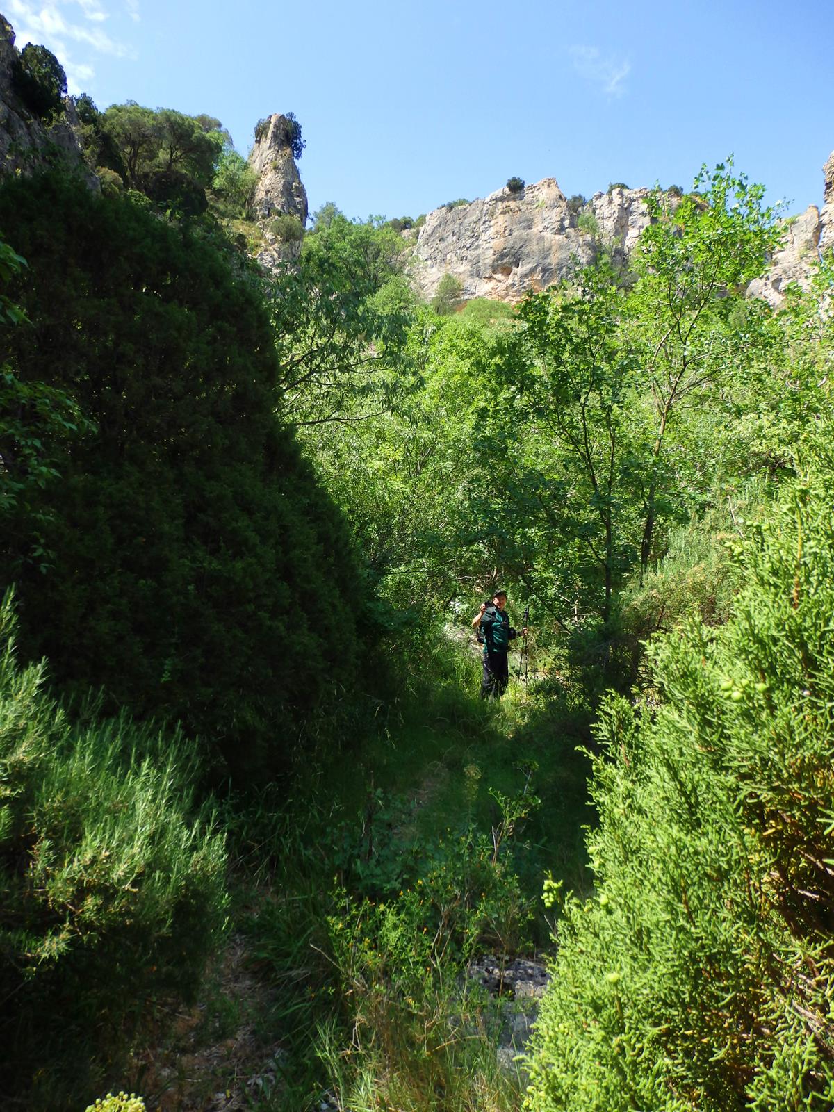 Al principio la senda está más o menos marcada. Aunque a medida que se avanza la vegetación la cubre hasta desaparecer casi por completo. Estamos rodeados de verde. Arces de Montpellier, todo tipo de arbustos, hay flores en las ramas, y plantas de distintas clases que me es imposible clasificar por su gran variedad.