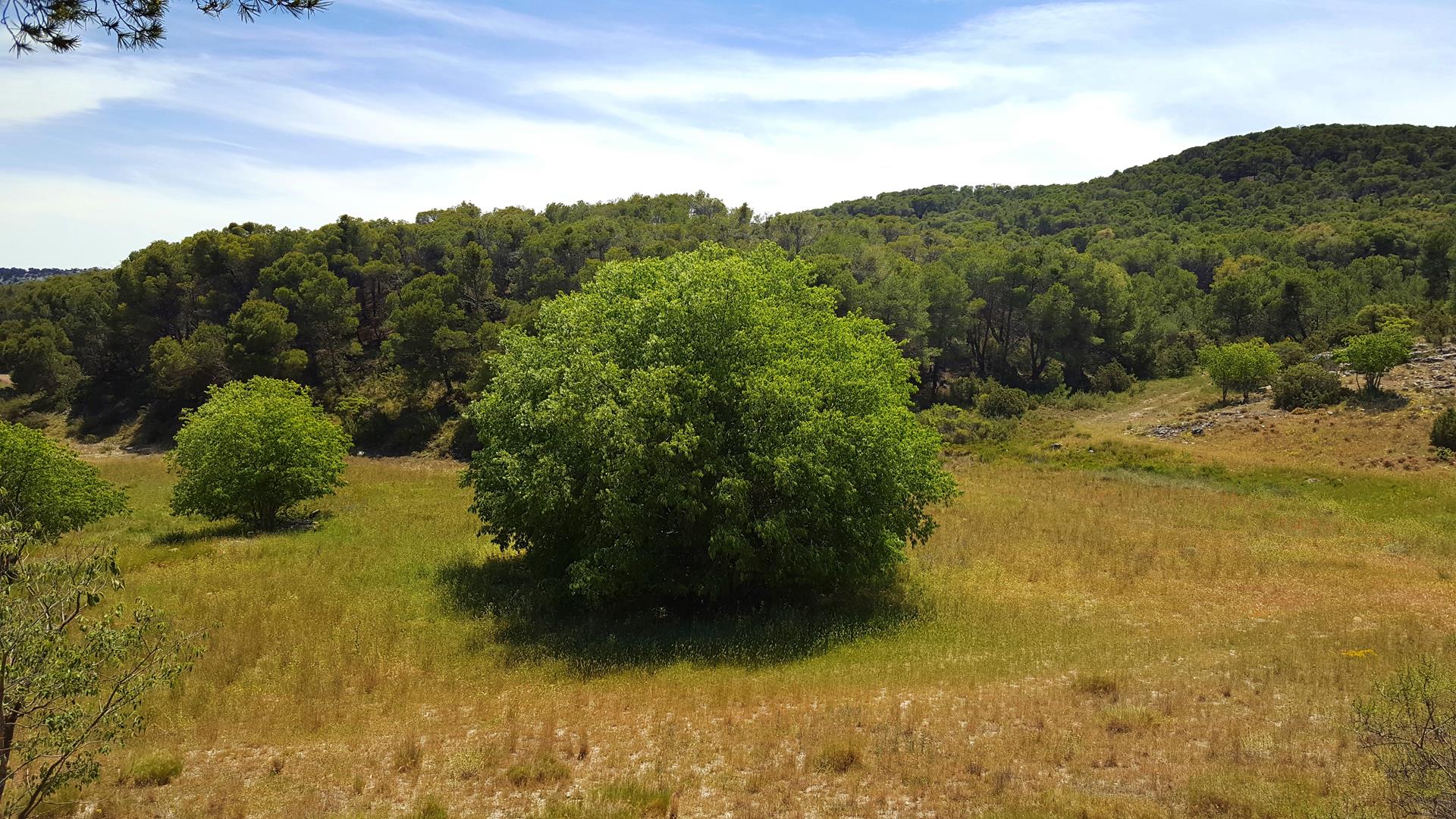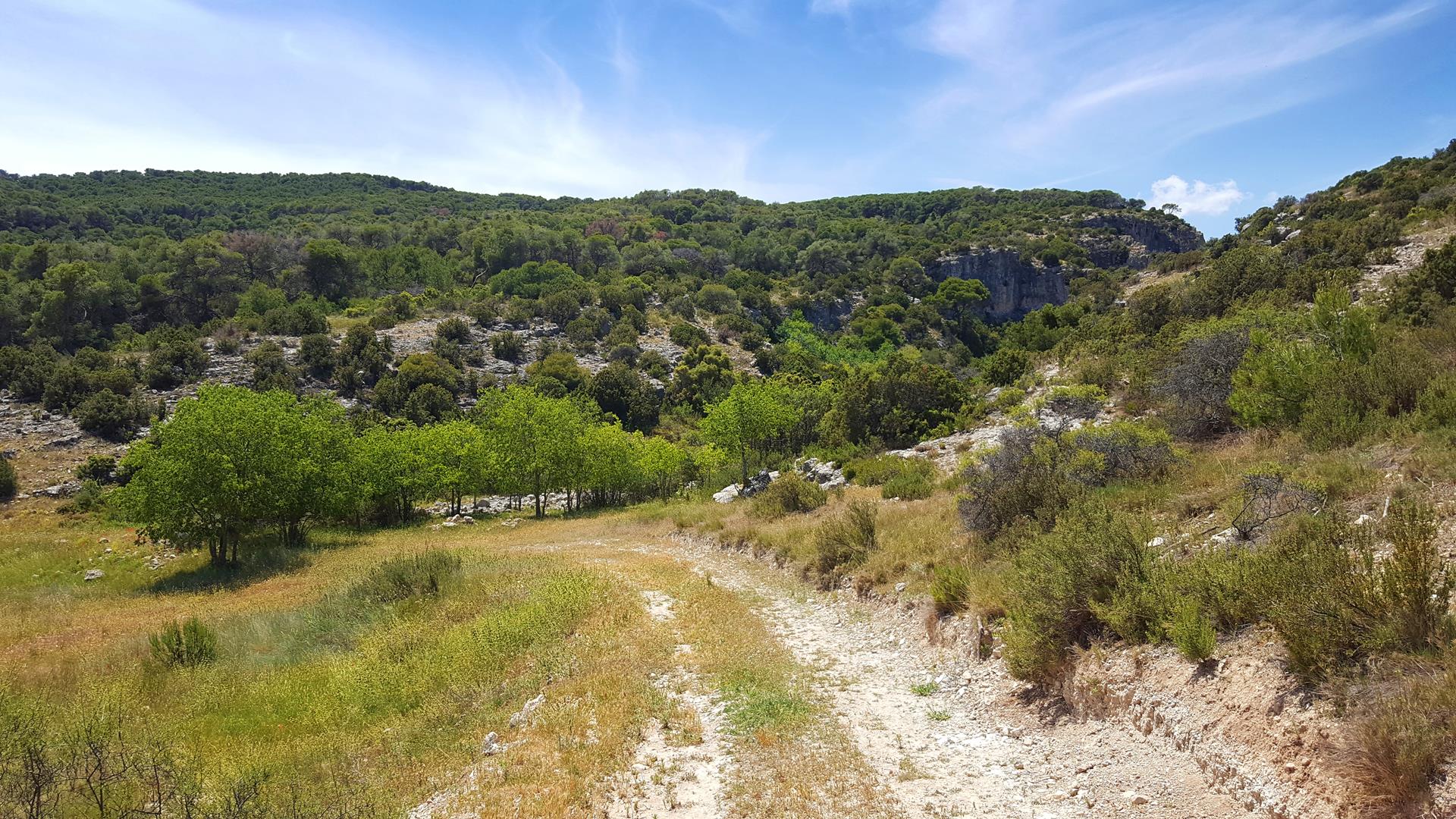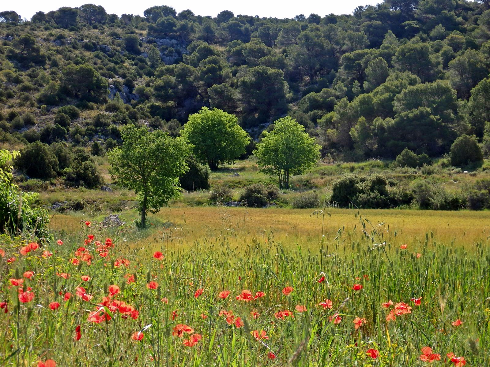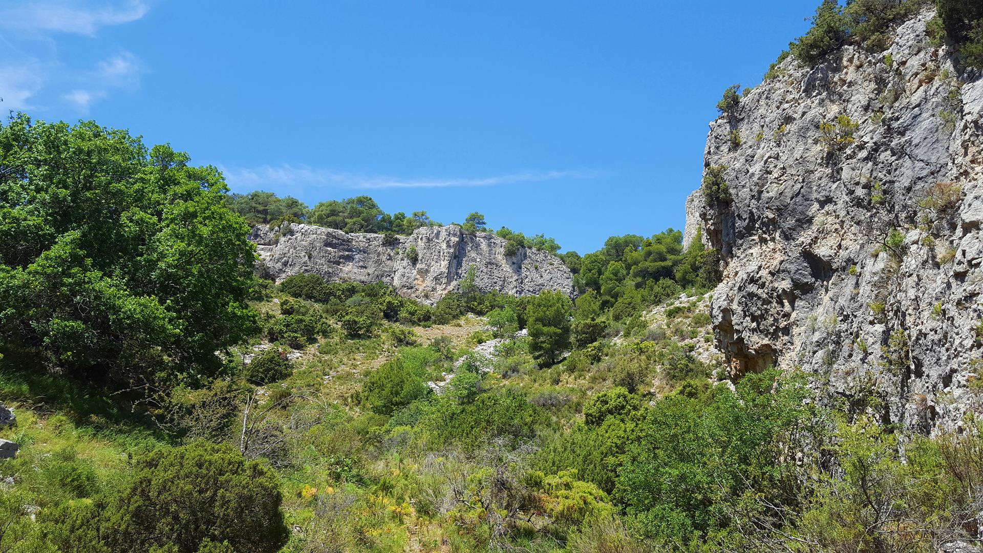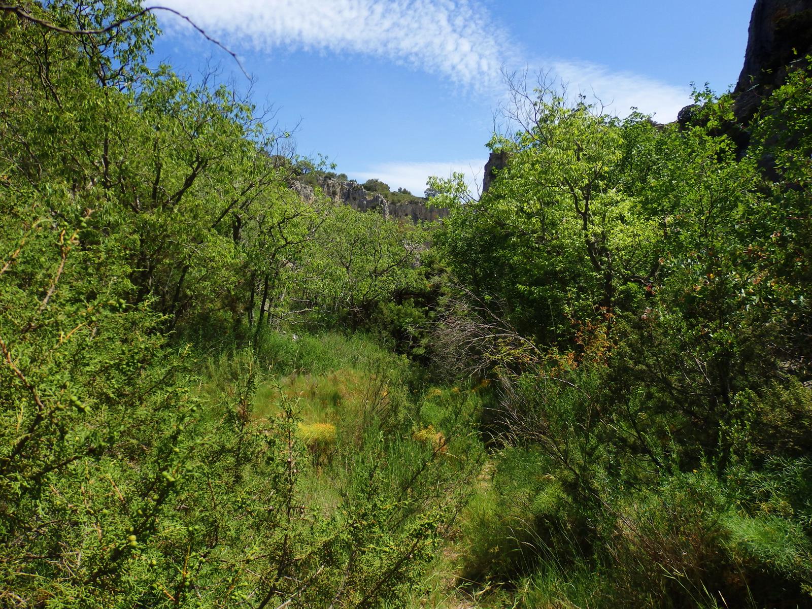 Al principio la senda está más o menos marcada. Aunque a medida que se avanza la vegetación la cubre hasta desaparecer casi por completo. Estamos rodeados de verde. Arces de Montpellier, todo tipo de arbustos, hay flores en las ramas, y plantas de distintas clases que me es imposible clasificar por su gran variedad.