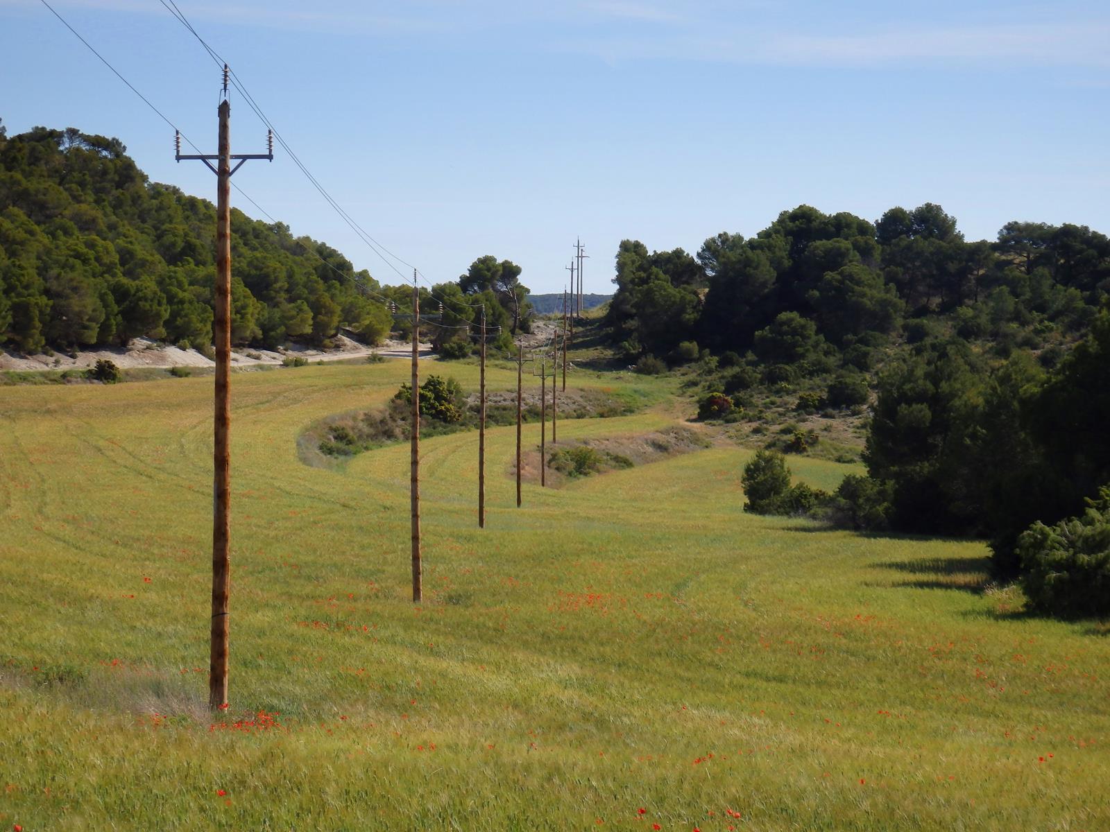 Al cabo de unos 4 km, o lo que es lo mismo, después de una hora más o menos de caminata a paso normal, en los que la pista alterna bajadas con zonas en horizontal, llegamos a las proximidades de nuestro primer objetivo, la Hoz o Foz Mayor, como se dice en aragonés. Para acceder a ella hay que desviarse del camino principal hacia la derecha, bordeando un campo y cruzando por debajo de un tendido eléctrico como ahora explicaré.