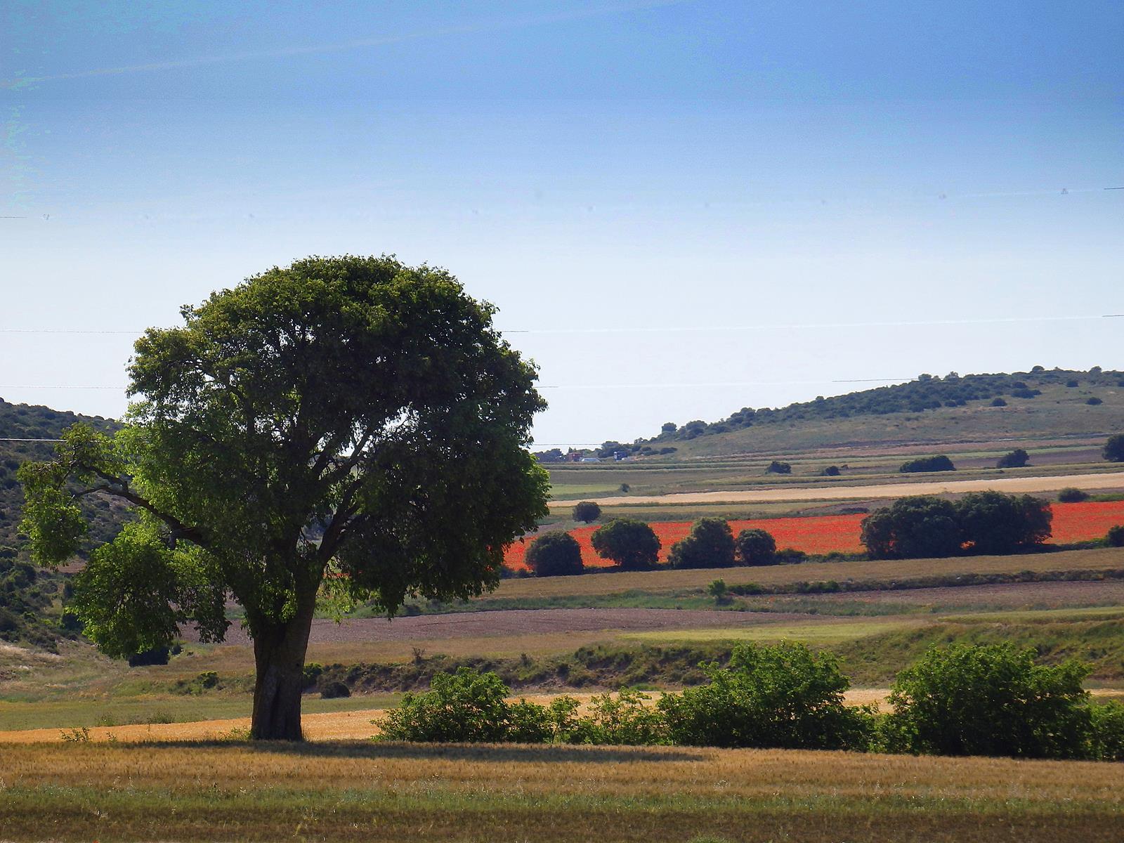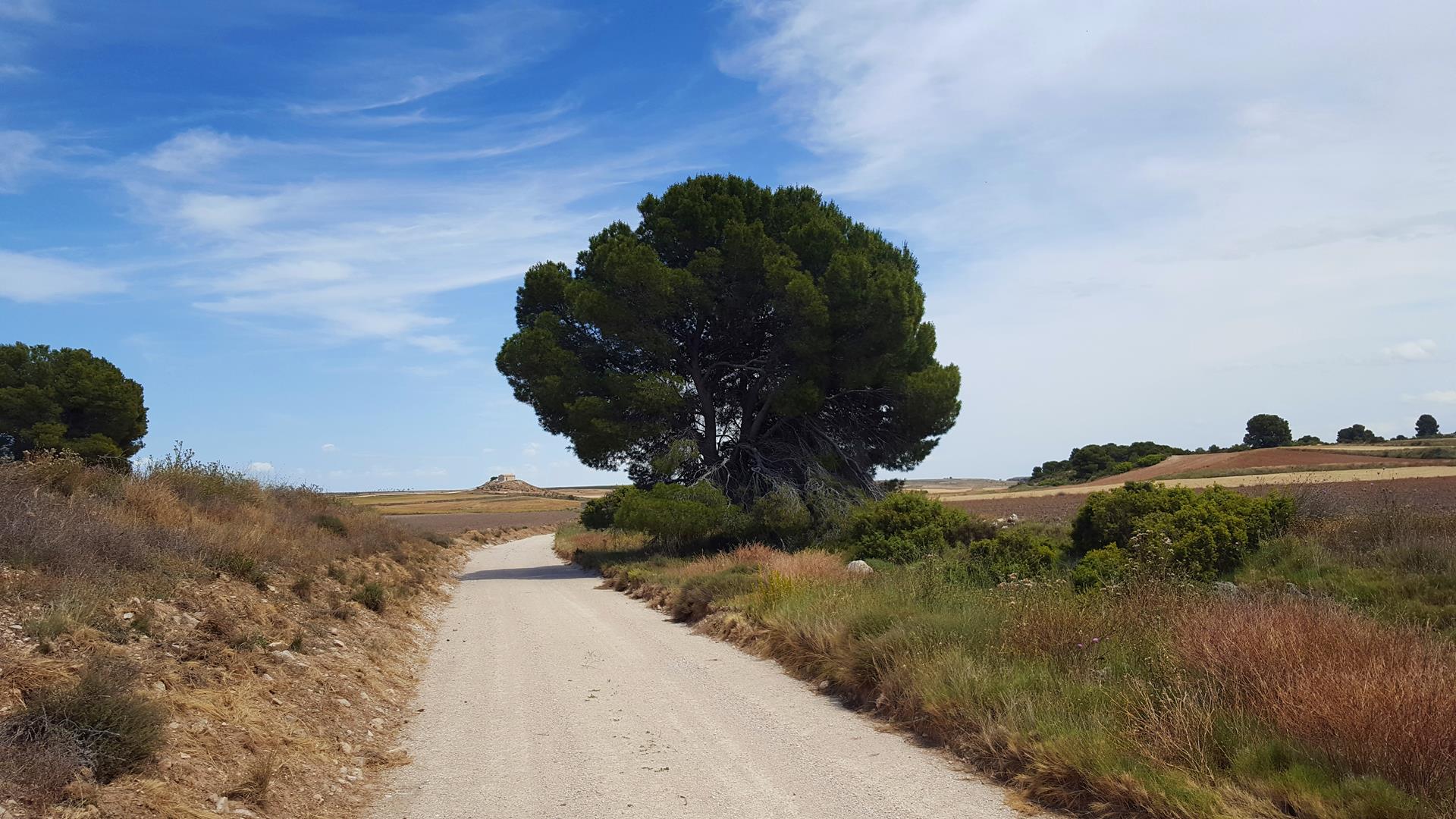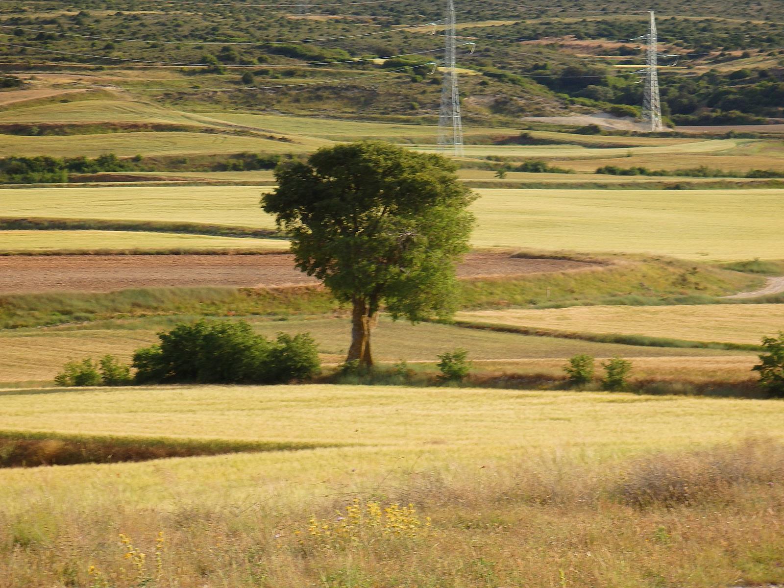 Durante el trayecto, podemos ver unos cuantos postes eólicos y árboles aislados en medio de campos de cereal. Hay uno concretamente que destaca de forma singular y que parece ser un litonero, o celtis australis, cuyo fruto, el litón, es comestible. Es bonito. Caminamos animados y a buen ritmo.