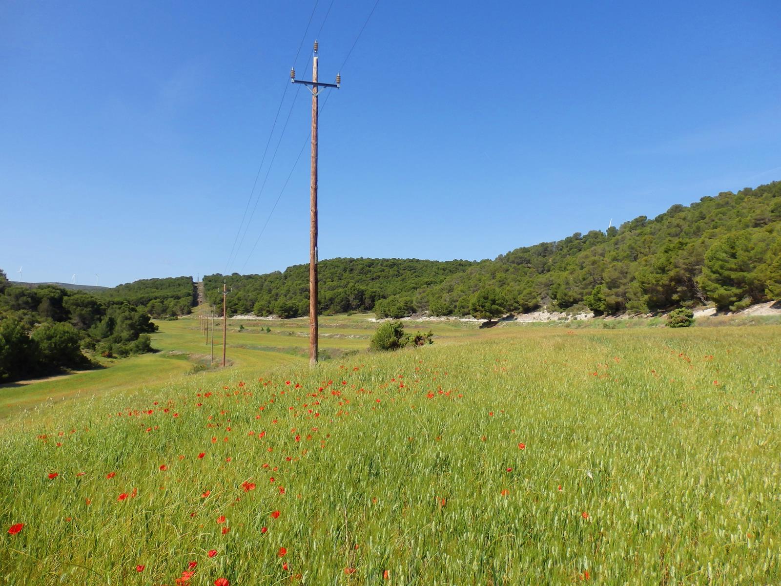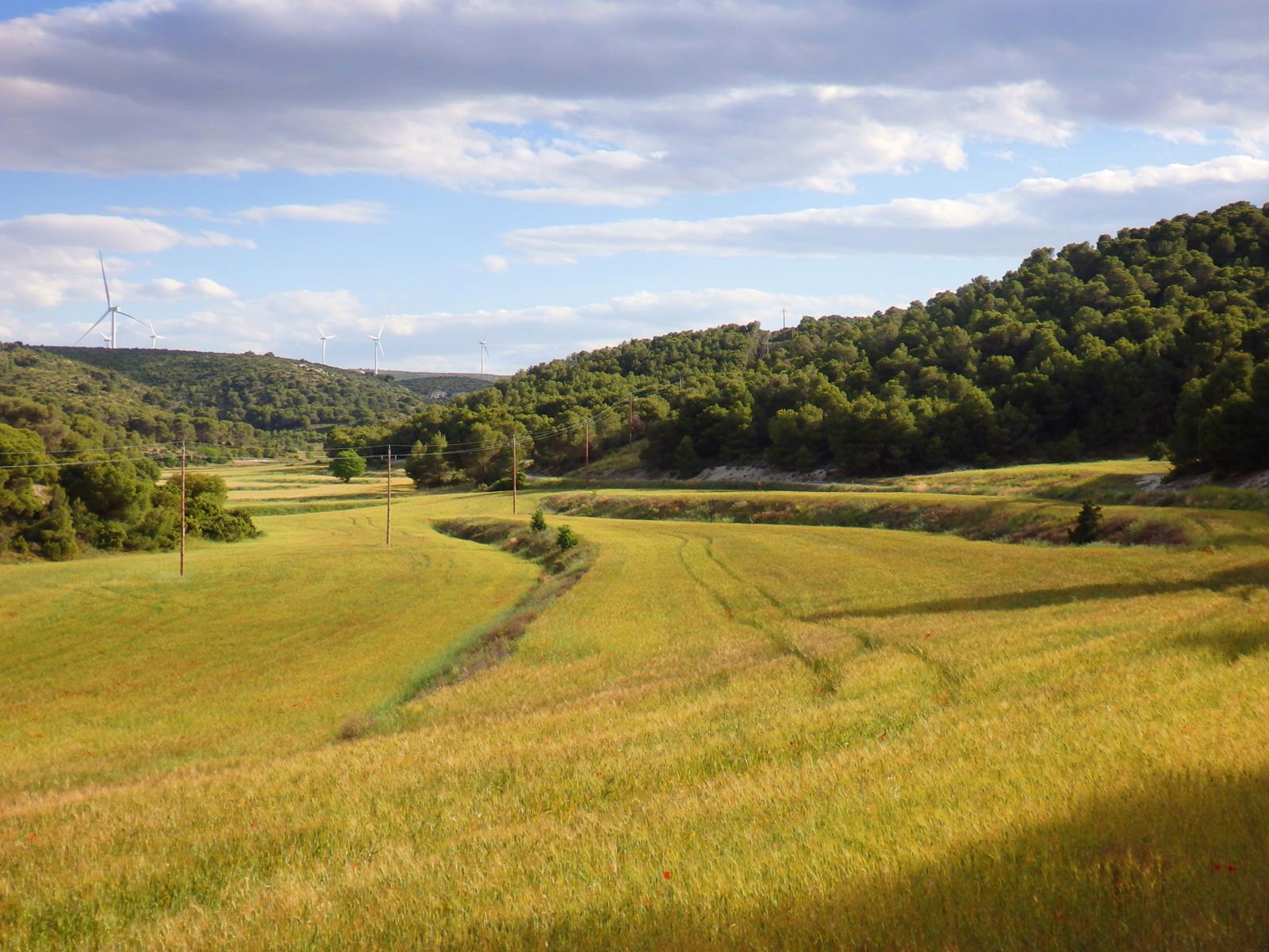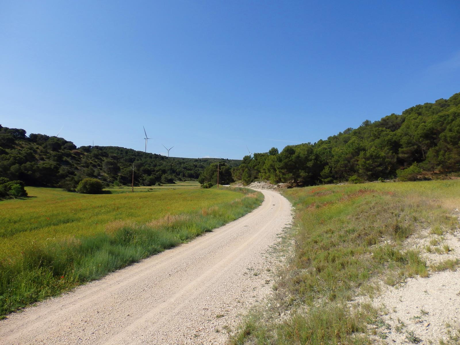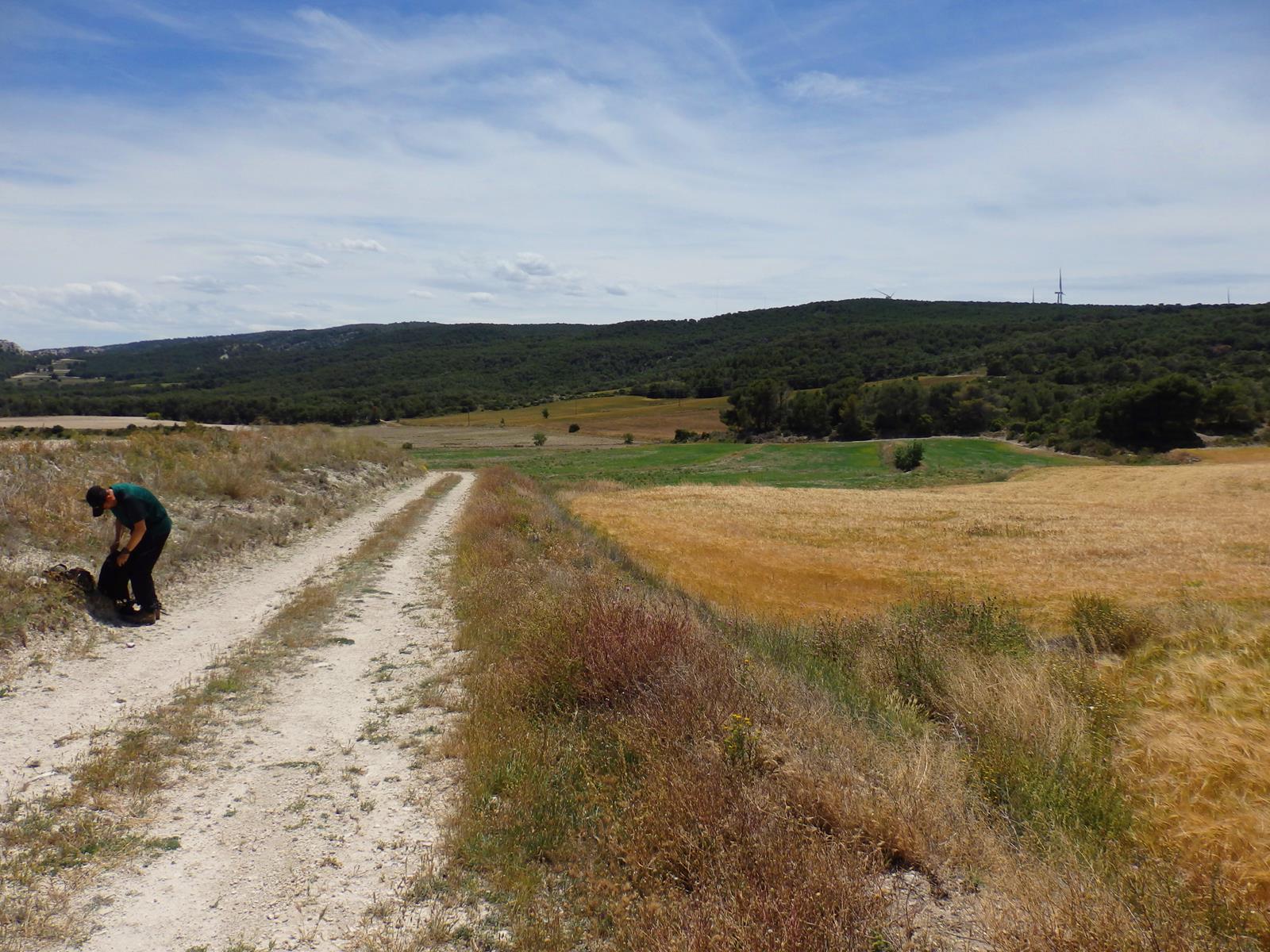 Durante el trayecto, podemos ver unos cuantos postes eólicos y árboles aislados en medio de campos de cereal. Hay uno concretamente que destaca de forma singular y que parece ser un litonero, o celtis australis, cuyo fruto, el litón, es comestible. Es bonito. Caminamos animados y a buen ritmo.