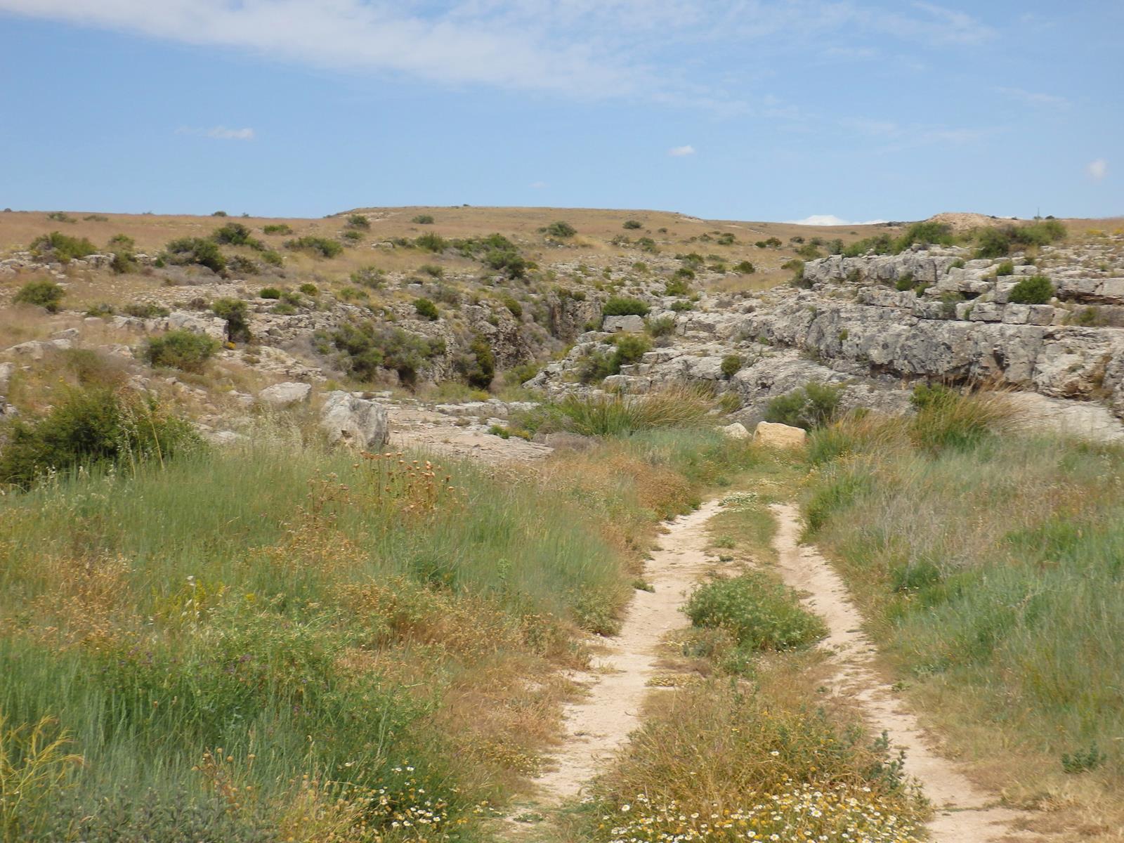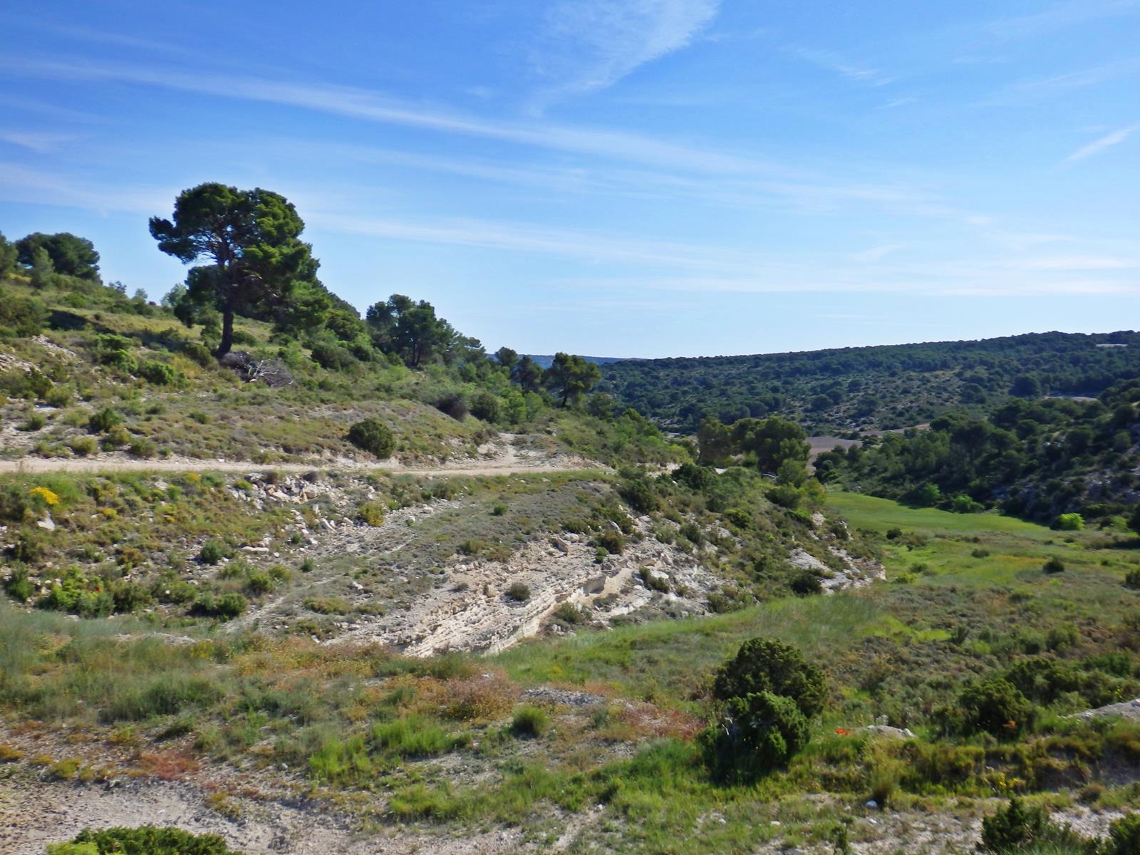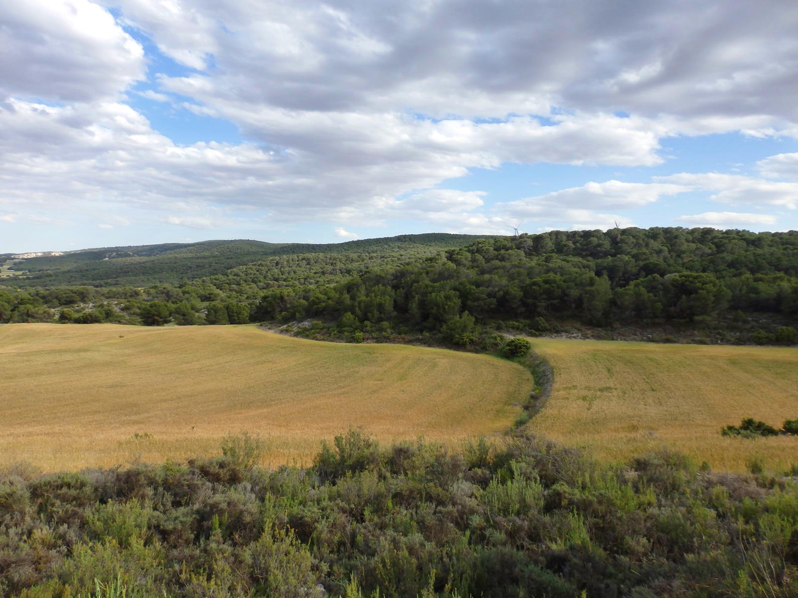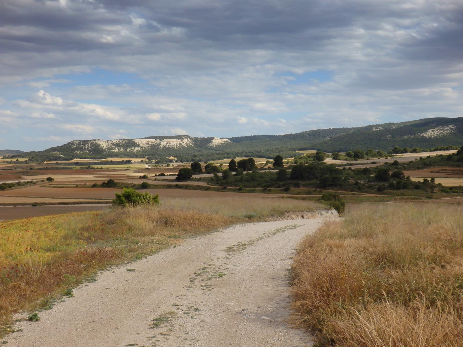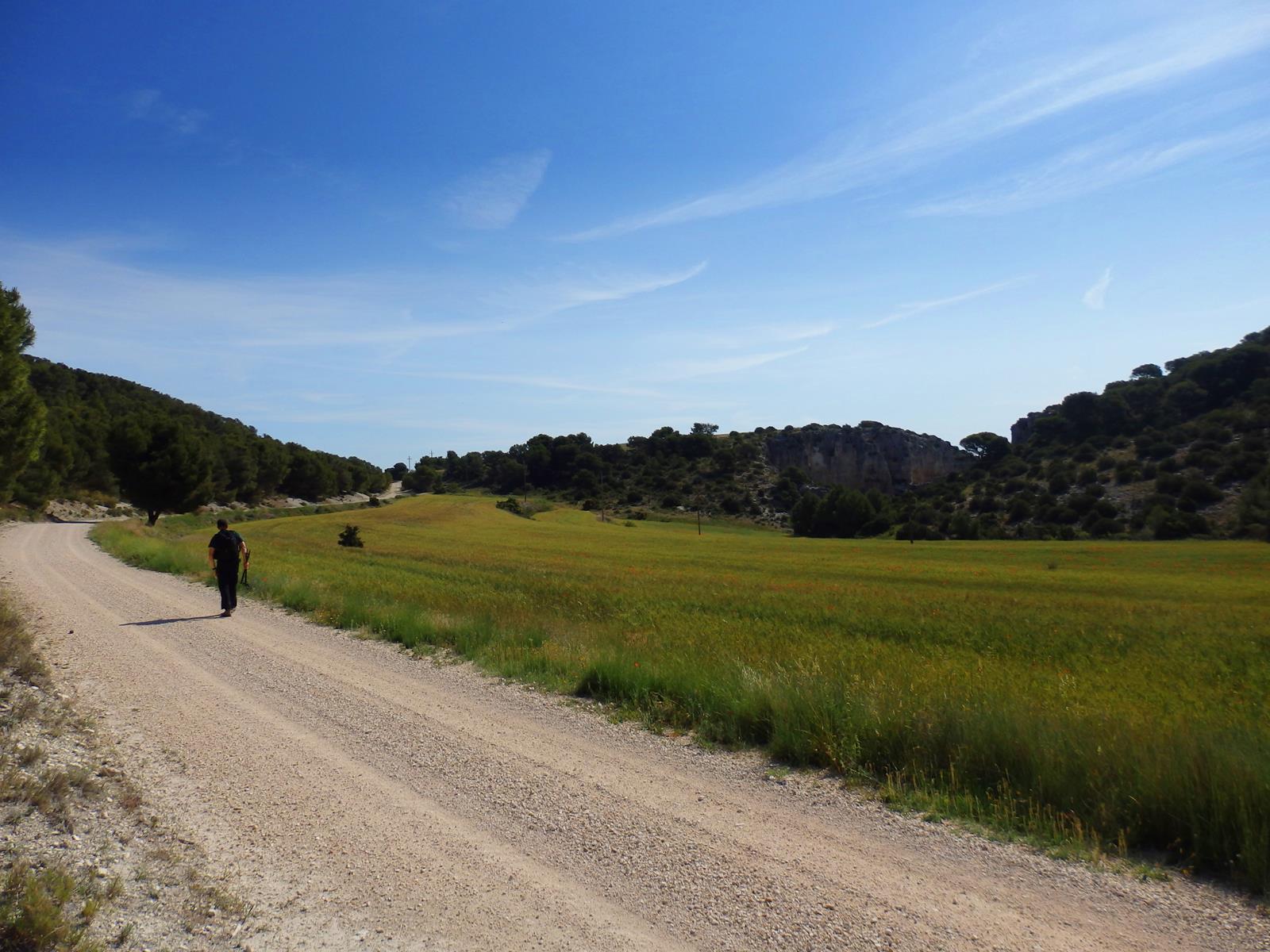 La senda va descendiendo hacia un valle en el que se alternan los campos con las zonas de pinar. También empieza a verse alguna alteración del relieve formada principalmente por rocas sedimentarias que emergen del suelo con su característico color grisáceo.