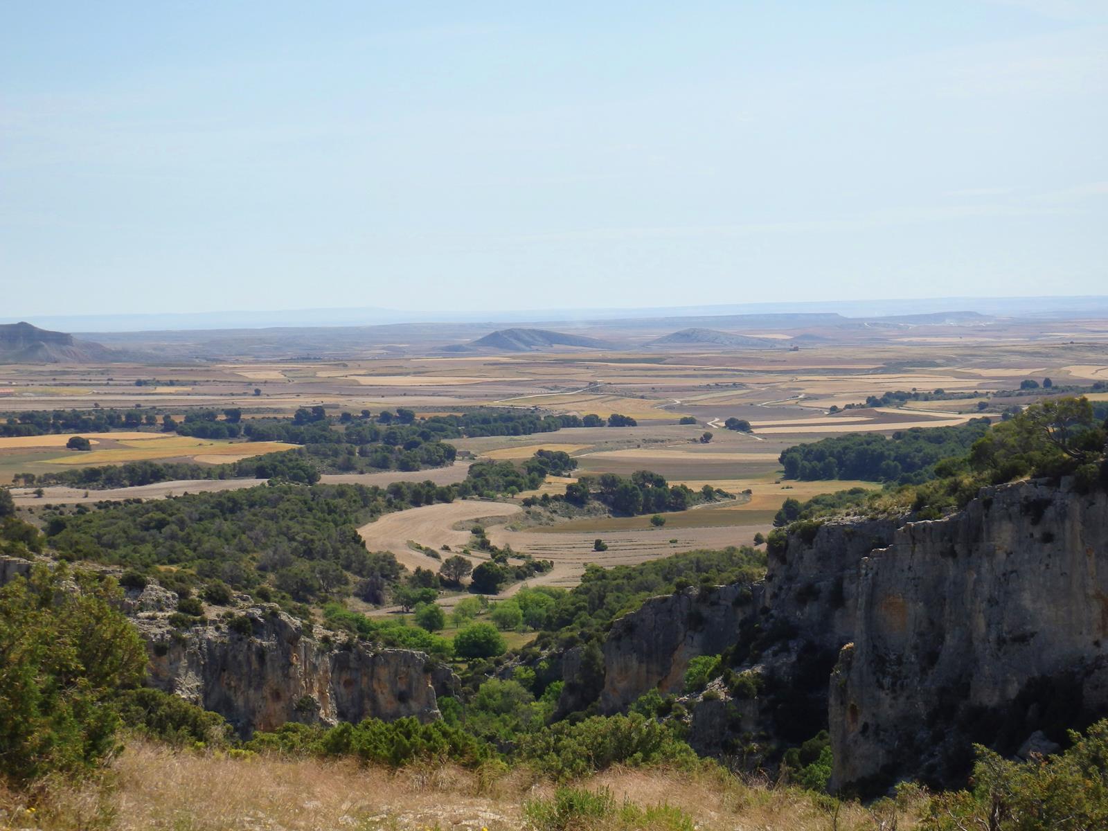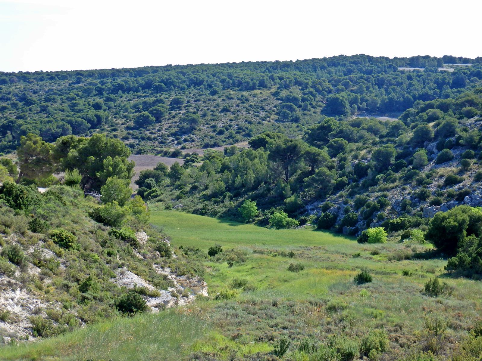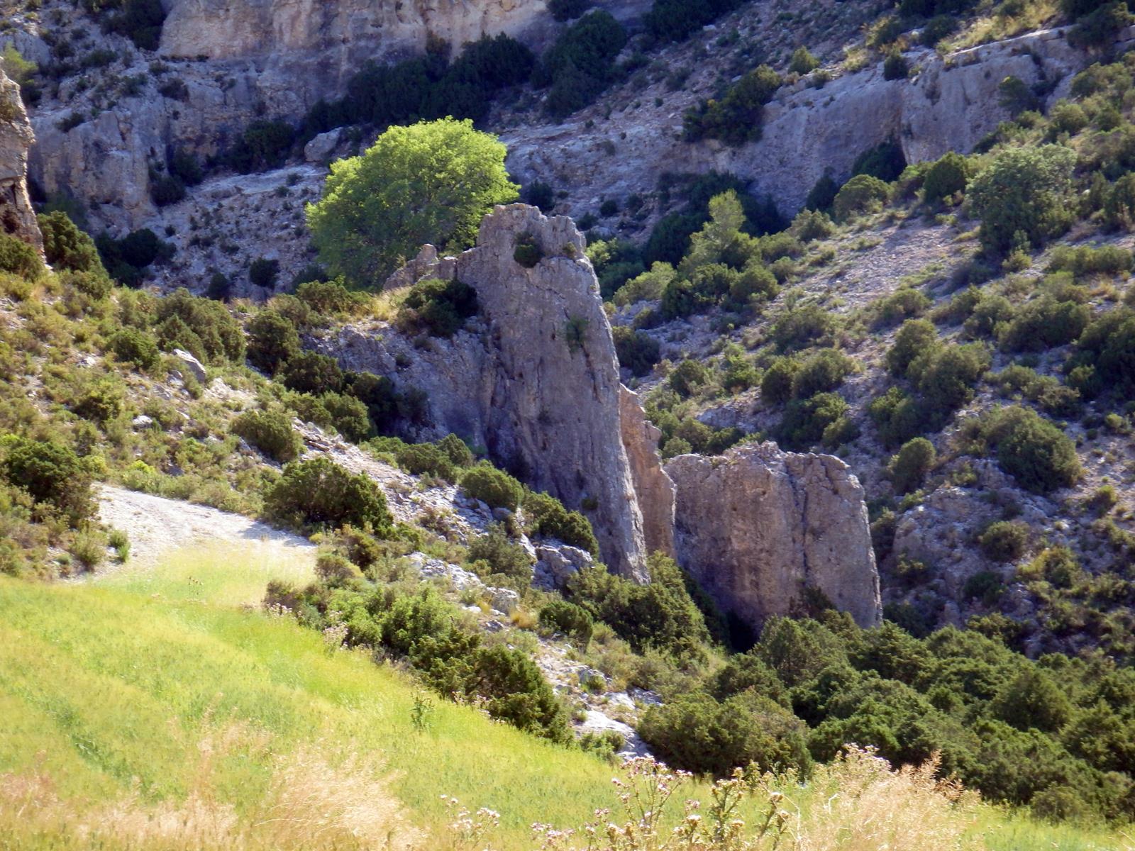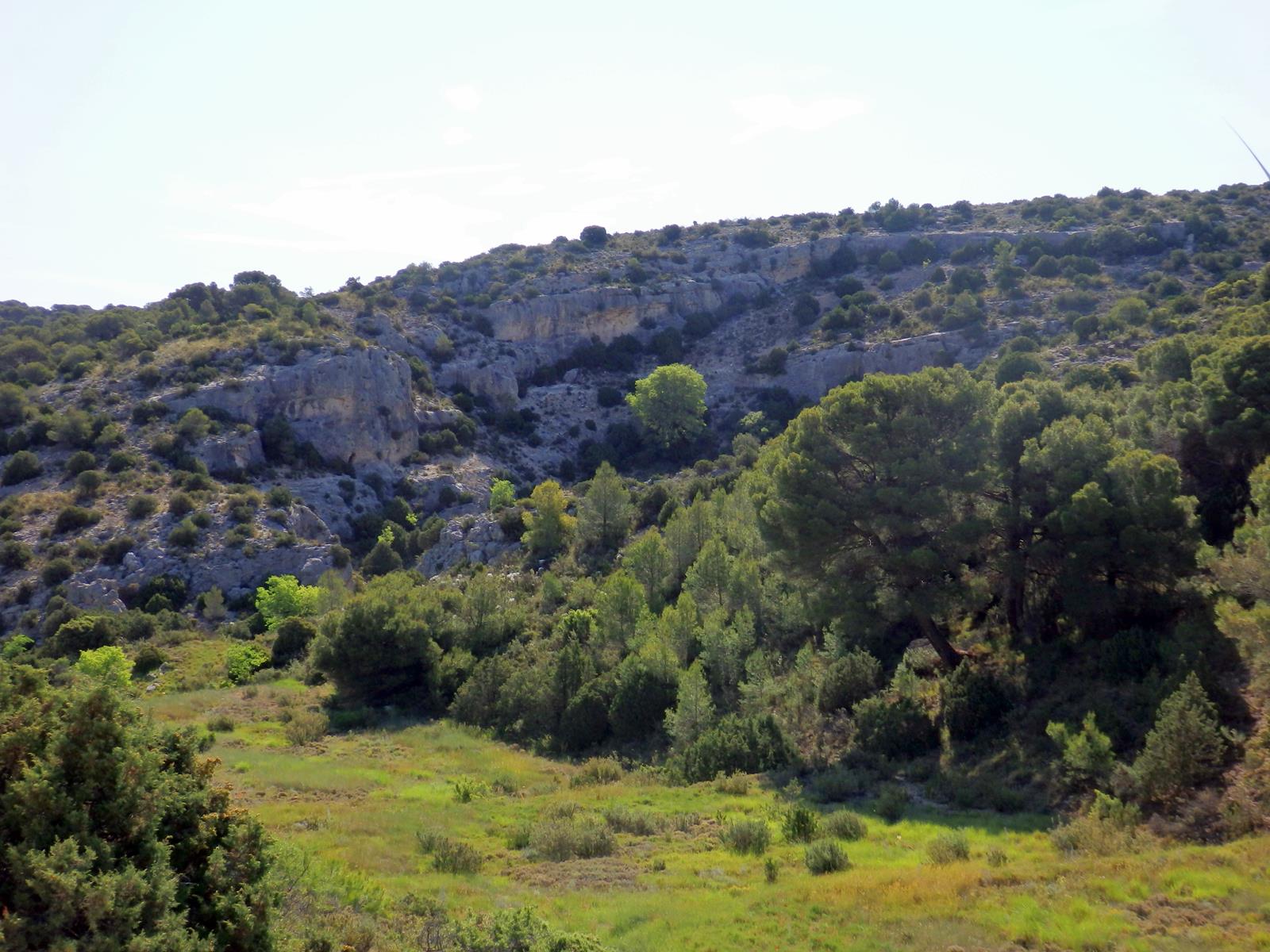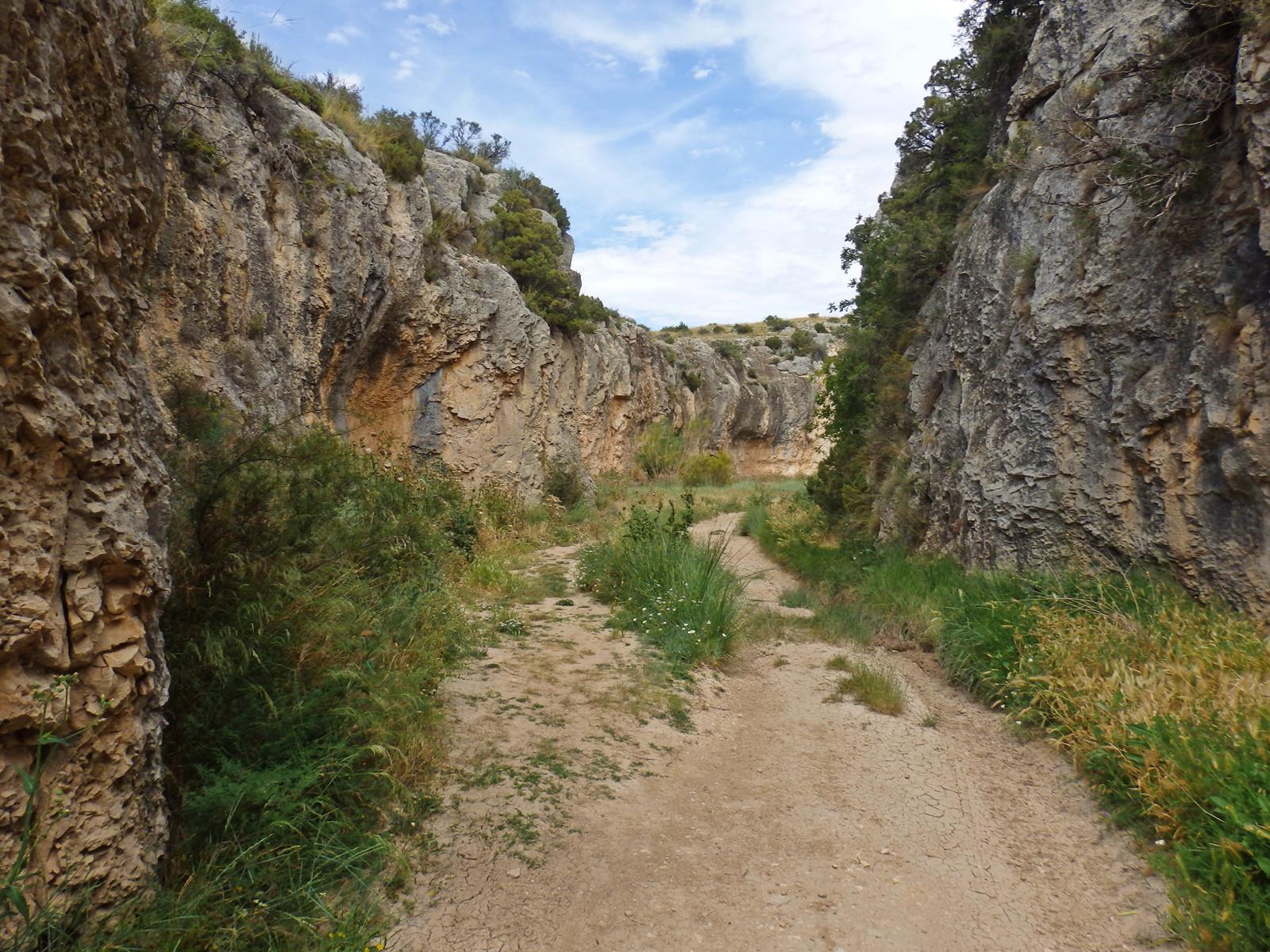 El camino gana altura y se sale a la pista que viene de Fuendetodos y que llega a la Puebla de Albortón. El paisaje cambia de golpe. Parece otro mundo. Es la Sierra Gorda, y hay pinares alternándose con campos de cultivo, pero nada que ver con la riqueza medioambiental que acabamos de dejar atrás. Realmente es un microclima milagroso. Volvemos la vista, y nos despedimos de esa mancha verde y de las rocas grises que tan buena sensación nos han dejado. Verdaderamente hace honor a su nombre rememorando los barrancos del Prepirineo.
