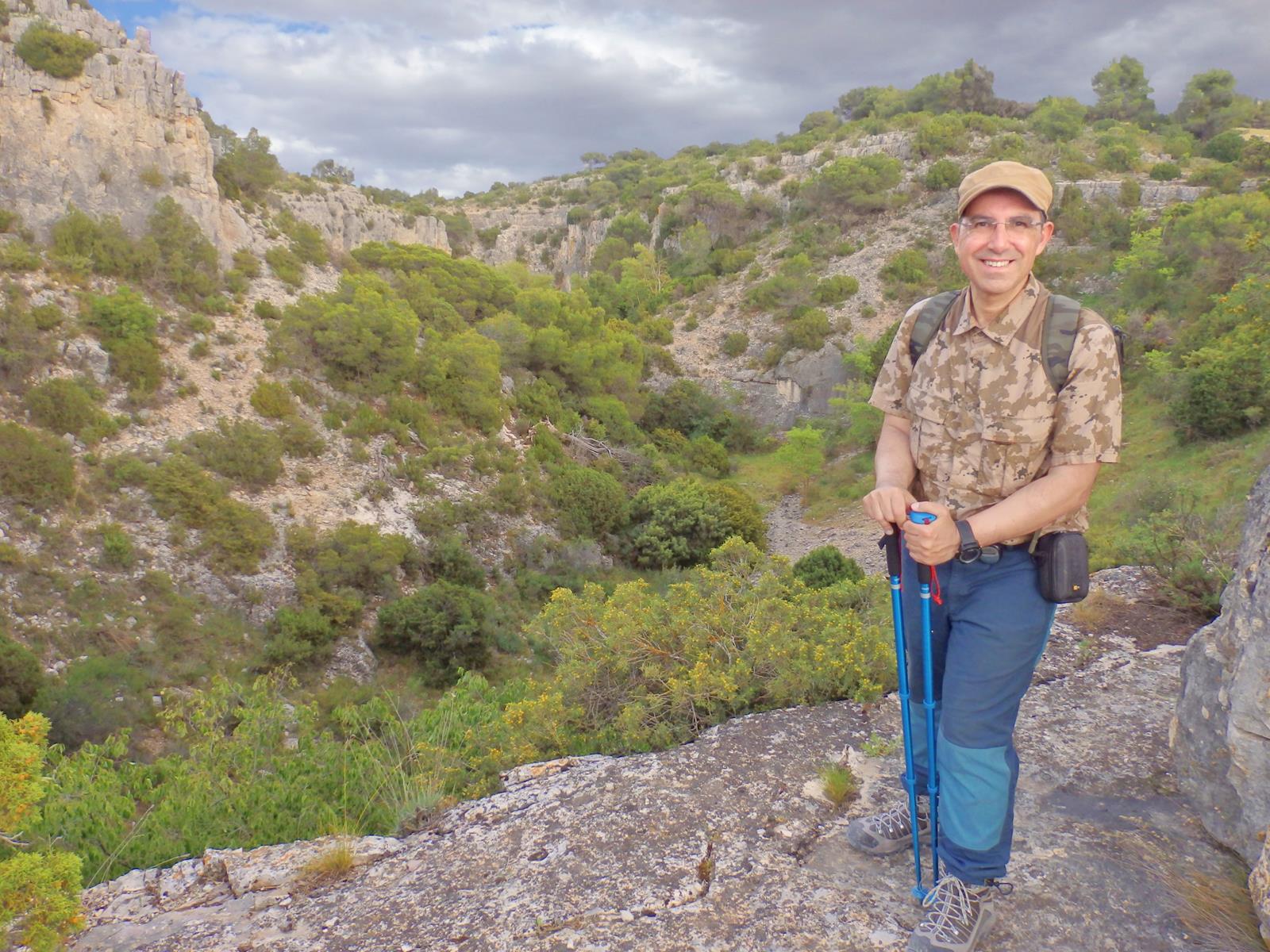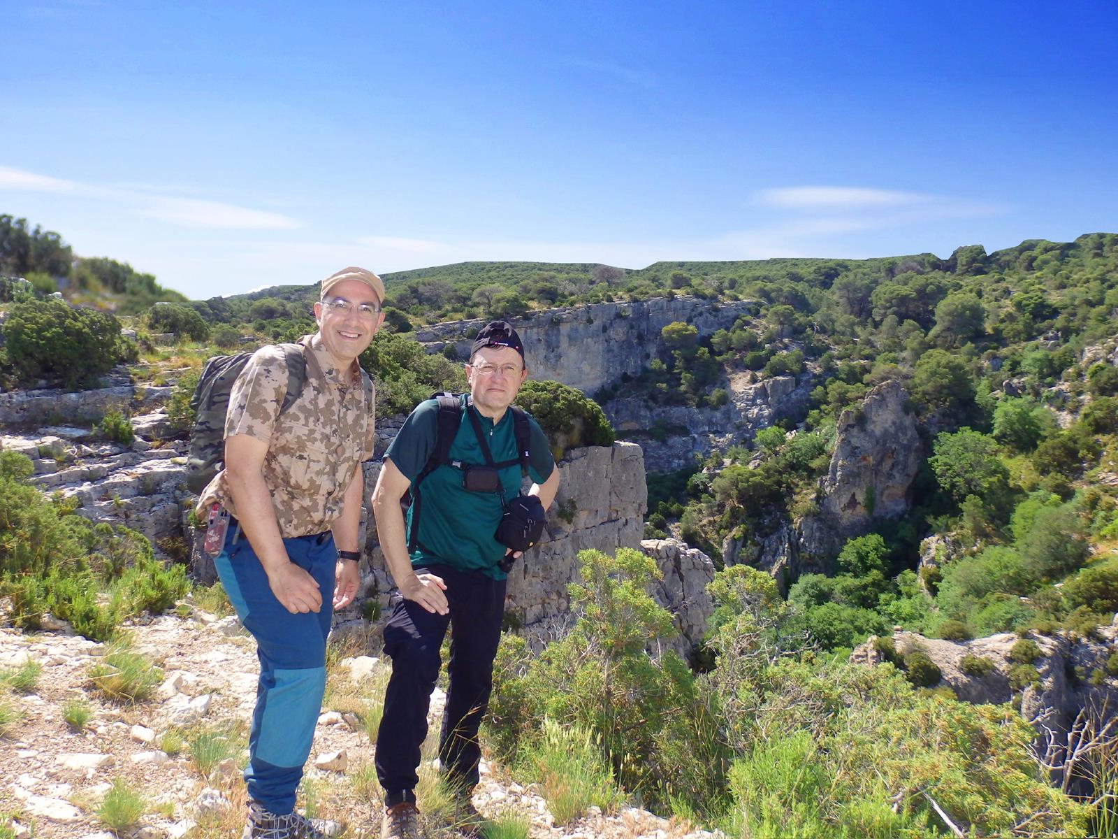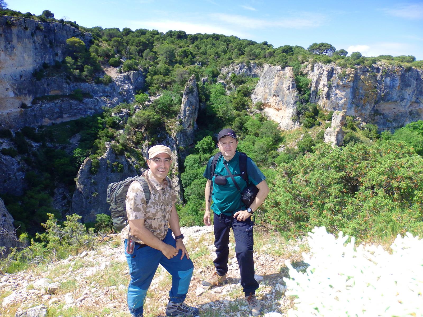 Abajo, entre los relieves calcáreos, las manchas de vegetación se alternan con los barrancos y desfiladeros. Lo que estamos haciendo es caminar por la parte alta del barranco, por la parte izquierda. Es como ver una trinchera desde lo alto, y en su fondo, un vergel de vegetación. Como no podía ser menos, un buitre solitario sigue todos nuestros movimientos. No hay nadie. Solo nosotros. Es una maravilla disfrutar del monte así. Nos hacemos unas cuantas fotos. La ocasión lo merece. No hace casi aire, tan solo una brisa agradable. Mi pequeño trípode, no se moverá demasiado, pero tampoco hay demasiados sitios donde apoyarlo. Aún con todo, conseguimos algunas instantáneas.
