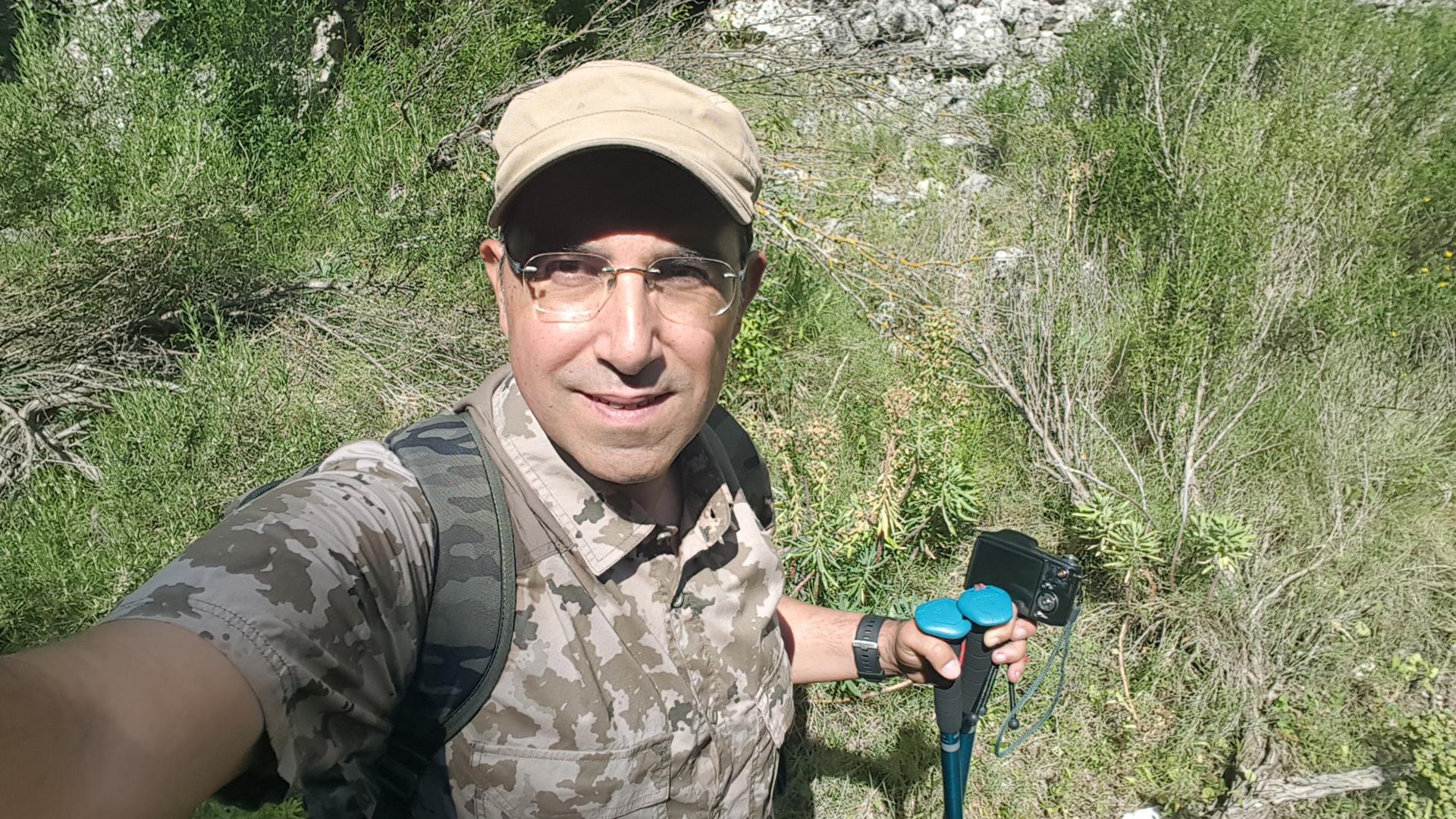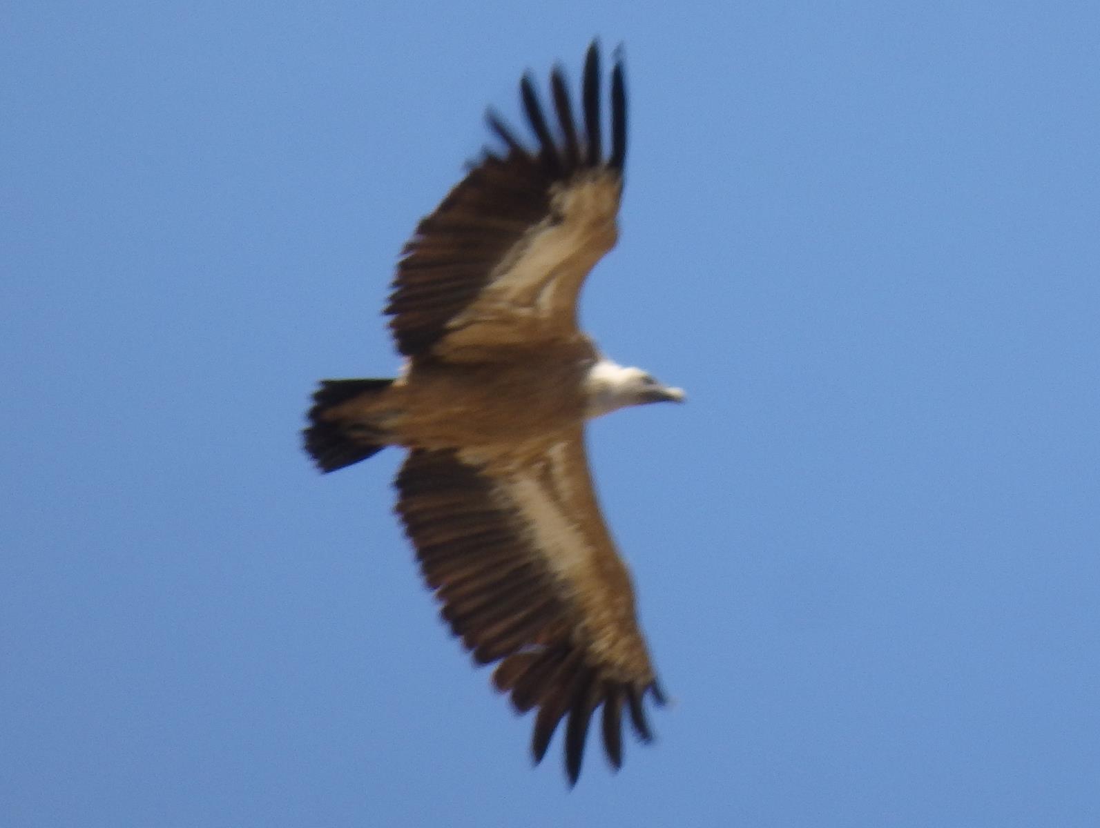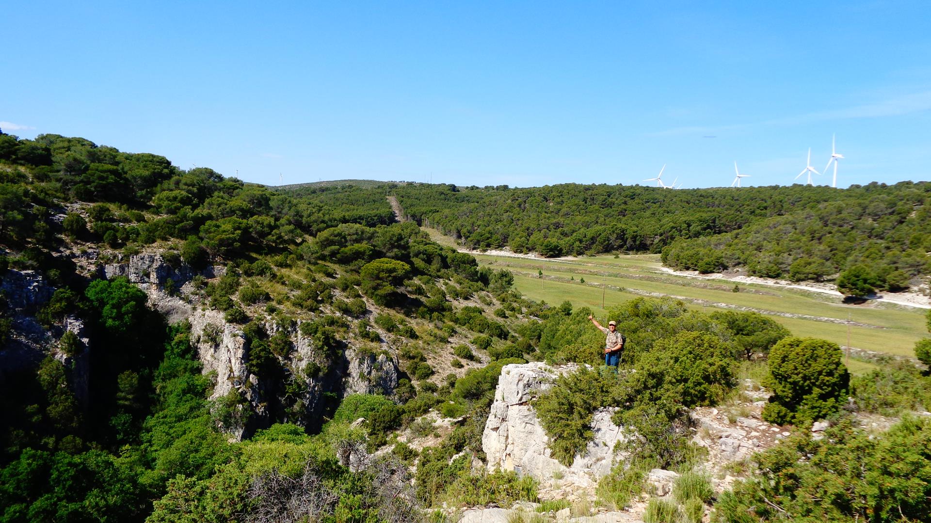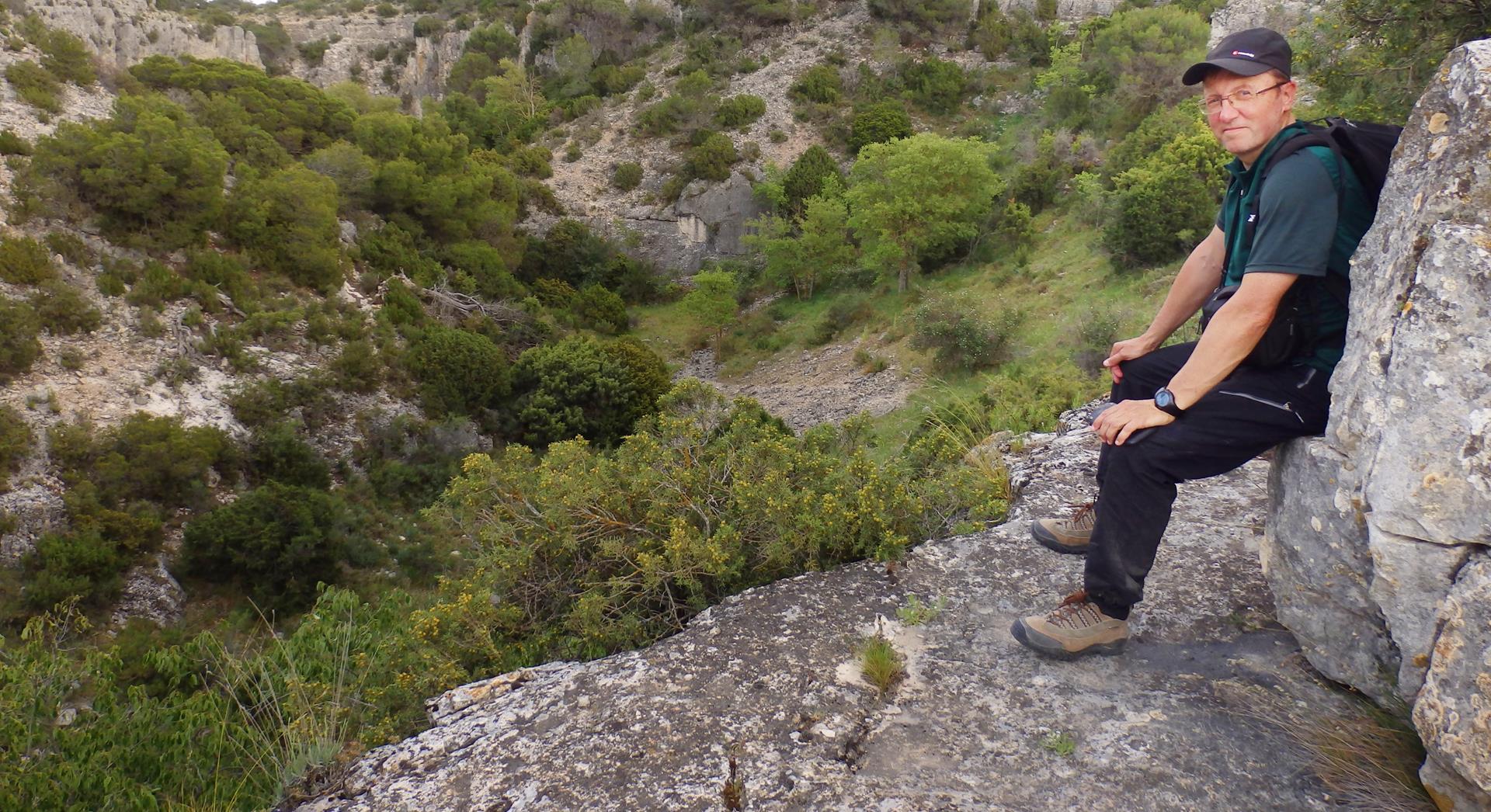 Abajo, entre los relieves calcáreos, las manchas de vegetación se alternan con los barrancos y desfiladeros. Lo que estamos haciendo es caminar por la parte alta del barranco, por la parte izquierda. Es como ver una trinchera desde lo alto, y en su fondo, un vergel de vegetación. Como no podía ser menos, un buitre solitario sigue todos nuestros movimientos. No hay nadie. Solo nosotros. Es una maravilla disfrutar del monte así. Nos hacemos unas cuantas fotos. La ocasión lo merece. No hace casi aire, tan solo una brisa agradable. Mi pequeño trípode, no se moverá demasiado, pero tampoco hay demasiados sitios donde apoyarlo. Aún con todo, conseguimos algunas instantáneas.