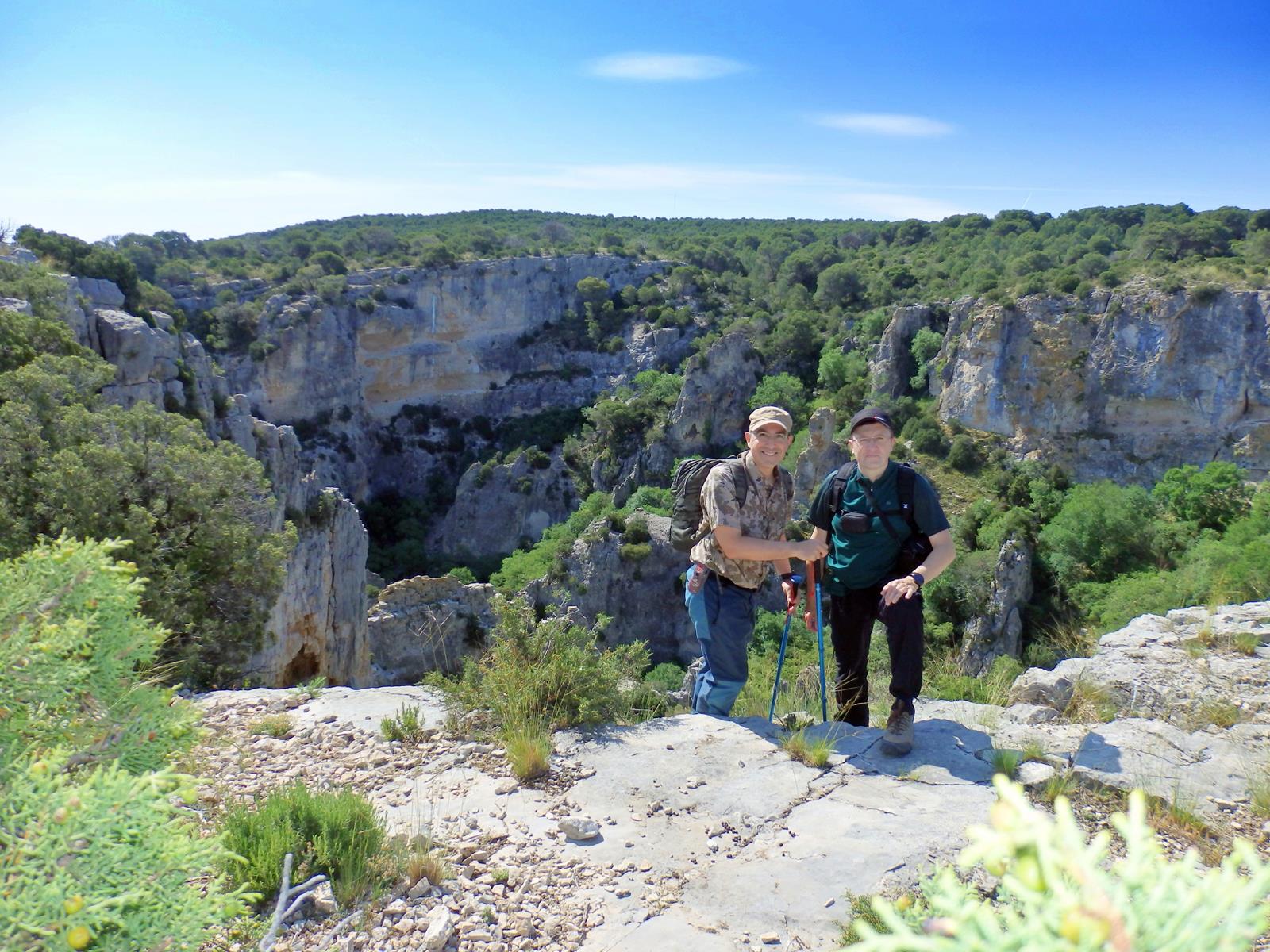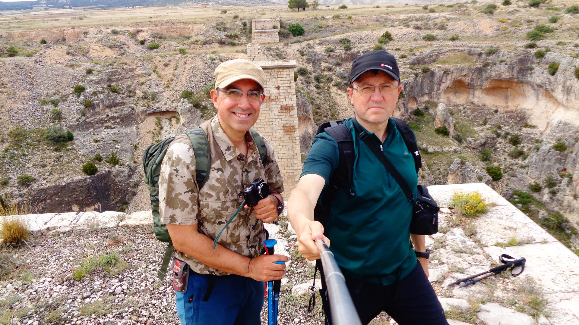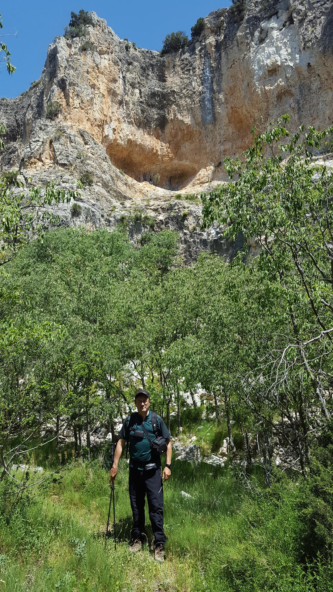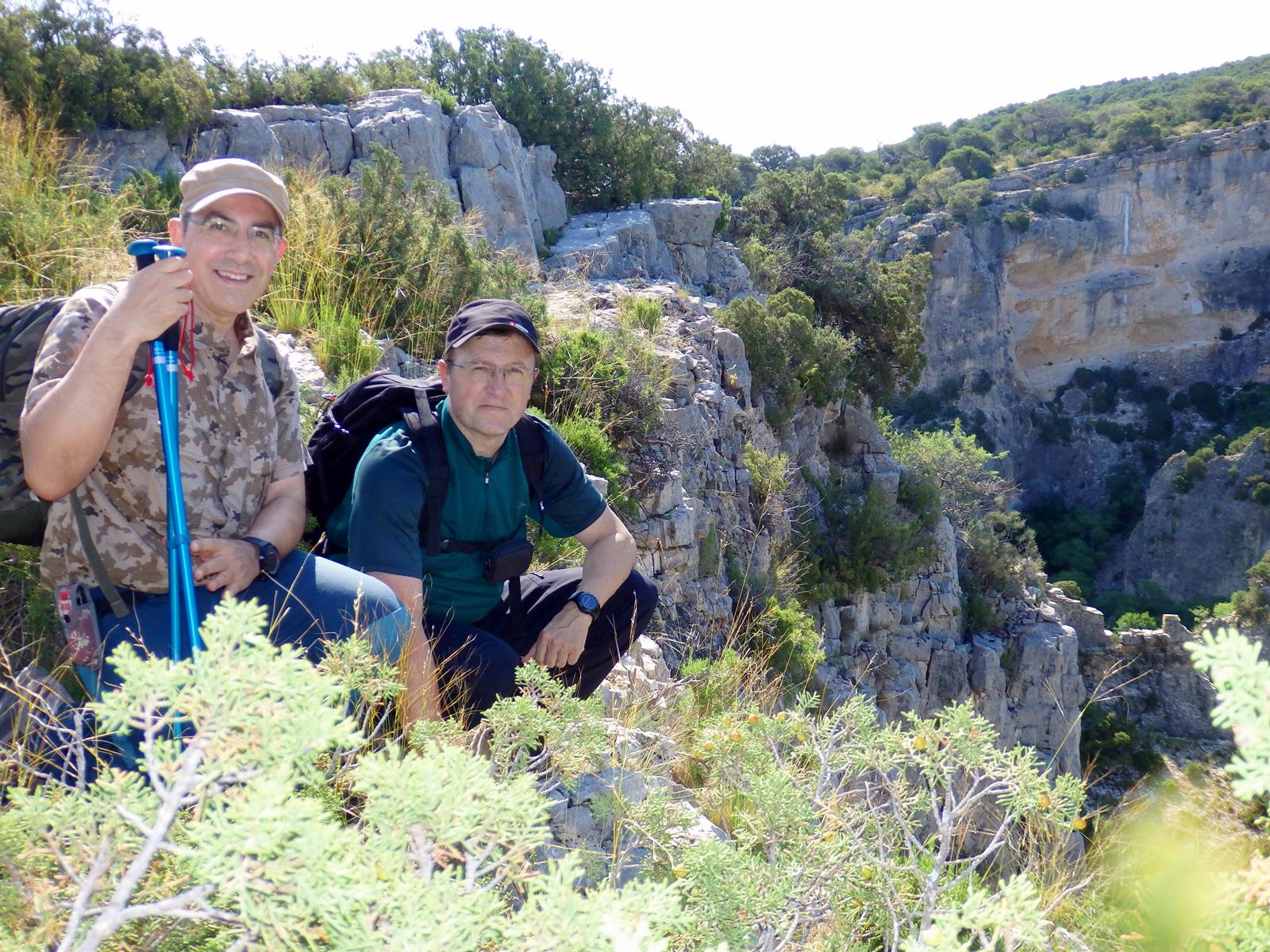 Las paredes de caliza a ambos lados del barranco son una constante. Hay rocas que sobresalen hacia el vacío, otras dibujan su perfil contra el cielo. En un momento determinado, Logro agarrar el trípode en algún árbol o arbusto para hacernos la foto de recuerdo y continuamos.