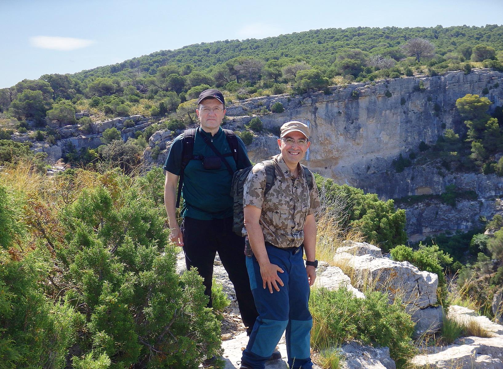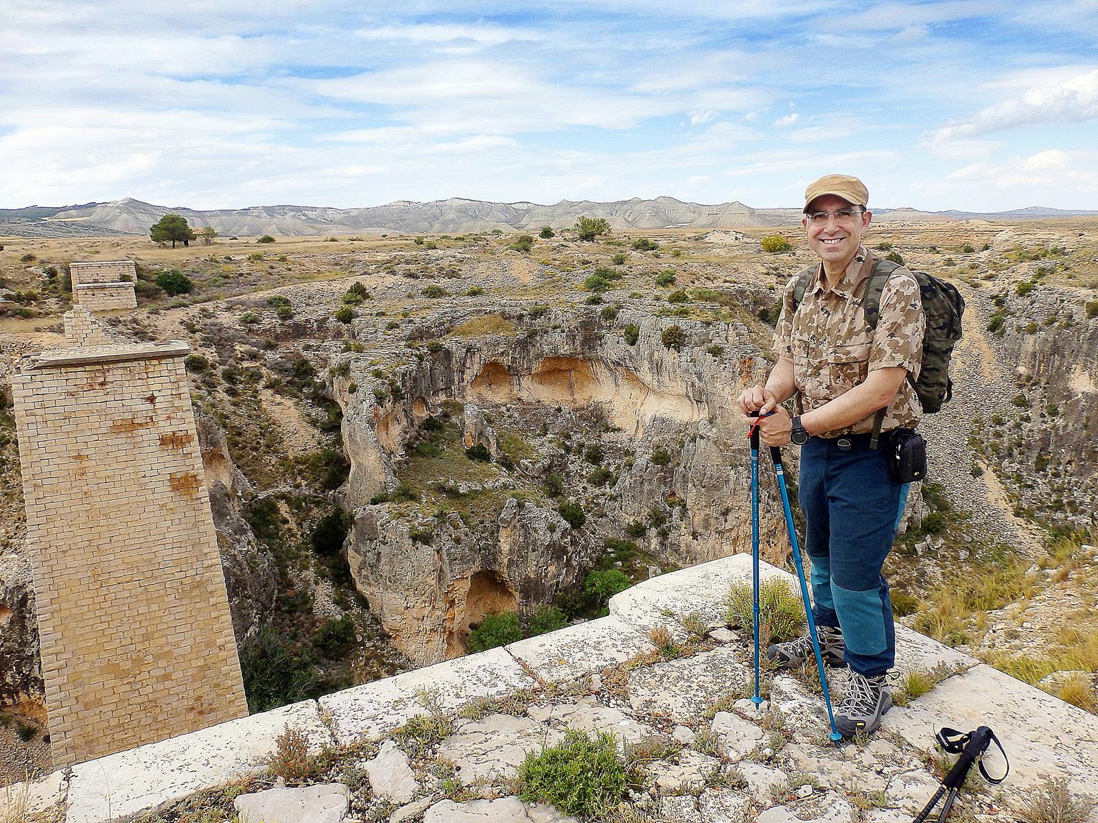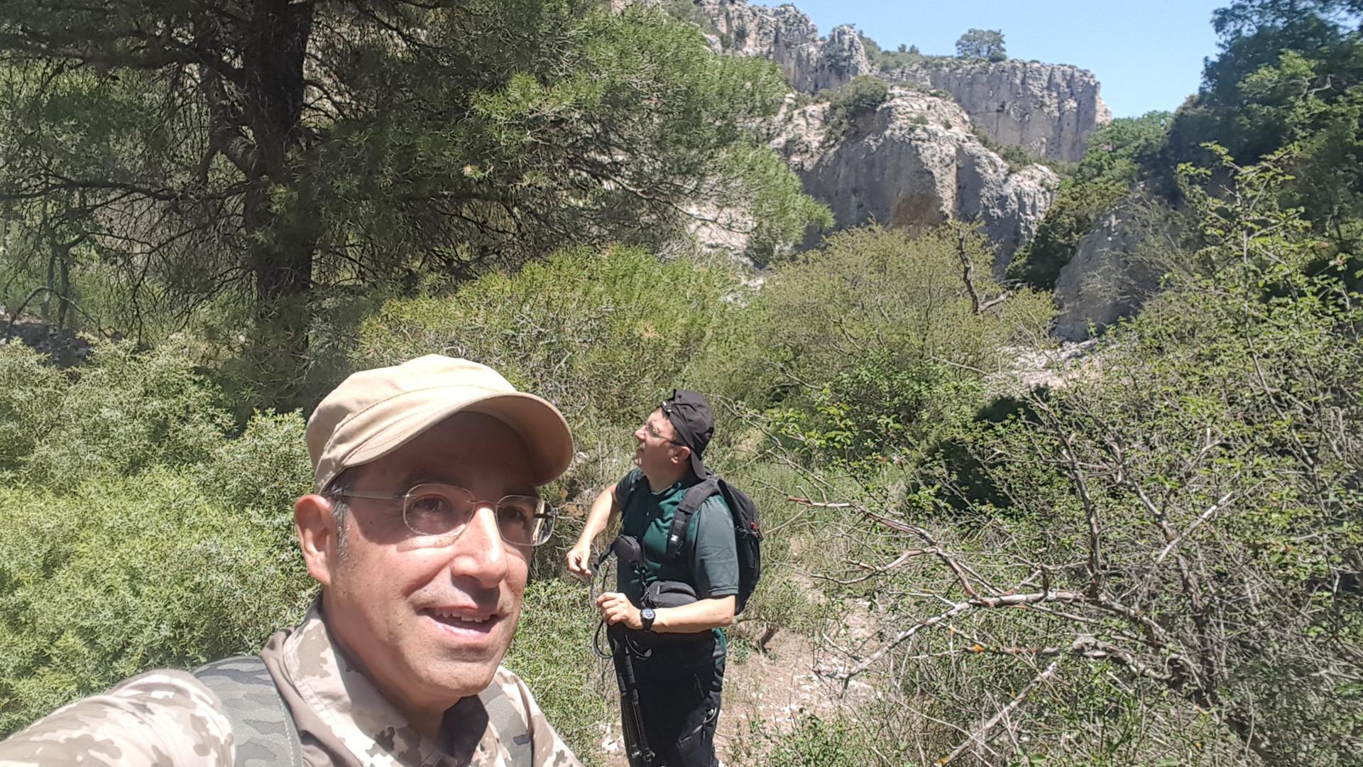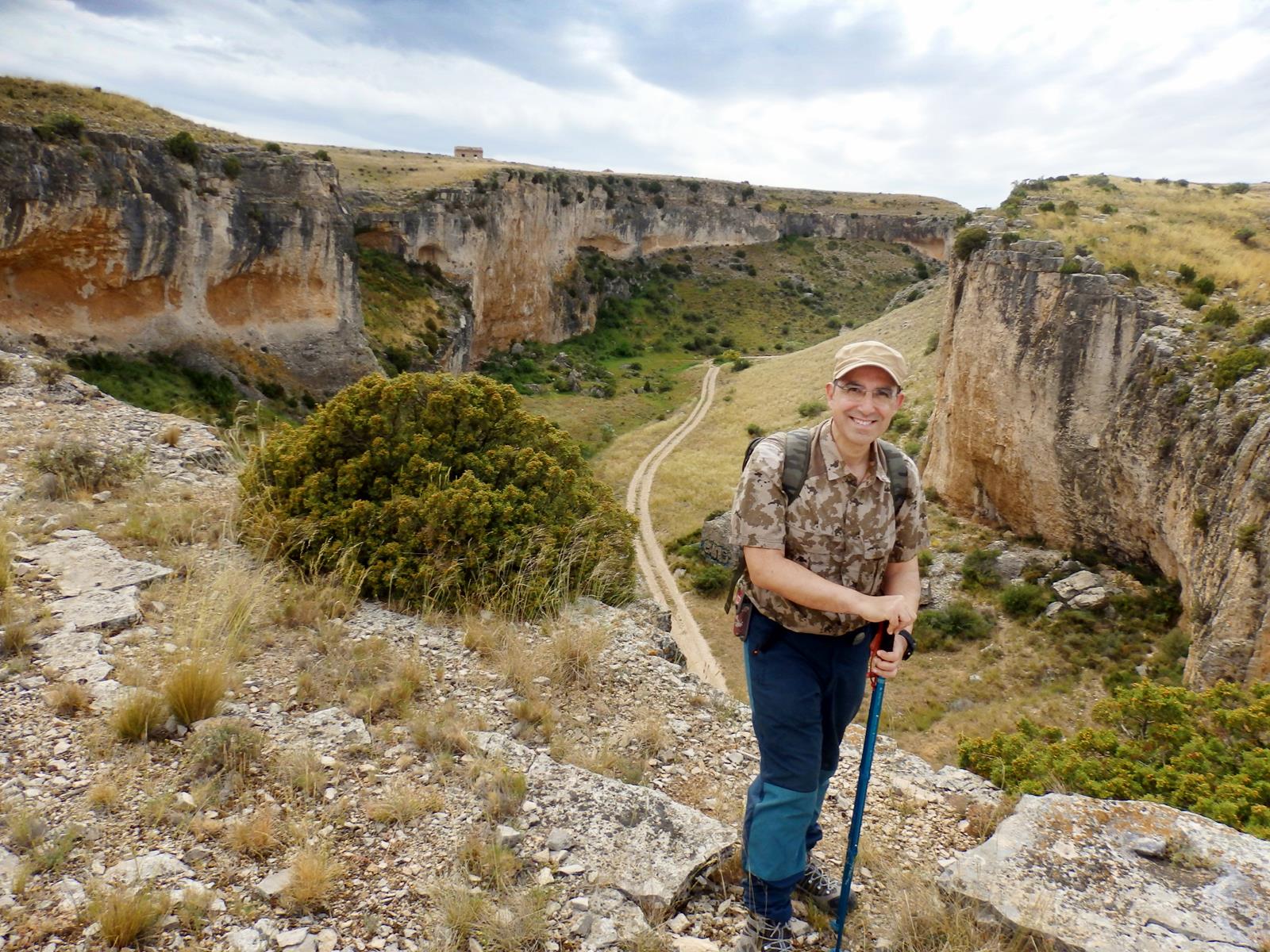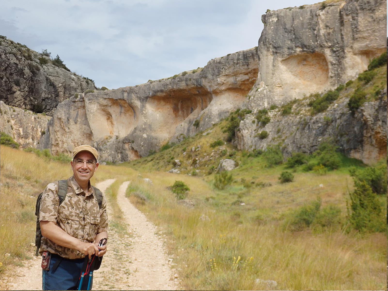 Las paredes de caliza a ambos lados del barranco son una constante. Hay rocas que sobresalen hacia el vacío, otras dibujan su perfil contra el cielo. En un momento determinado, Logro agarrar el trípode en algún árbol o arbusto para hacernos la foto de recuerdo y continuamos.