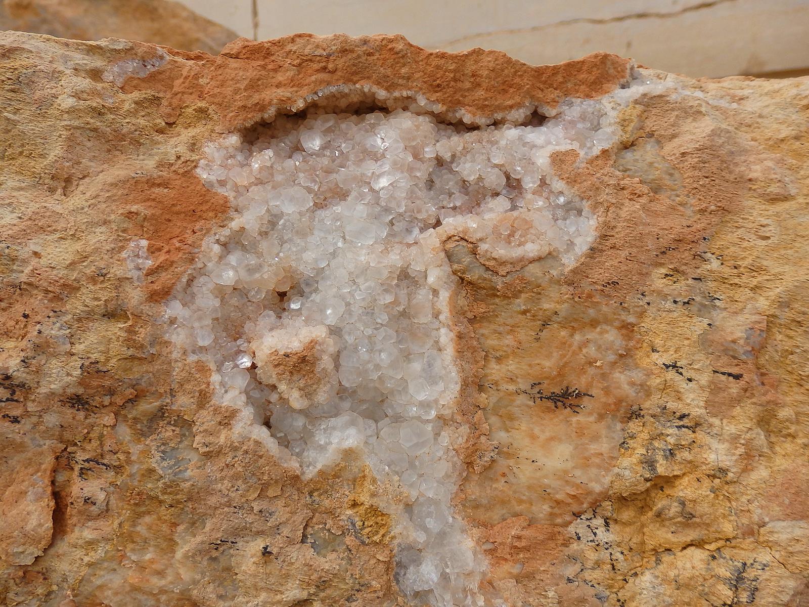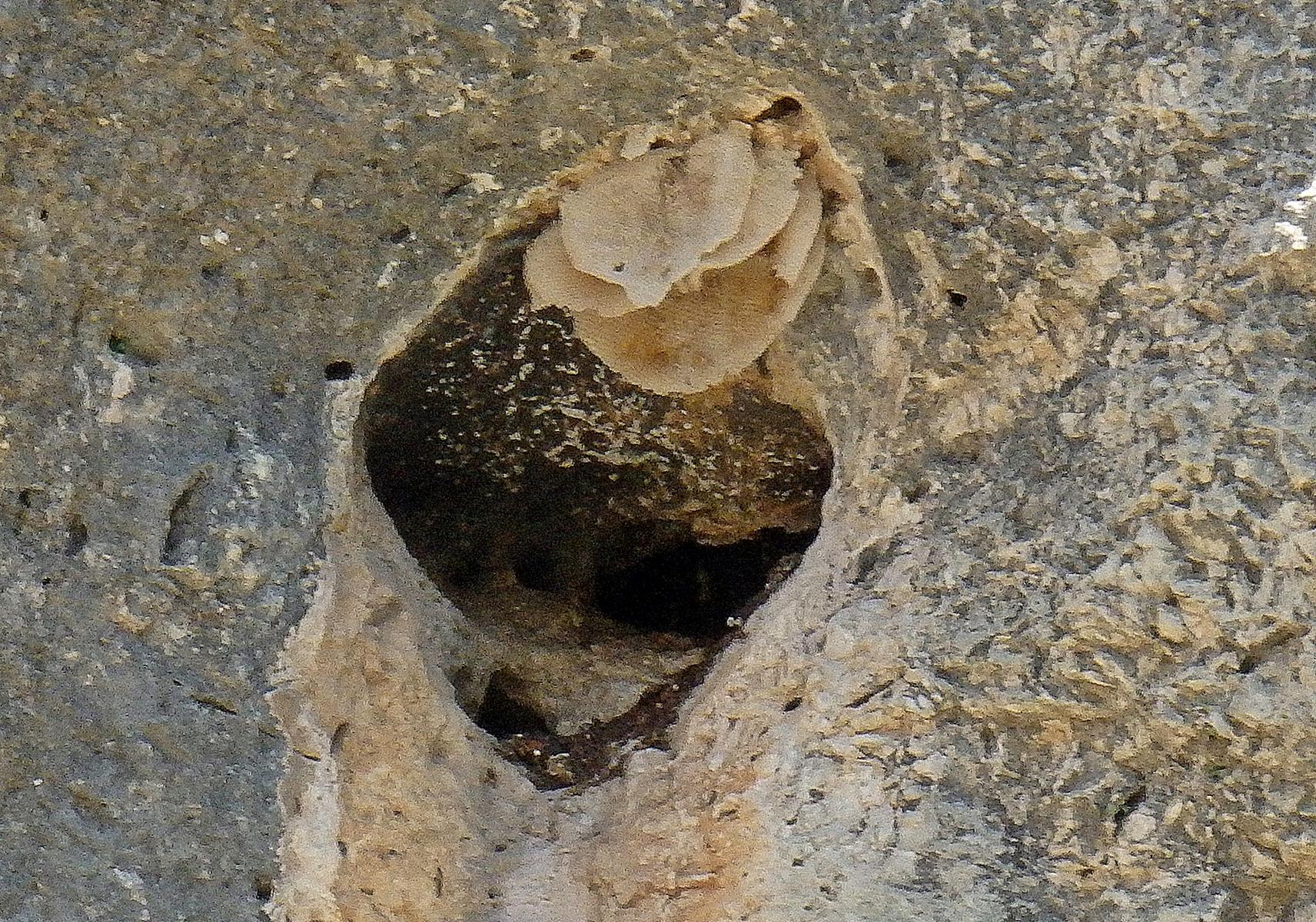 Al rato, Ángel hace que fije mi atención en una de las paredes que nos rodean. En la zona alta, se puede ver una oquedad y dentro de ella, colgando, lo que parecen unos panales de abejas. Efectivamente, con el zoom se pueden ver perfectamente. No sé si estarán repletos de miel, si el panal estará «habitado» es de suponer que sí, pero lo interesante es ver un panal tal y como está en la naturaleza, no preparado por el hombre, en esa cajas numeradas que se ven por el campo,