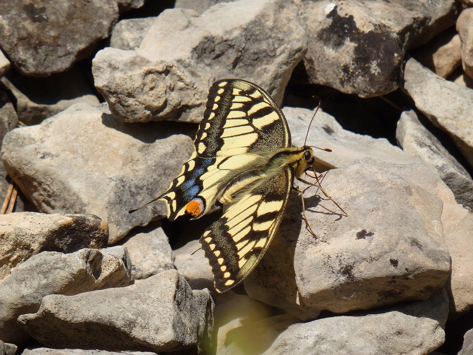 Tengo la oportunidad de fotografiar la mariposa rey, o Macaón, como también se la conoce. Es una mariposa que engaña a los depredadores con el dibujo de sus alas, lleva dibujados un par de vistosos ojos y unas antenas de pega. Pero a la que logro sacar le han mutilado parte de su camuflaje. Ha perdido parte de un ala, pero por otra parte, sea lo que fuere que le pasó, ha logrado sobrevivir.