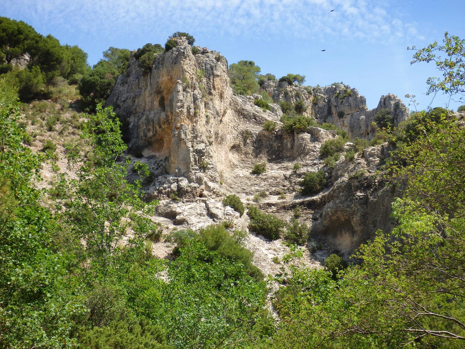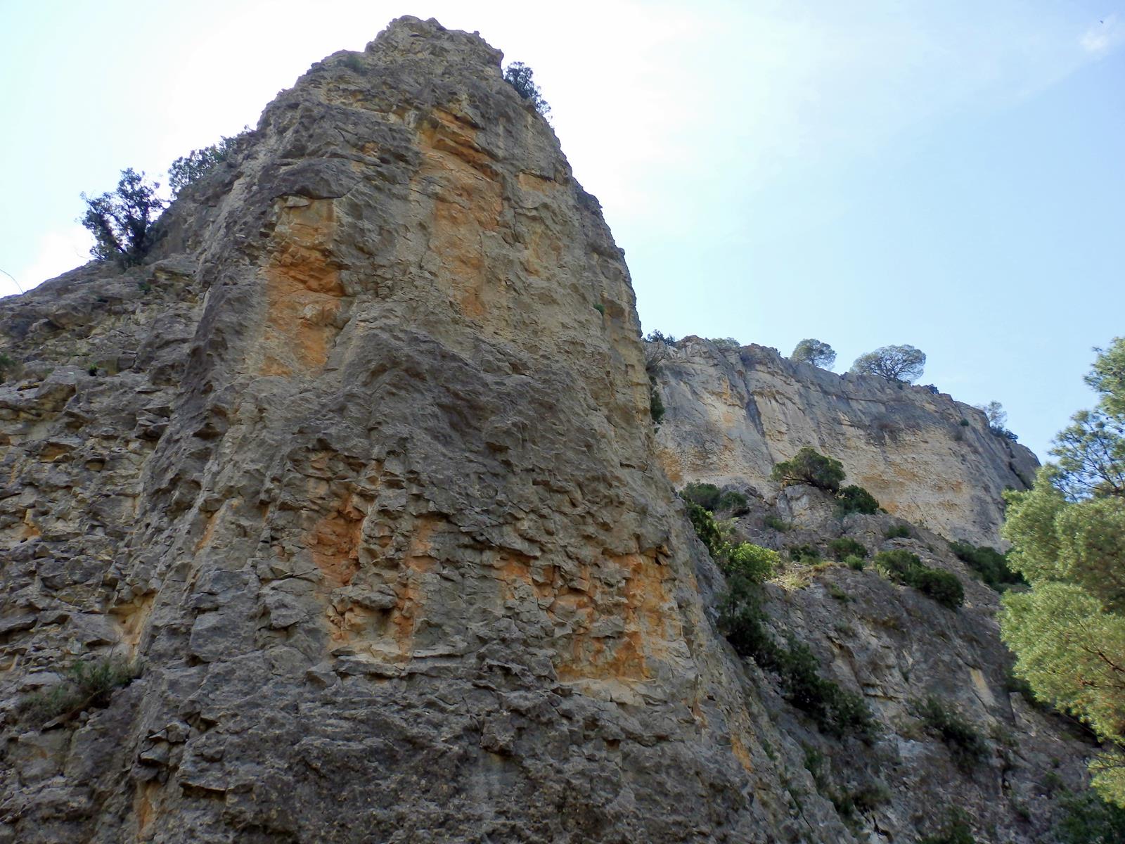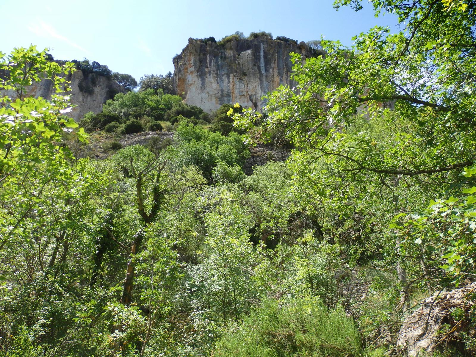 Calculamos que habremos recorrido unos 800 metros de ondulante senda, siguiendo los recovecos del barranco, cuando llegamos a una pared más o menos vertical de unos 5 ó 6 metros de altura, que está medio tapada por la vegetación y que nos cierra el paso. Es el final. Es un callejón sin salida. Ya no se puede continuar. A no ser que queramos trepar. Además queremos recorrer la otra mitad de la foz que nos falta. Damos media vuelta y volvemos por donde hemos venido.