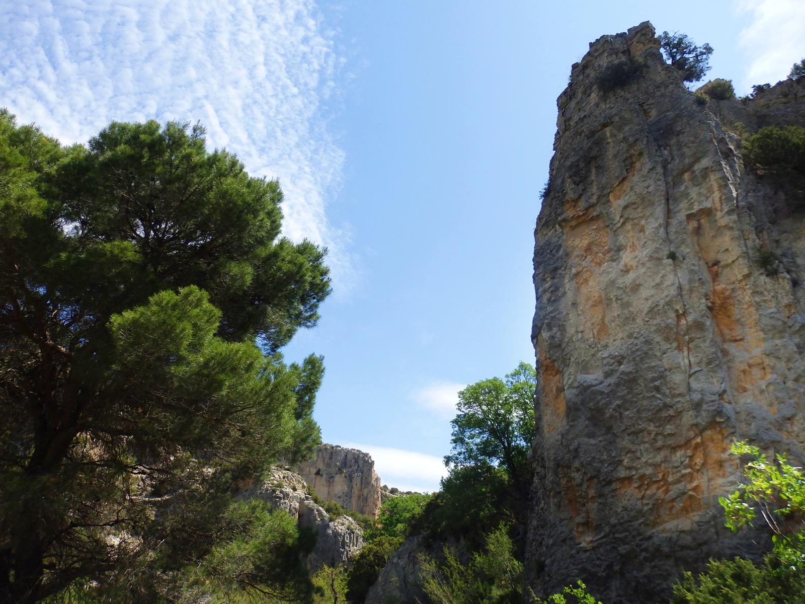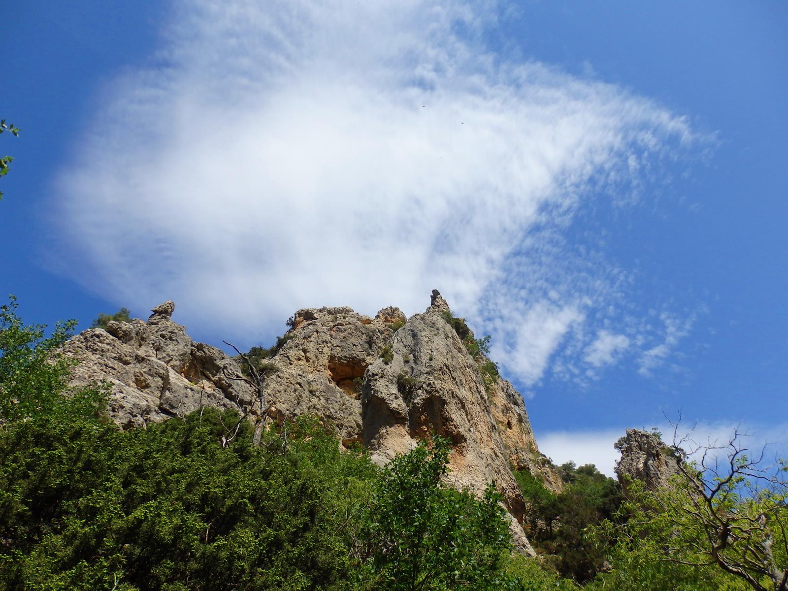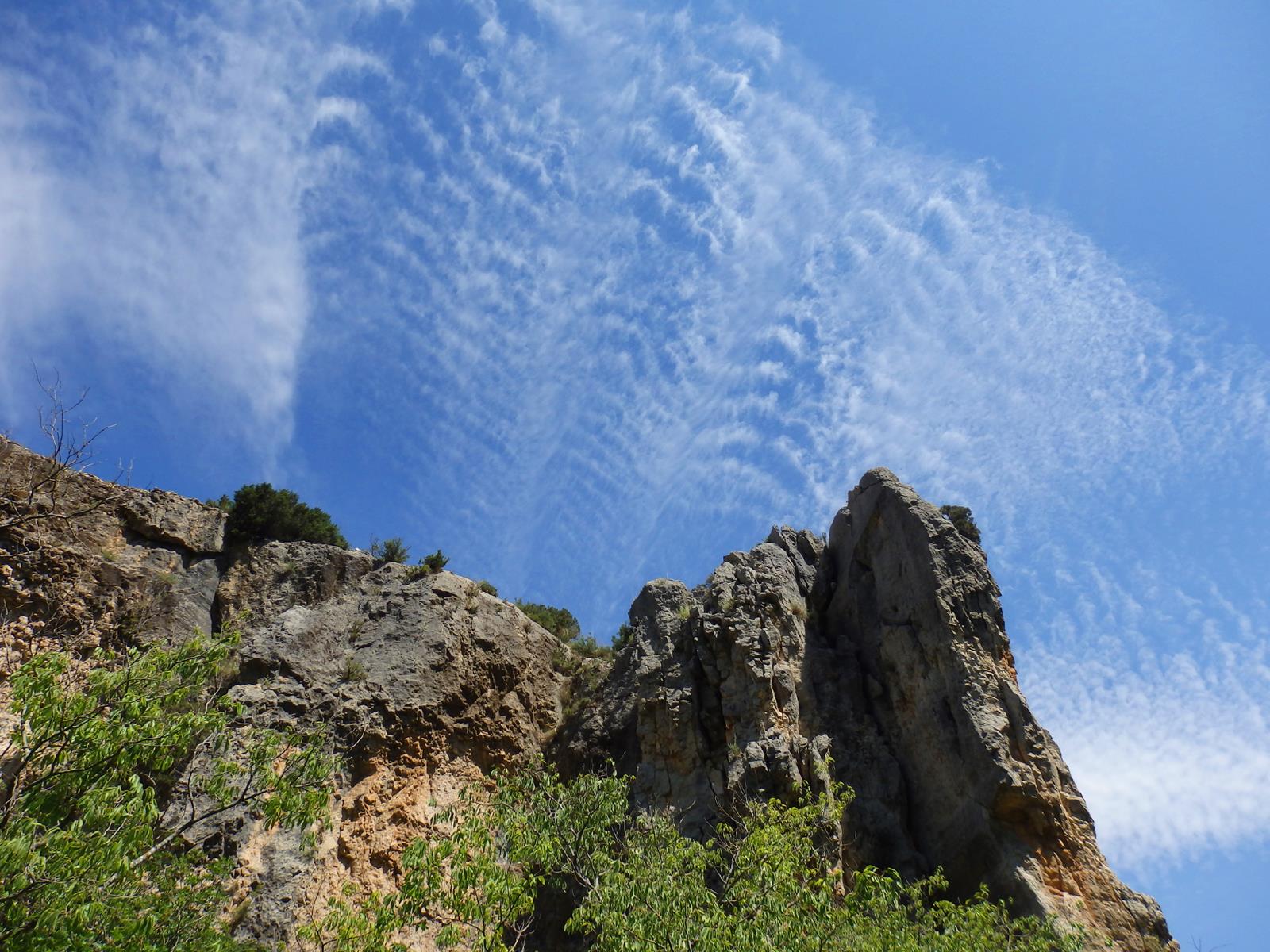 A medida que caminamos, y cuando la vegetación nos permite la visión, las paredes de roca nos envuelven y flanquean por doquier. Al mirar al cielo unas nubes estratiformes le dan un curioso aspecto al cielo. Hago unas cuantas fotos.