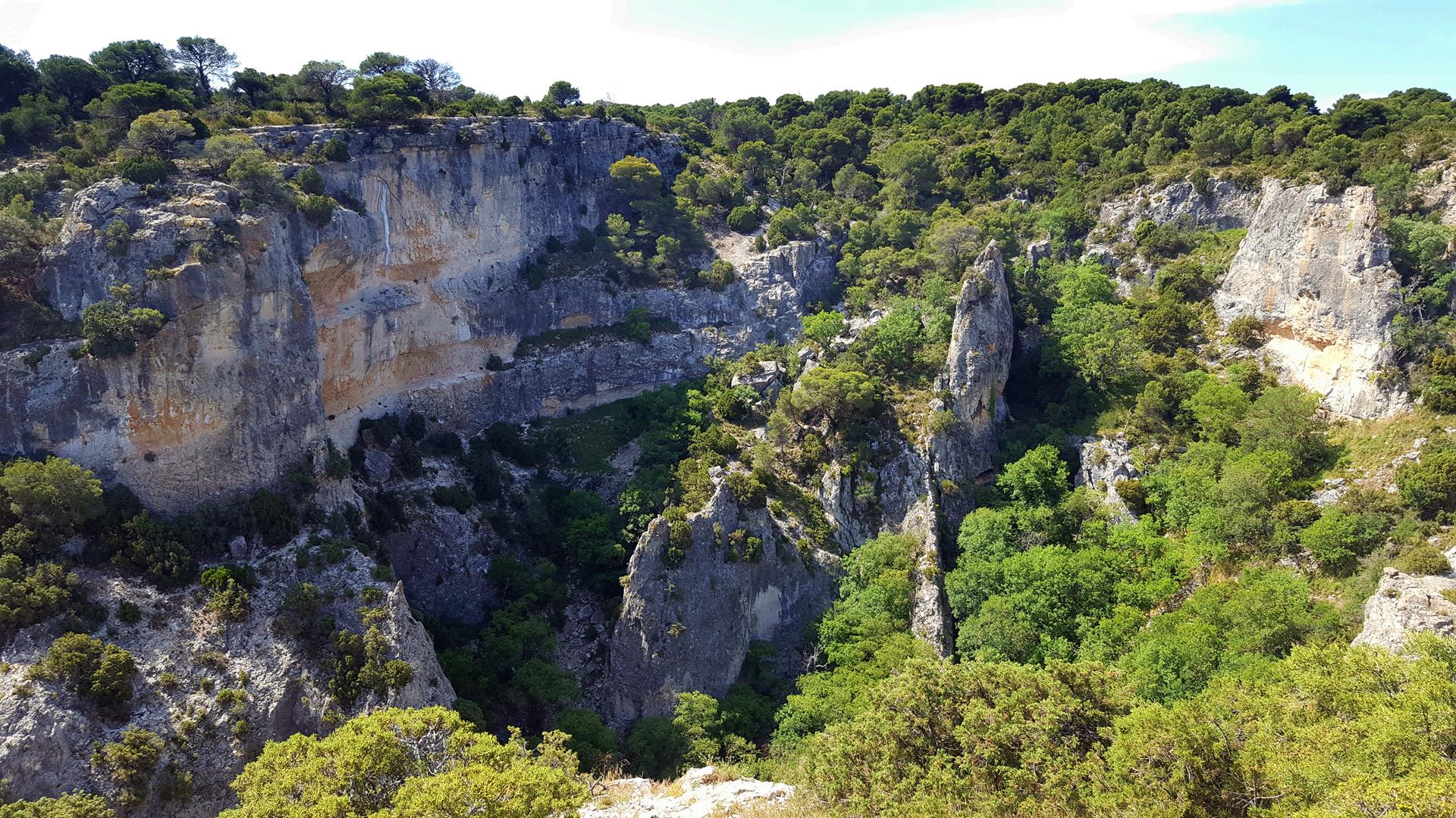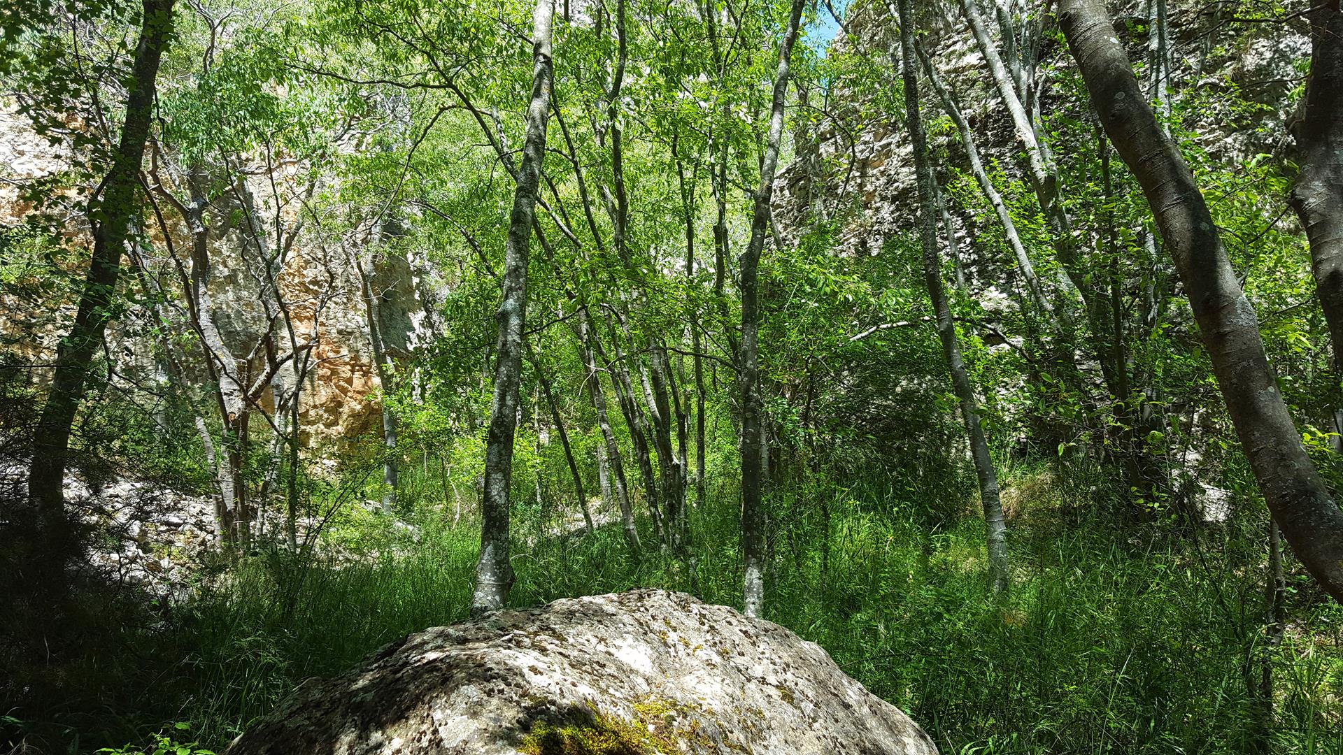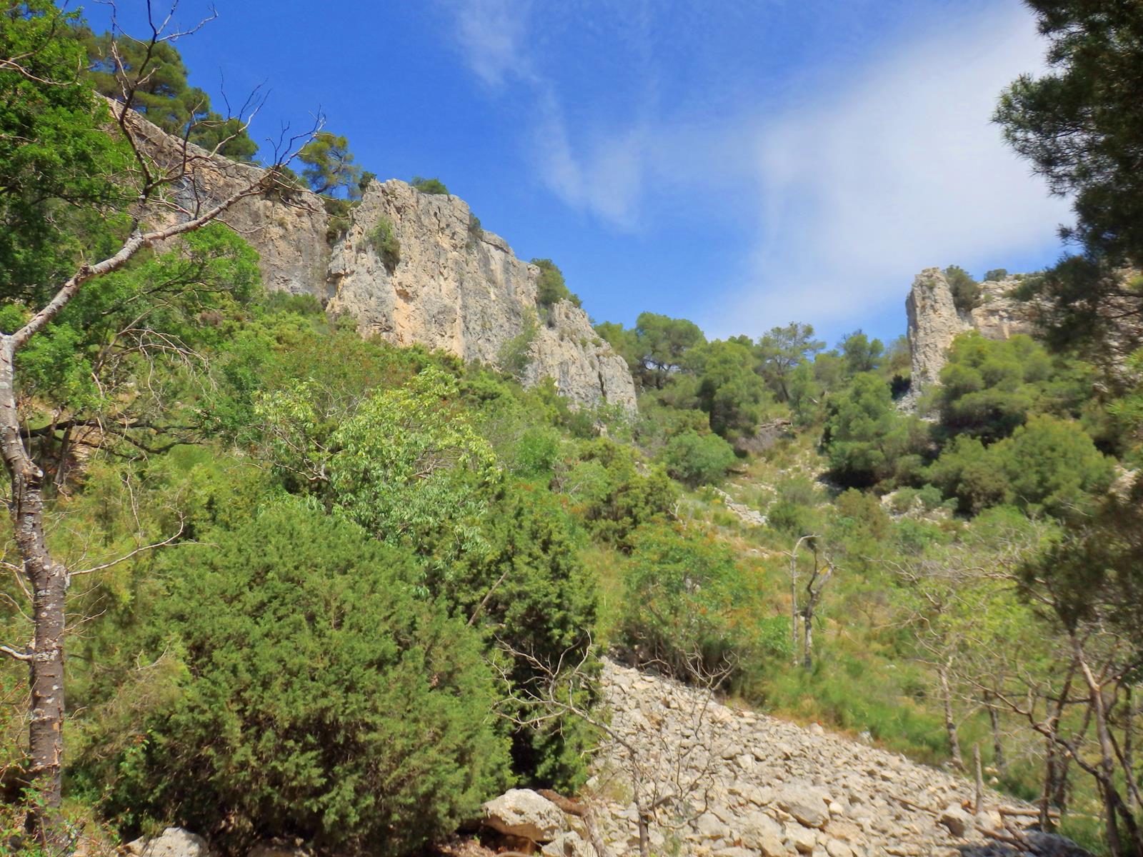 Entre la vegetación se observan las paredes rocosas que antes recorríamos en altura. Puedes imaginar los cursos de agua que hace mucho tiempo discurrían por aquí y como fueron moldeando el paisaje. Queremos verlo todo, así que decidimos primero recorrer la mitad que va hacia el suroeste, para llegar hasta el principio del barranco, para después retroceder hasta el punto de partida y seguir hacia el noreste hasta la salida de la Foz.