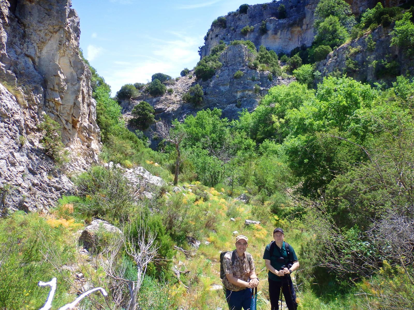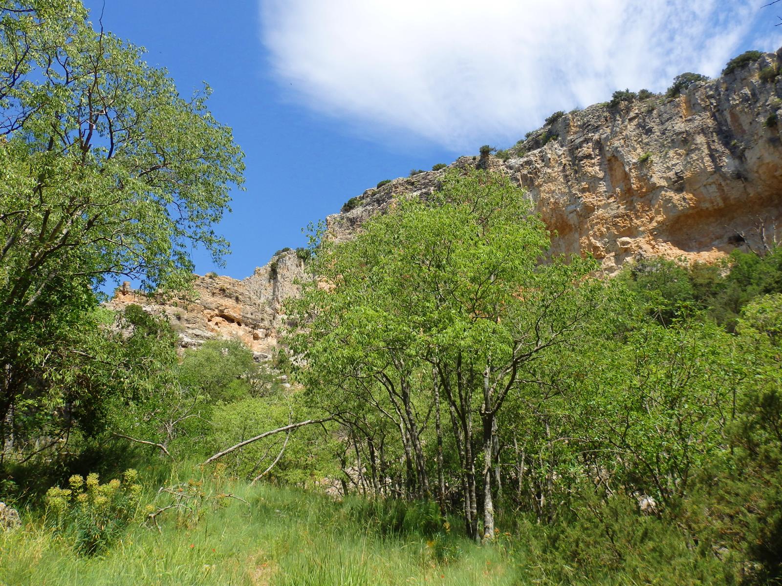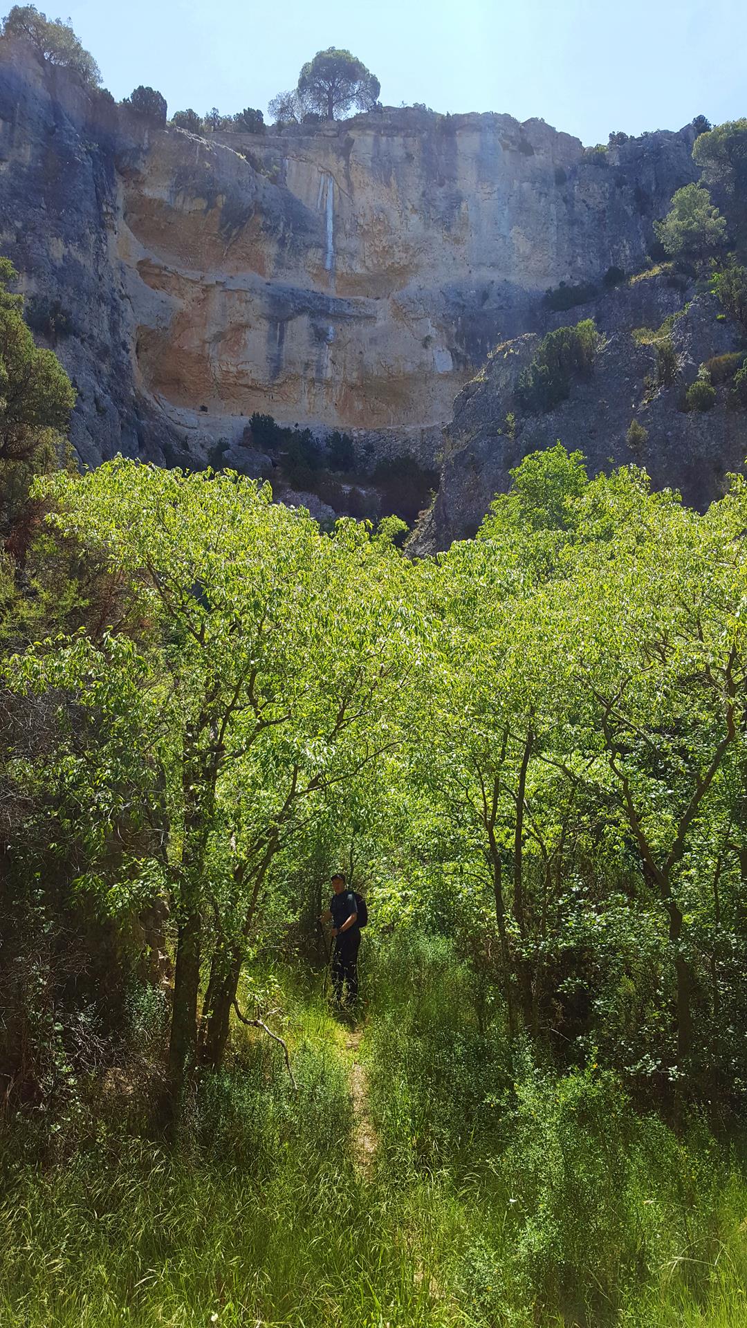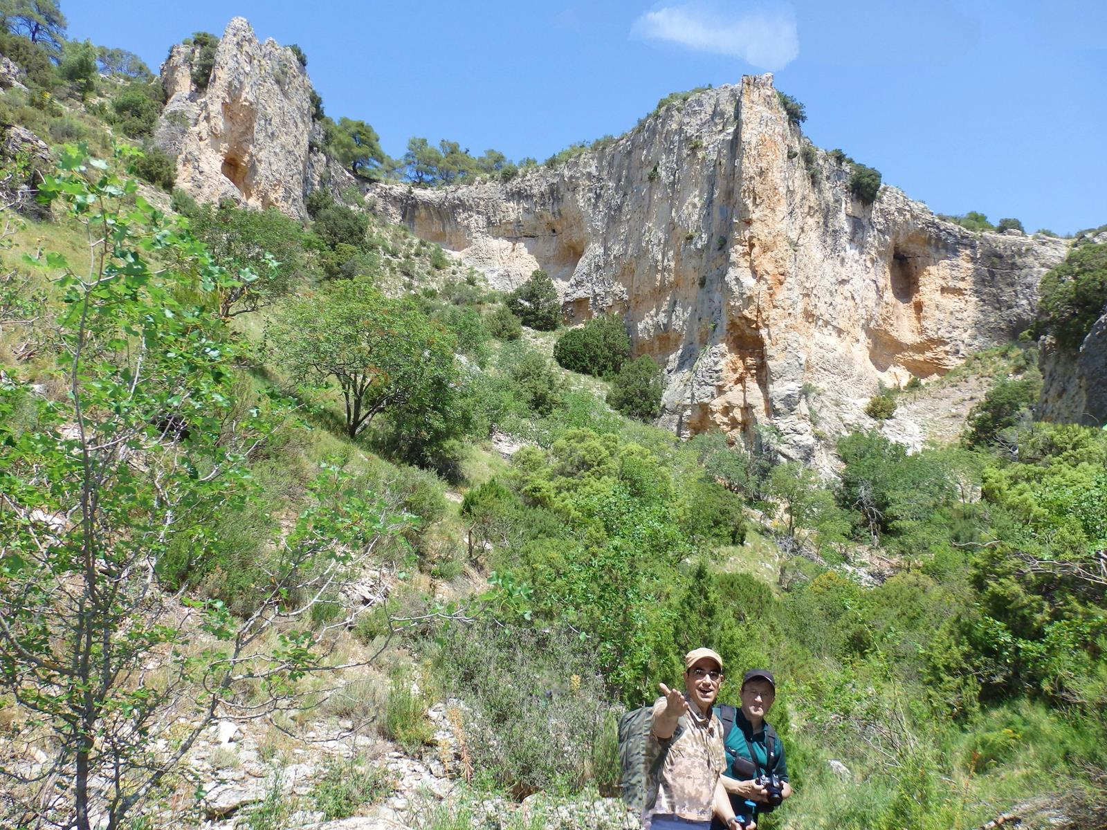 Pero cuando nos damos la vuelta, le propongo a Ángel que dejemos de hablar por unos instantes. Quiero experimentar la sensación que es estar en ese lugar. Nos quedamos en absoluto silencio. Se escuchan únicamente los cantos de los pájaros y el aire que agita las plantas, pero nada más. Es una increíble sensación de paz y tranquilidad .Dan ganas de permanecer allí un buen rato a disfrutar del entorno. Pero finalmente dejamos de estar inmersos en las sensaciones que nos rodean y seguimos la marcha. No podemos entretenernos demasiado. Queda mucha excursión todavía por hacer y el tiempo lo tenemos tasado si queremos llegar a la Hoz de Zafrané y volver a Fuendetodos. Hay que seguir.
