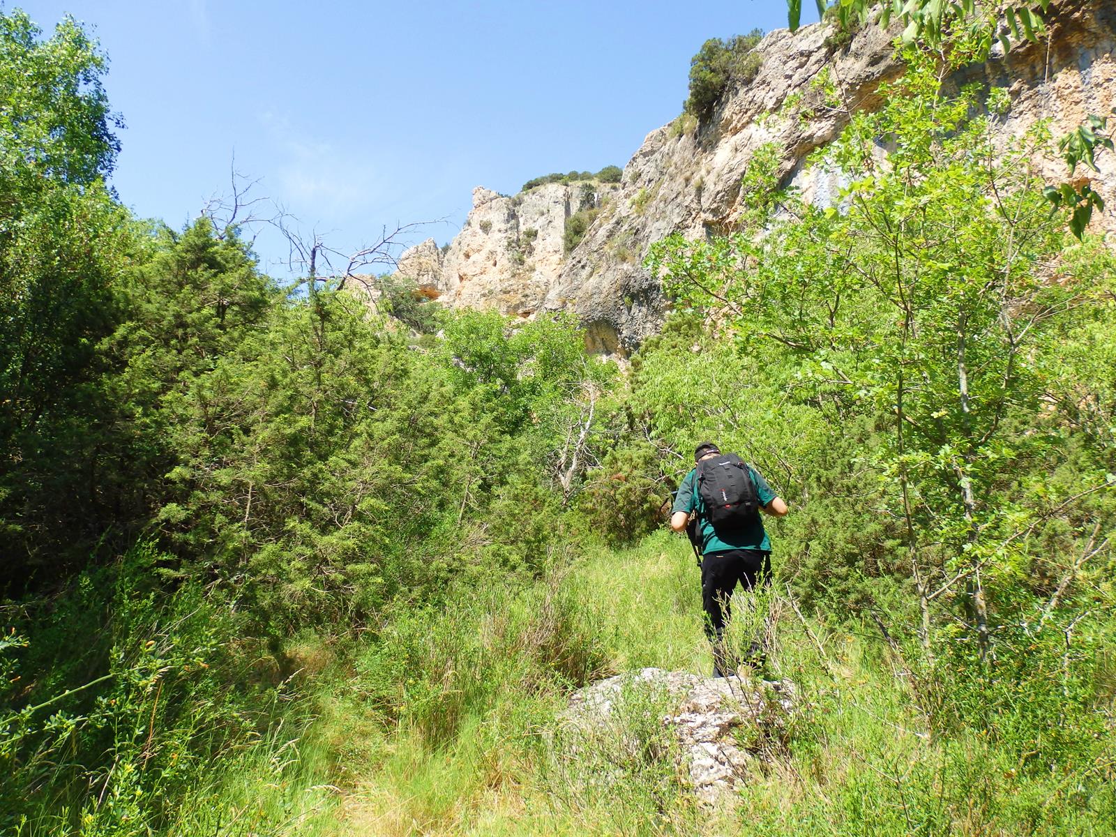 No hay camino ni senda, así que vamos buscando sortear la vegetación por los lugares que nos parecen más accesibles. A veces las zonas más despejadas están junto a la pared de roca.