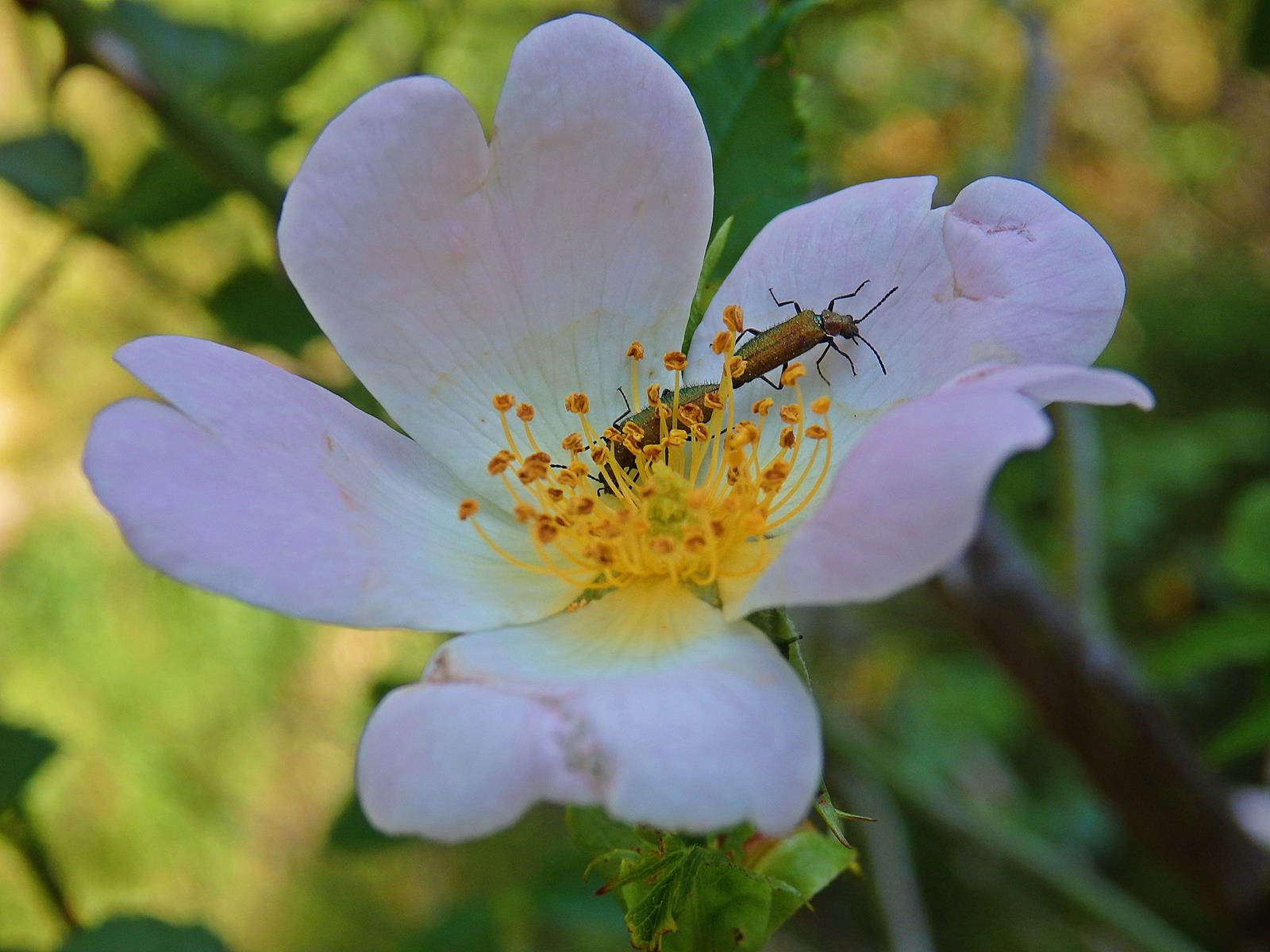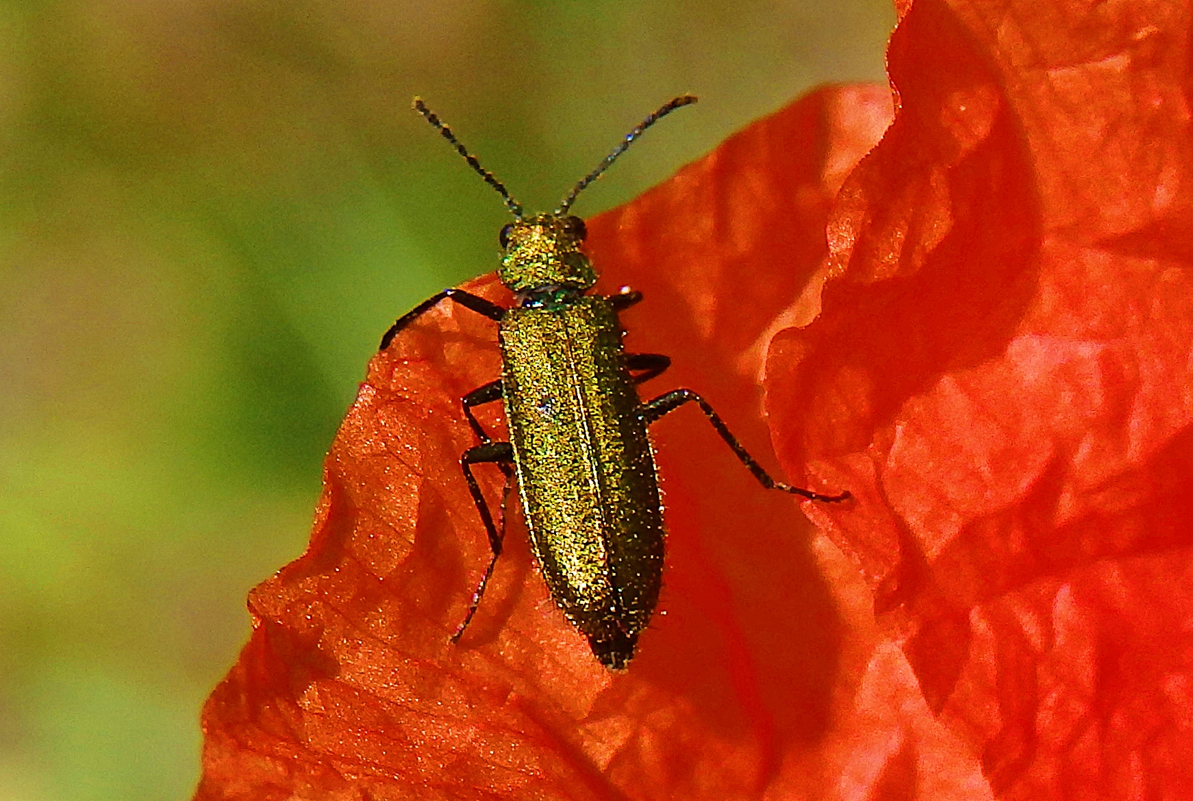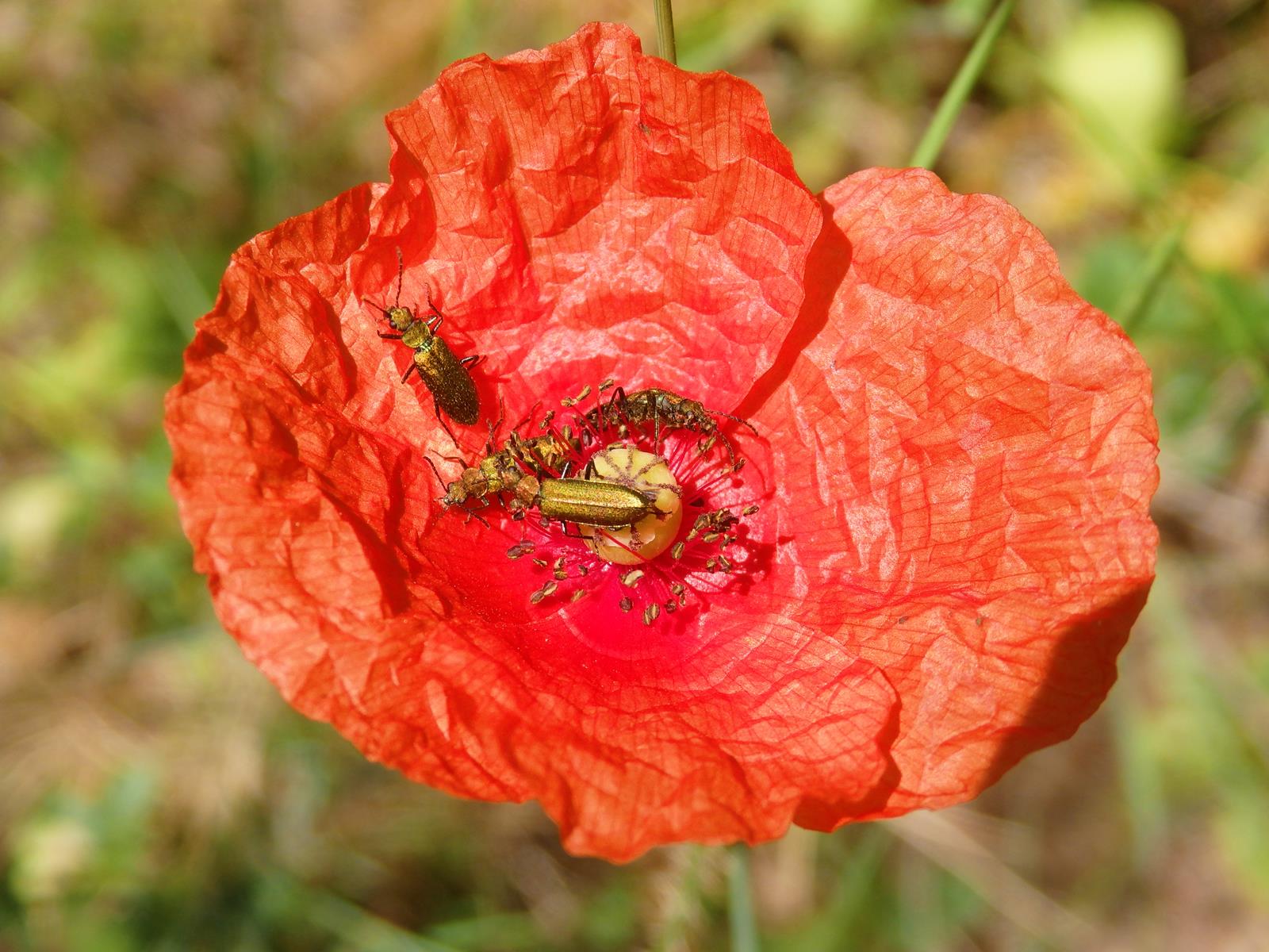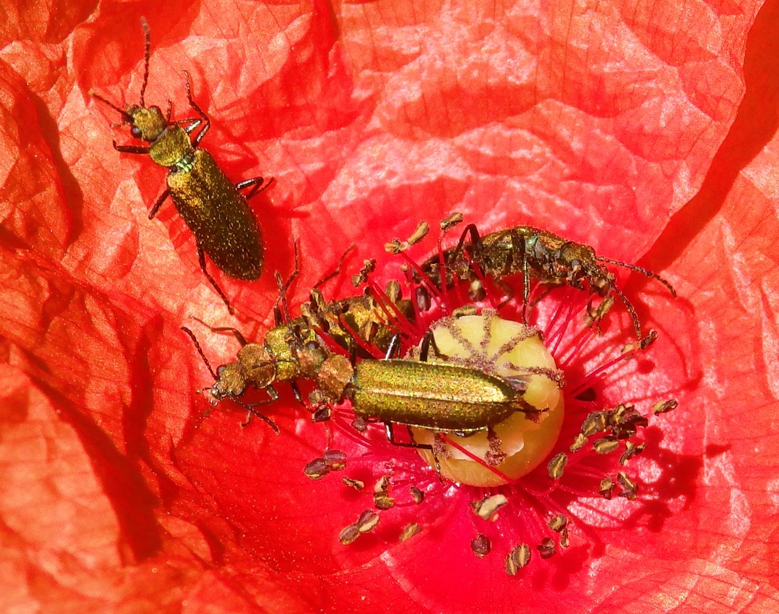 También vemos varios tipos de flores. En una amapola, unos pequeños escarabajos dorados se entretienen en succionar el polen que los estambres les proporcionan. No puedo distinguir la familia exacta de estos coleópteros, pues hay miles de especies, pero parecen cantáridas, aunque estos suelen ser más bien de un color esmeralda o verde brillante. Igual es una subespecie de esa familia, vete a saber. Pienso ¿y si es un coleóptero sin clasificar todavía? Si fuese así, lo llamaríamos el «Luisángelus», en nuestro honor, por ser los primeros descubridores. Se lo diré a mi amigo Ángel. Bromas a parte, es curioso ver como evolucionan tranquilamente por los pétalos del la flor, en su mundo bidimensional sin percibir que son observados.