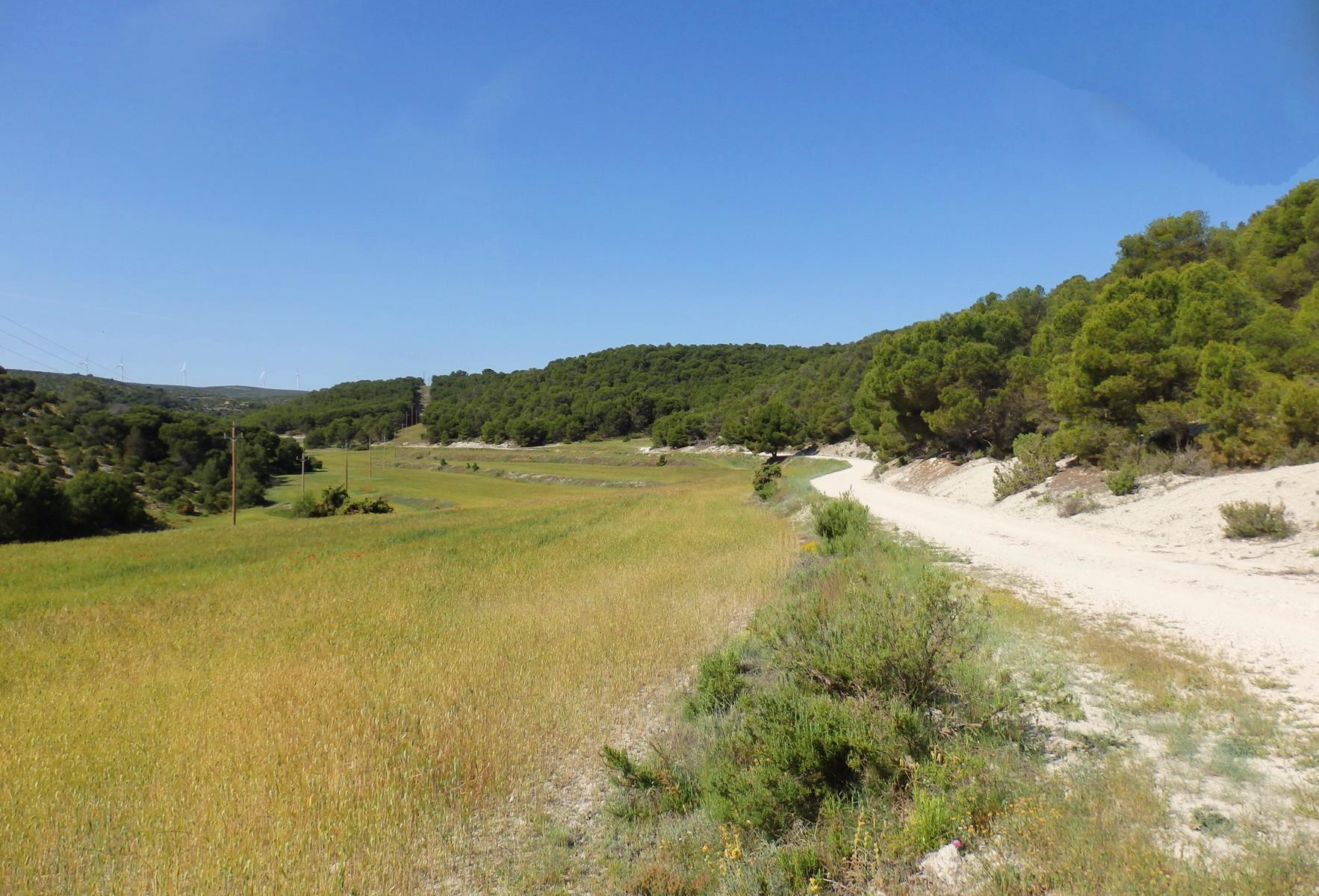 La pista por donde vamos es ancha y cómoda. Va prácticamente toda en descenso y resulta fácil de superar sin otra exigencia física que el caminar. A la vuelta no será lo mismo, pero de subida, esperemos llegar con fuerzas de sobra. Estamos en las inmediaciones de lo que se llama la Sierra Gorda, una extensión amplia de pinares y otros árboles que se extiende por toda esta comarca y que por la cantidad de campos de cultivo arrebatados por el hombre al monte bajo, la imagino mucho más frondosa en el pasado.