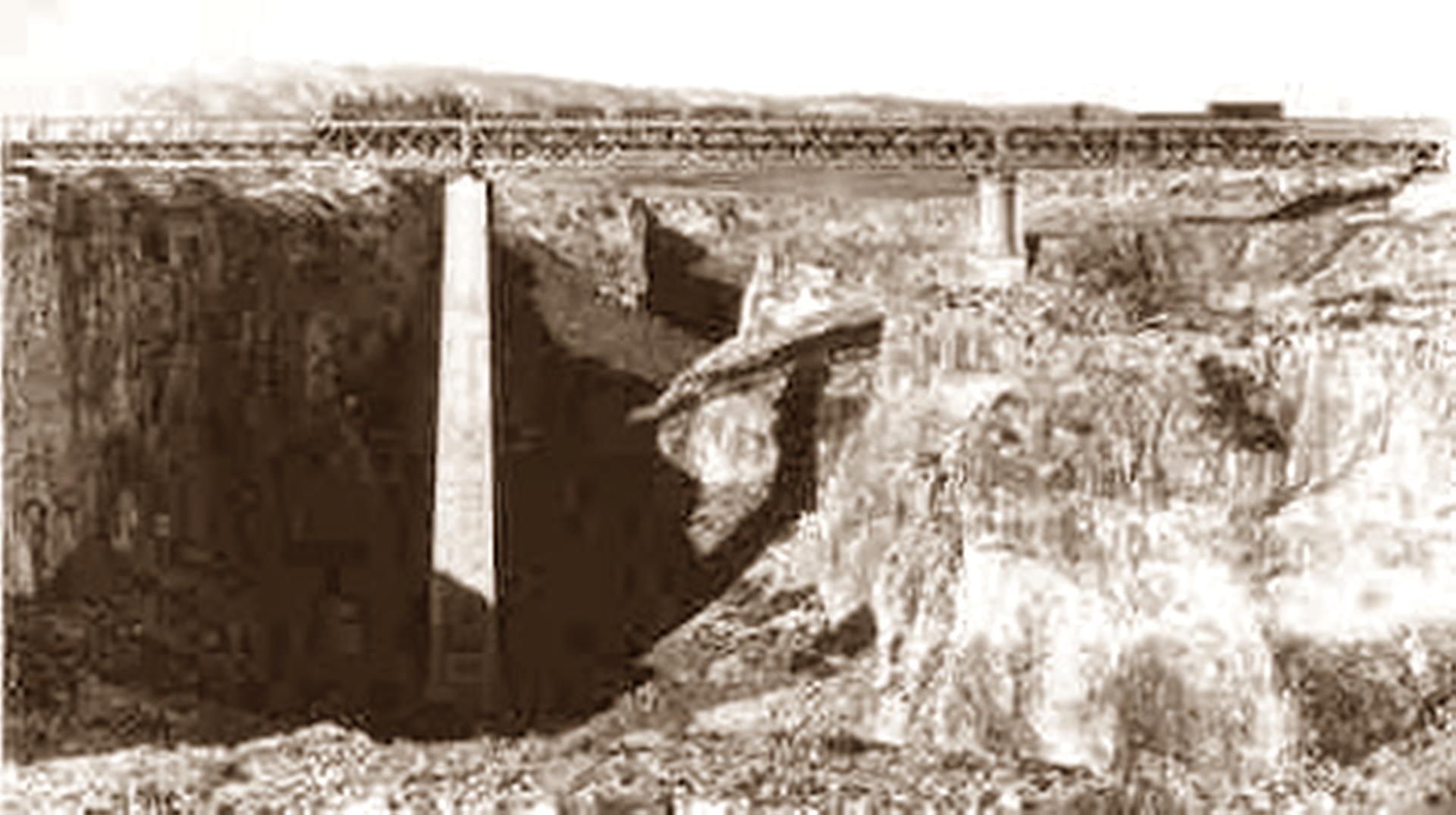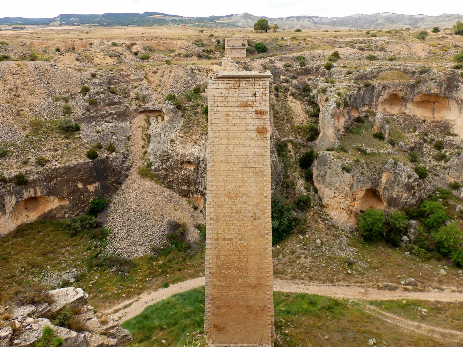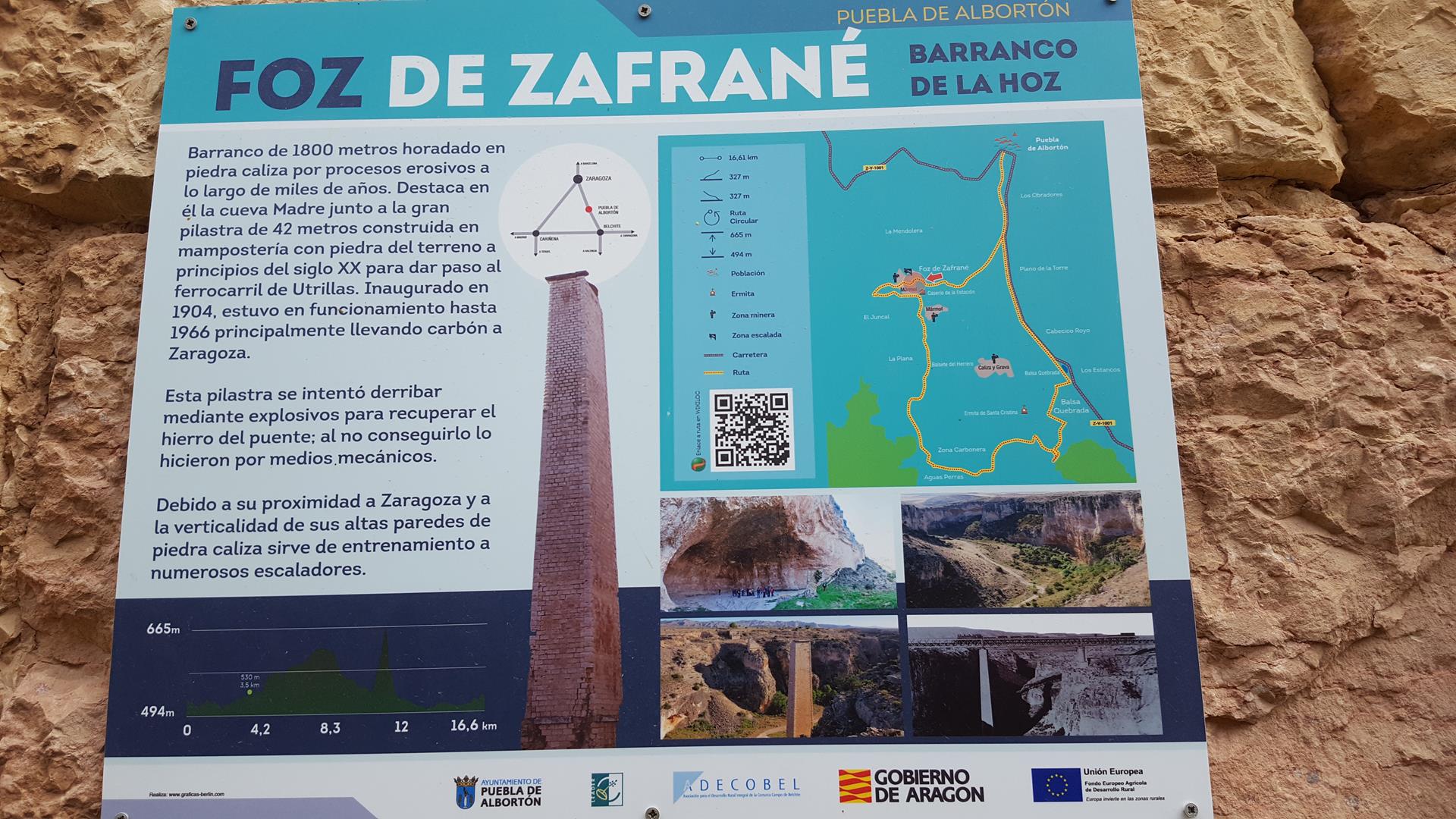 Este ahora solitario monolito, tiene una historia interesante. Hace ya más de cien años, un tren minero, concretamente el de Utrillas, recorría esta zona llevando carbón a la ciudad de Zaragoza. Cuando se construyó la línea férrea, se tuvo que salvar esta foz, y se hizo mediante un puente de hierro, de 112 metros de largo, que le permitió atravesar el barranco.