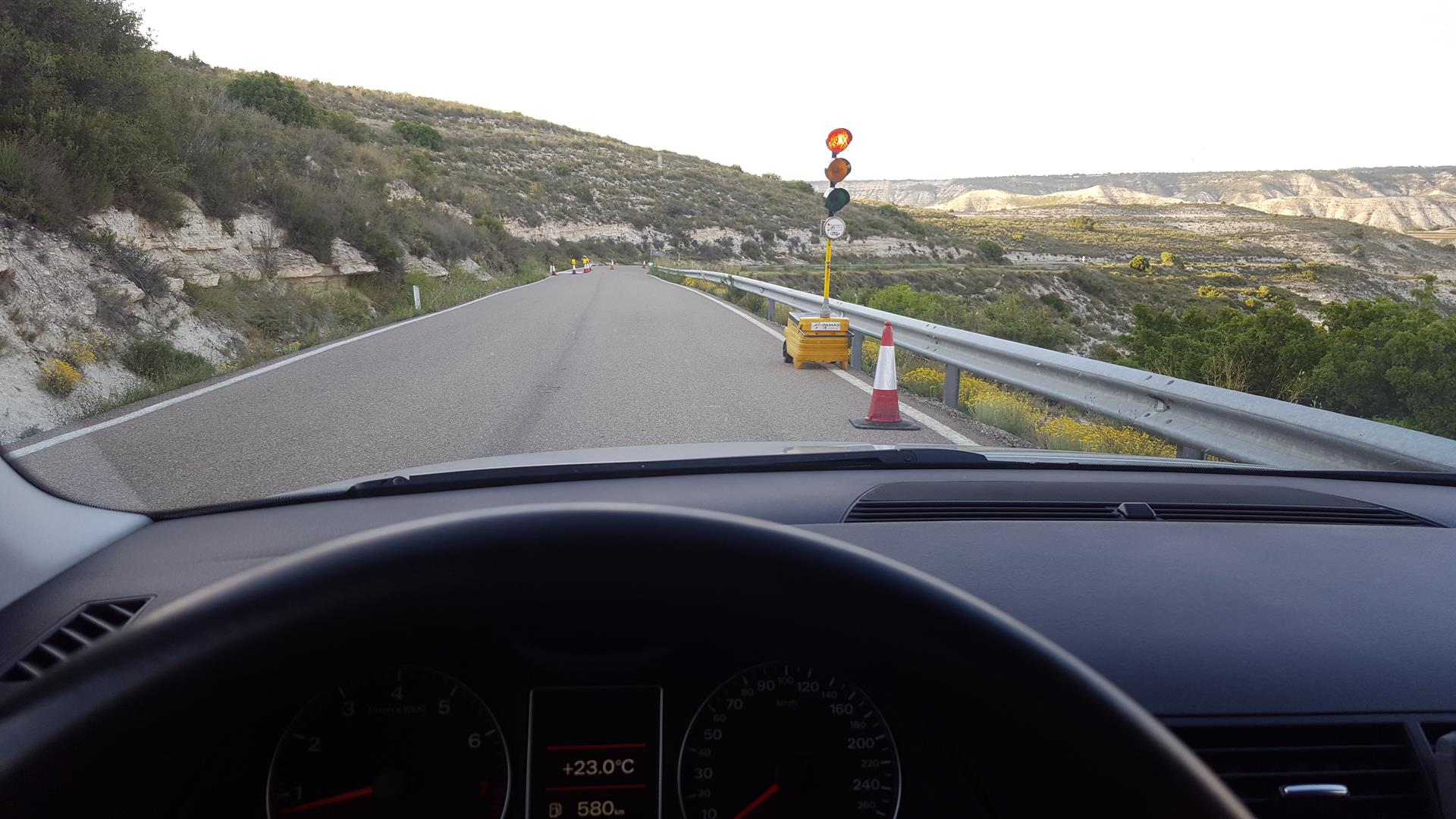 Volvemos otra vez a la carretera que lleva de Fuendetodos a Jaulín y de allí a Botorrita. El pequeño puerto antes de llegar a Jaulín está regulado por semáforos en algún que otro tramo. Están reponiendo la gravilla del firme. En estas carreteras comarcales, hay que ir con cuidado, porque aunque no tienen tráfico apenas, el trazado es bastante irregular.