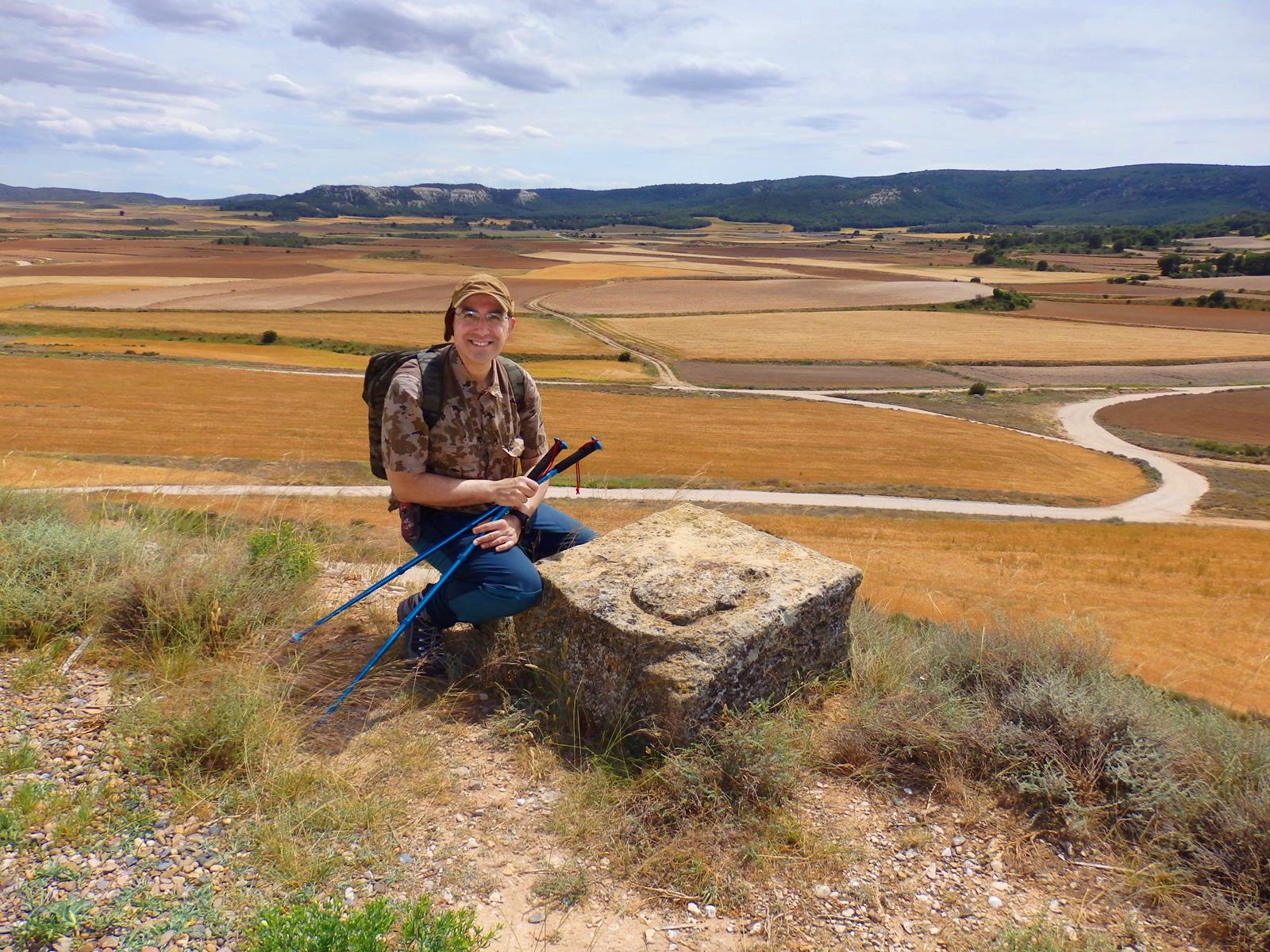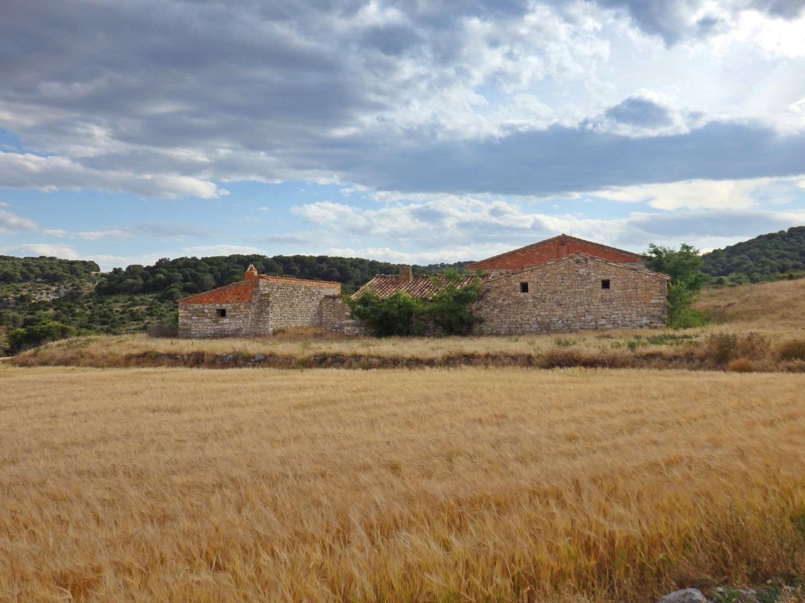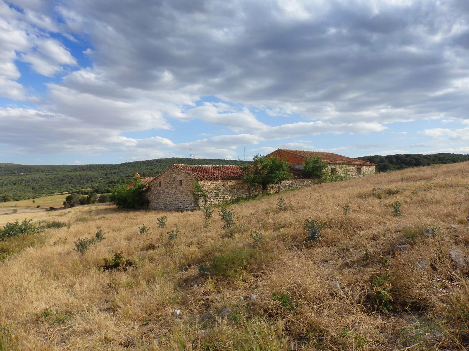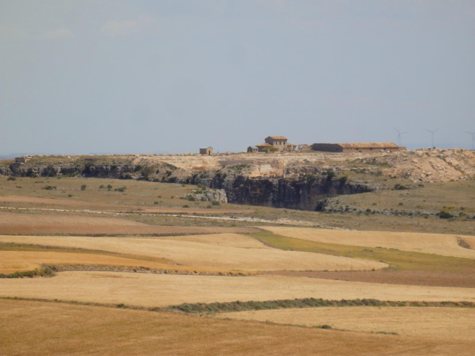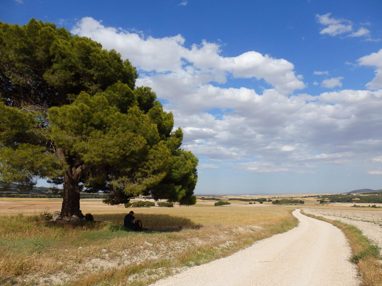 La zona está rodeada de campos de cereal. Al cabo de un rato vemos una especie de granja rural, que parece abandonada también y a su lado un pino grande, que por cierto da una buena sombra. Decidimos parar ahí un rato, beber agua y refrescarnos. Bajo el pino sopla una brisa muy agradable. Se está genial. Quién lo plantó ahí supo lo que se hacía.