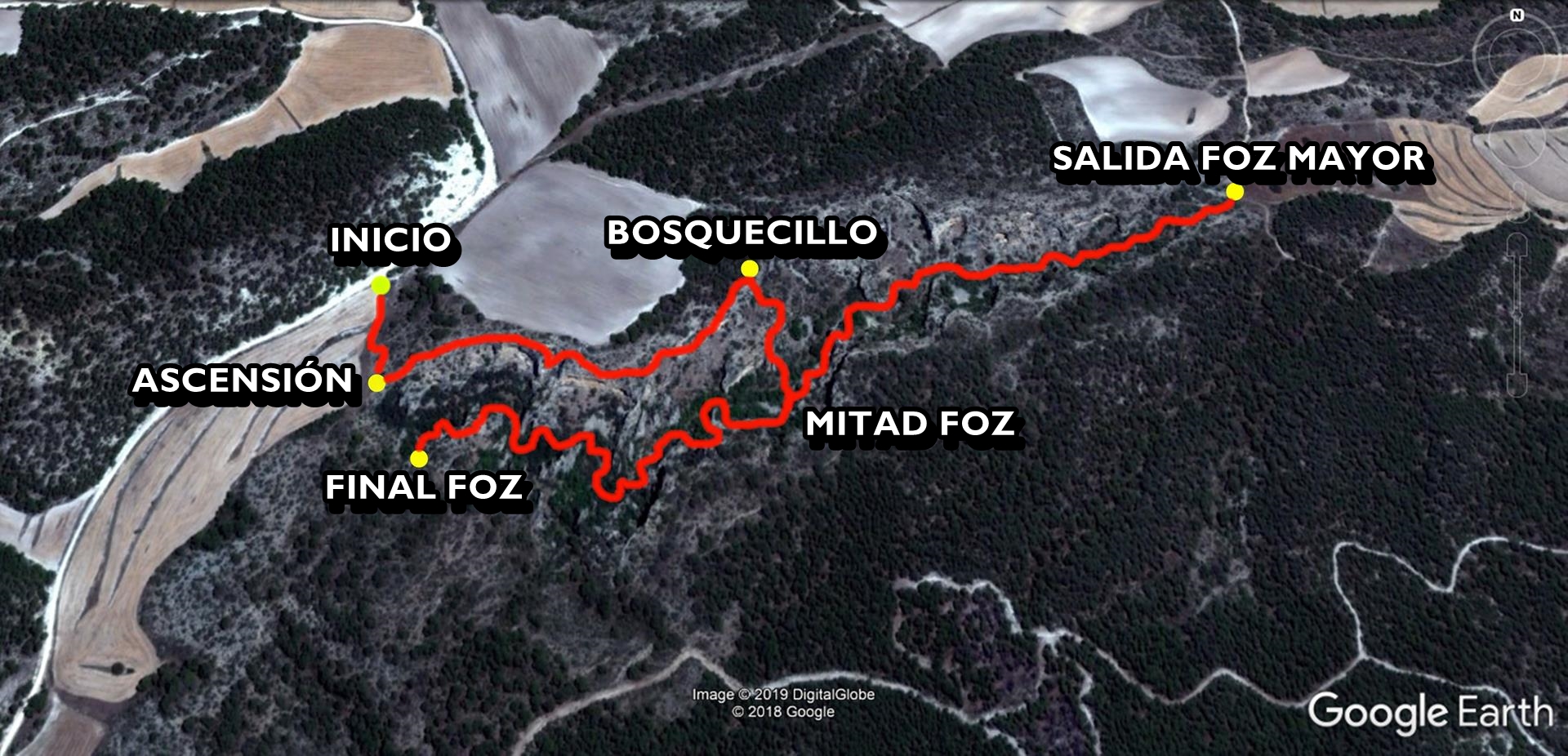 Como queremos bajar a lo profundo de la Foz, debemos dejar los cortados de la parte alta y entrar en un bosquecillo de pinos para desde él, descender al fondo del barranco. Saldremos más o menos a la parte media del mismo. No hay senda ni camino, A veces los pinos nos impiden el paso y hay que sortearlos. De todas formas no te puedes perder. En lo alto están los campos de cereal. A una mala, con subir hasta ellos te puedes volver a orientar e incluso acceder a la pista principal.