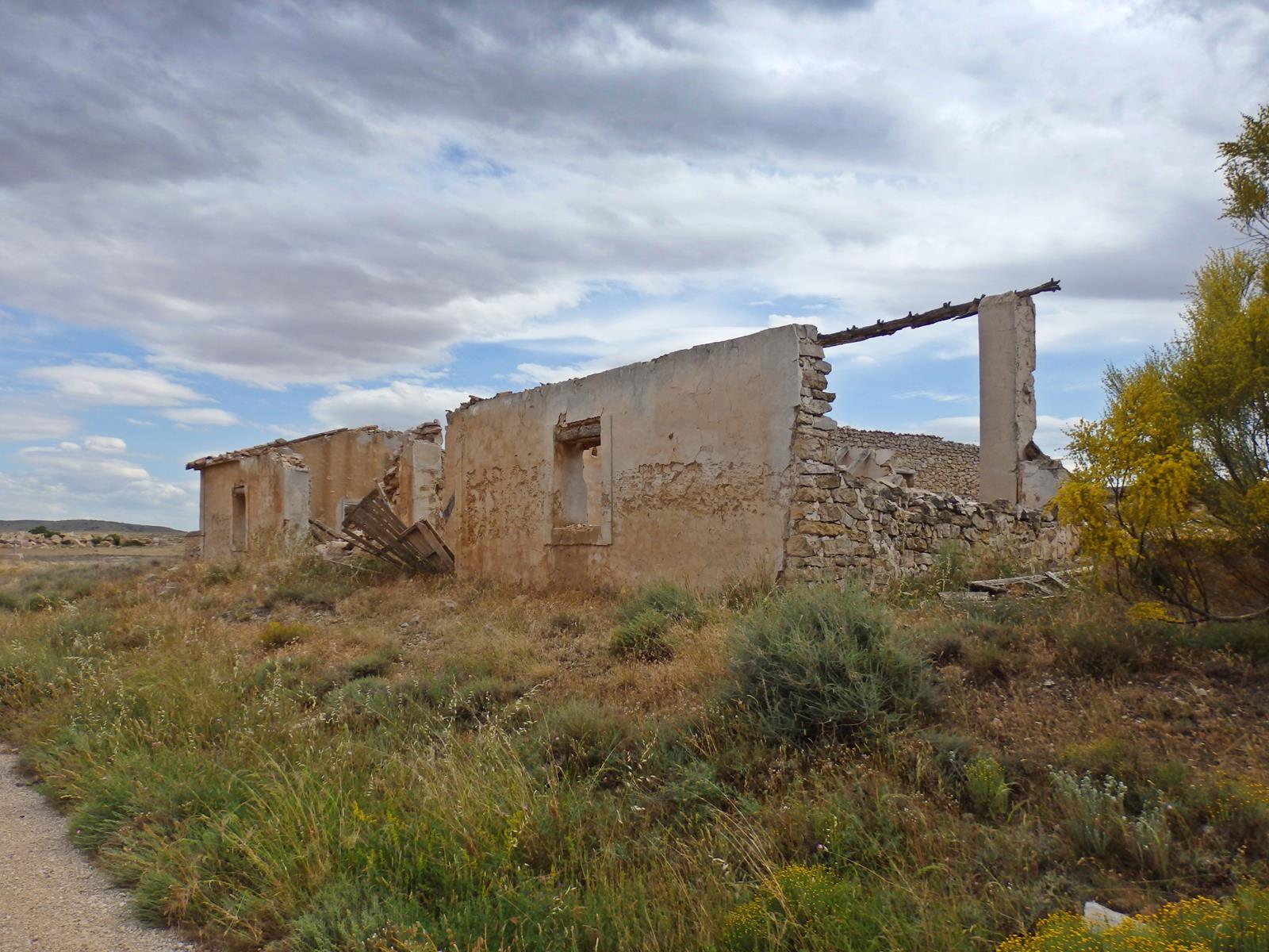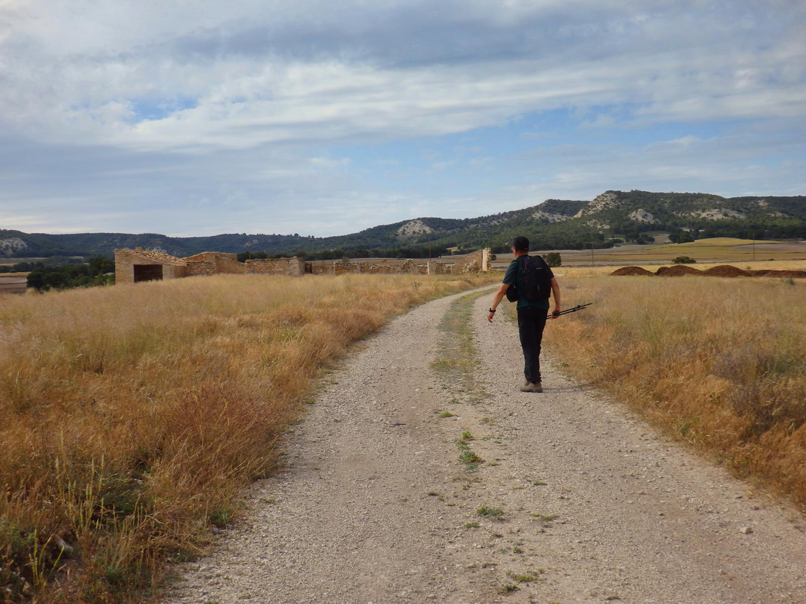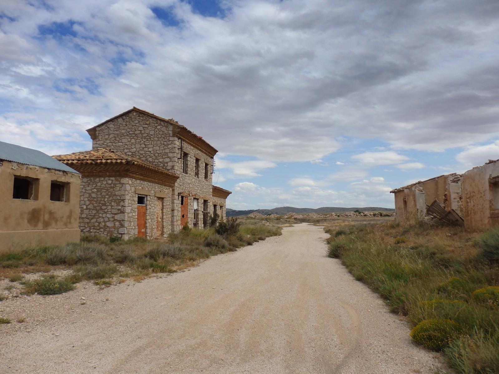 Ya con todo listo, iniciamos la caminata. Salimos de Fuendetodos por un camino de tierra que hay cruzando la carretera, más o menos frente a las escuelas municipales, y que una vez tomado, y avanzando por él, deja a su izquierda un edificio a medio acabar,