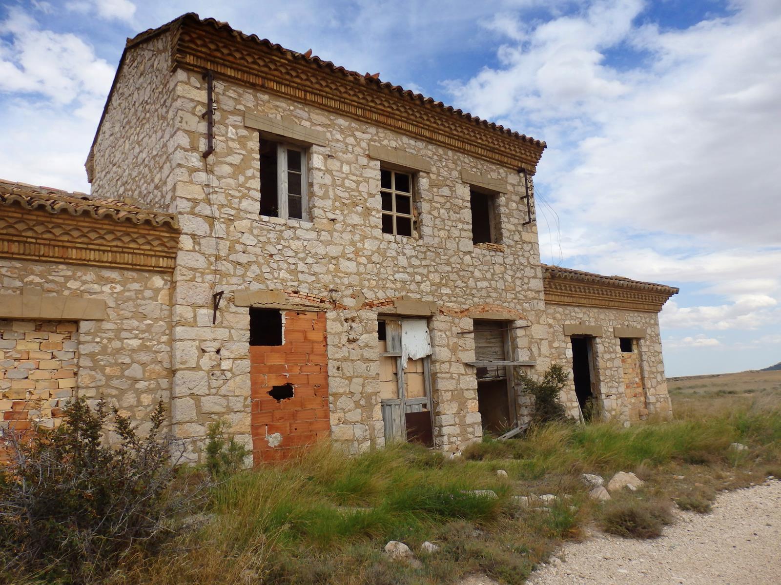 A medida que vamos avanzado, llegamos a la altura de la pilastra del ferrocarril. A nuestra izquierda hay unos pequeños edificios. Nos vamos a acercar a verlos. No es otra cosa que la antigua estación del tren minero. Se trata de la estación de la Puebla, la número catorce del recorrido desde Utrillas, y está en el kilómetro ochenta y seis de la línea de vía estrecha. Aquí estaba situado un aljibe y un muelle para granos.