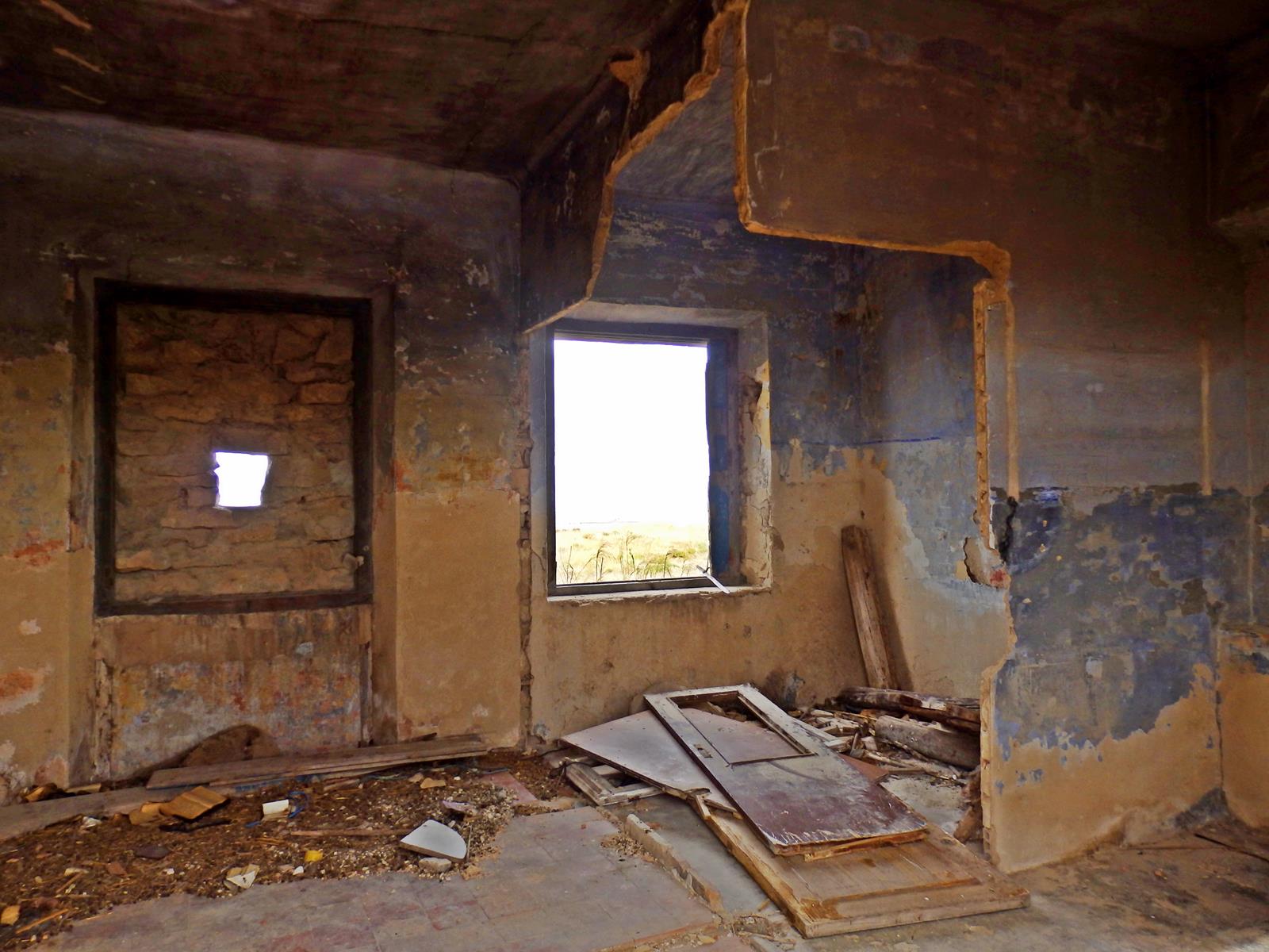 Todos los edificios están en ruinas. Uno está especialmente deteriorado. El otro aún conserva su estructura pero el interior está destrozado. Han tapiado las puertas y ventanas con ladrillos pero lo que se puede ver está en un estado lamentable. Entre ellos aún se adivina el camino que seguía la vía, pero sin raíles ni traviesas. Todo lo que pudieron aprovechar, se lo llevaron. Tampoco hay ningún cartel ni indicación que nos de una idea de lo que fue aquello. En una garita que está abierta, hay una mesa y una silla destartaladas. Un calendario cuelga de la pared. Año 2012.