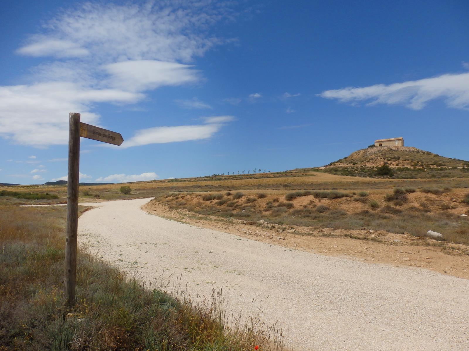 Se adivinan a ratos roderas, y en la parte central crecen hierbas. Esta claro que hasta aquí acceden eventualmente vehículos. Aún queda algún charco en el camino y alguna zona con barro de las últimas lluvias. No hemos visto a nadie desde que salimos de Fuendetodos. Salvo una furgoneta que pasó rápidamente por el camino junto a la ermita, cuyo conductor nos saludó, y nosotros a él. Nada más.Y de eso ya hace unas horas.