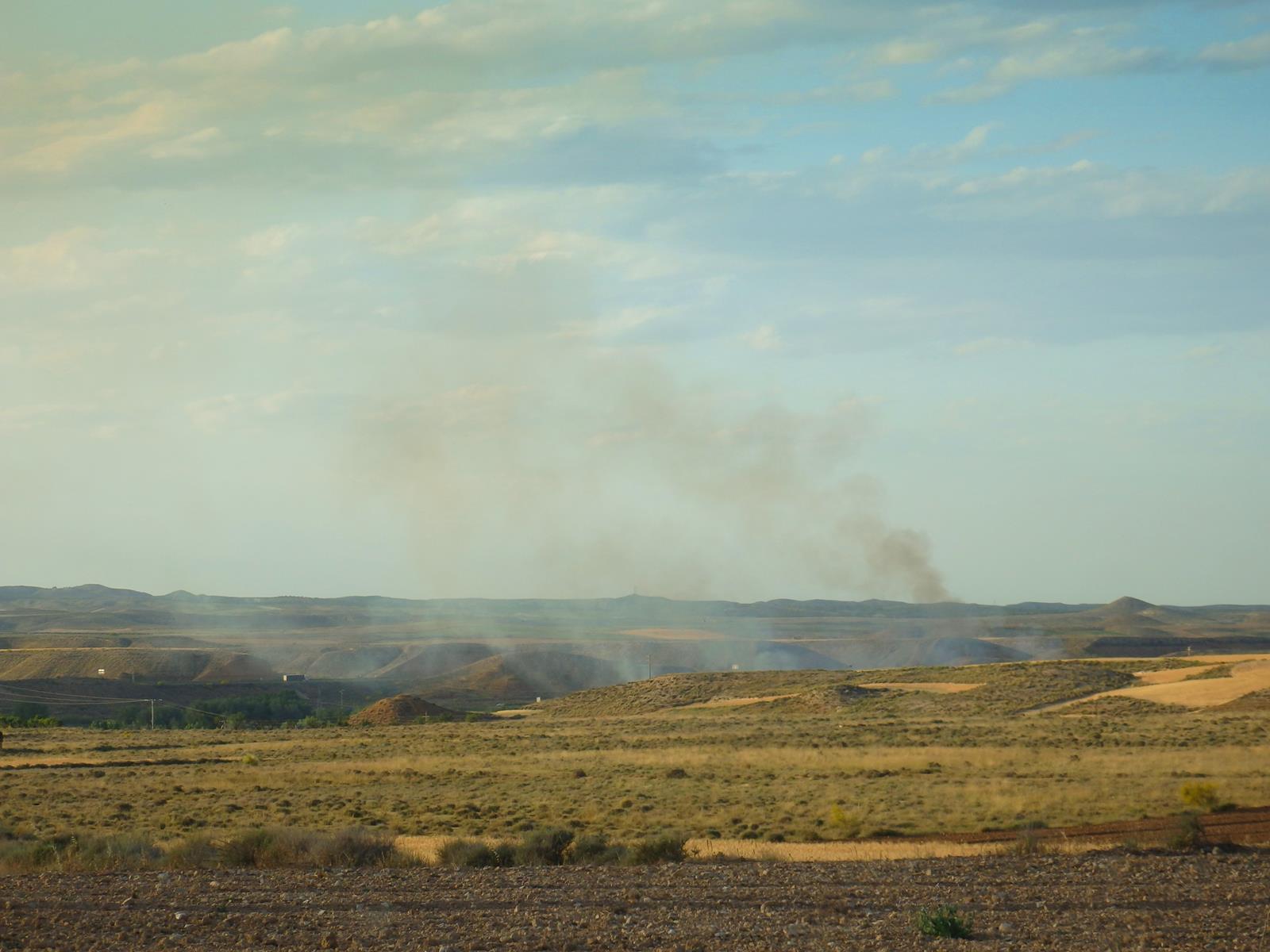 Y pasado Botorrita llegamos hasta la autovía Mudéjar que nos llevará a Zaragoza. Un poco antes de entrar en la autovía nos llama la atención una gran humareda en la lejanía. Luego veremos que es un incendio producido por la quema de algunos rastrojos que se ha extendido, y hay algunas dotaciones de los bomberos apagándolo. La mayor parte de los fuegos son por la imprudencia humana. Una pena. Espero que este verano próximo no tengamos que escuchar muchas noticias al respecto.