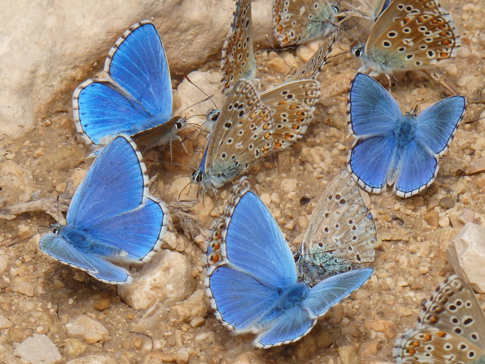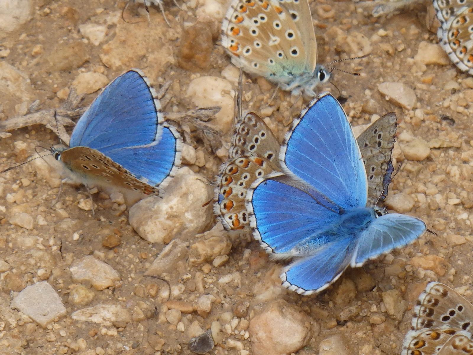 Esta mariposa es la llamada mariposa azul común (Polyommatus icarus), de la familia Lycaenidae, y habita en Europa principalmente aunque también existe en el norte de África y en las islas Canarias. Algunos ejemplares se han descubierto en zonas puntuales de Canadá y China. Se reproducen en praderas bajas y lugares de piedra caliza. Donde nosotros estamos ahora, hay abundancia de esta roca. Pero no es común ver muchas, porque al final solo nacen unos pocos ejemplares. Así que parece que estamos de suerte. Su tamaño es aproximadamente de 2,8 cm a 3,6 cm.