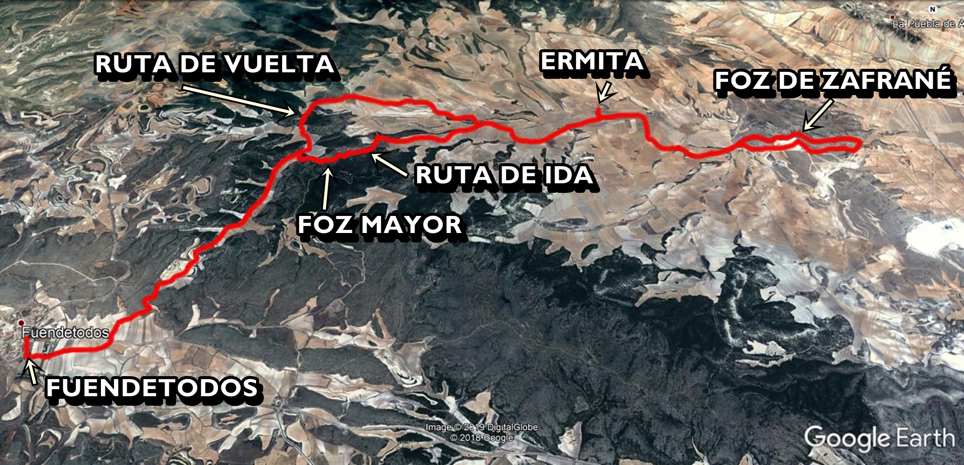 La idea que llevamos es terminar de recorrer la Foz de Zafrané por su parte baja y luego subir por la parte alta, ver el pilón que sujetaba la vía del tren desde otra perspectiva, y ya, finalmente regresar a Fuendetodos.