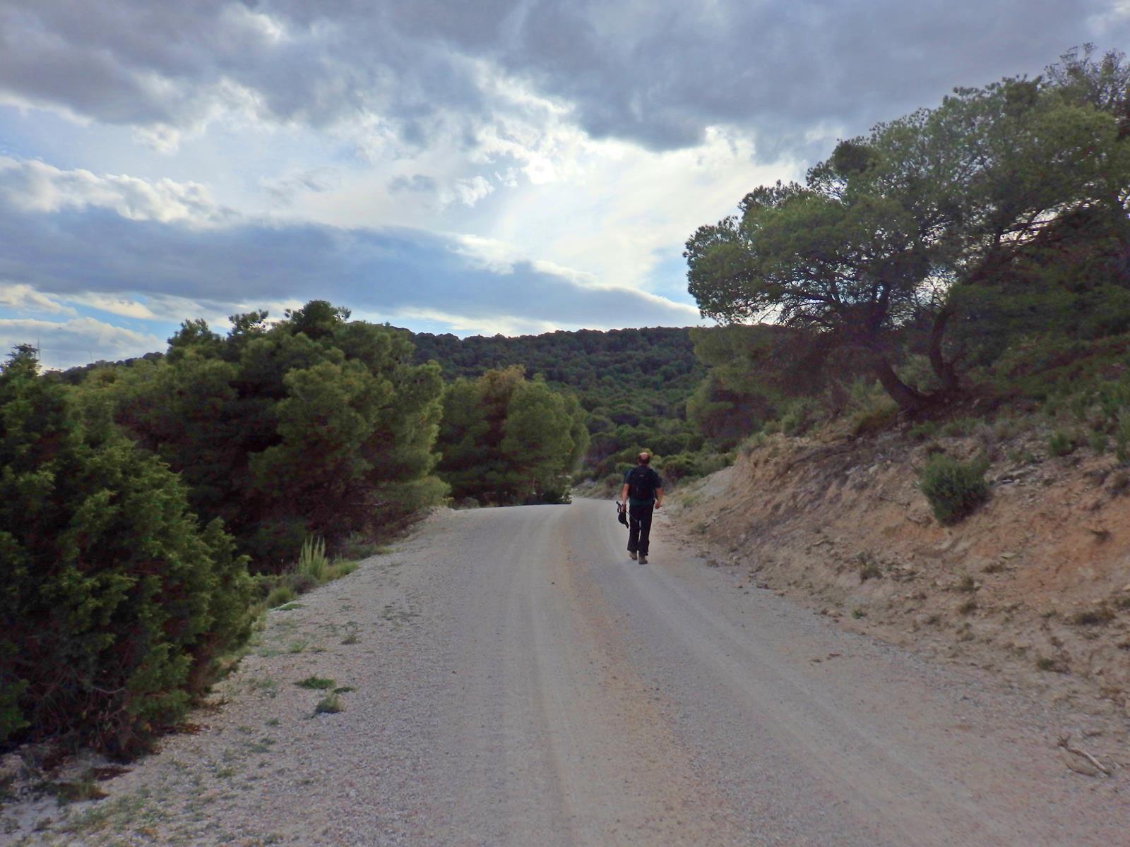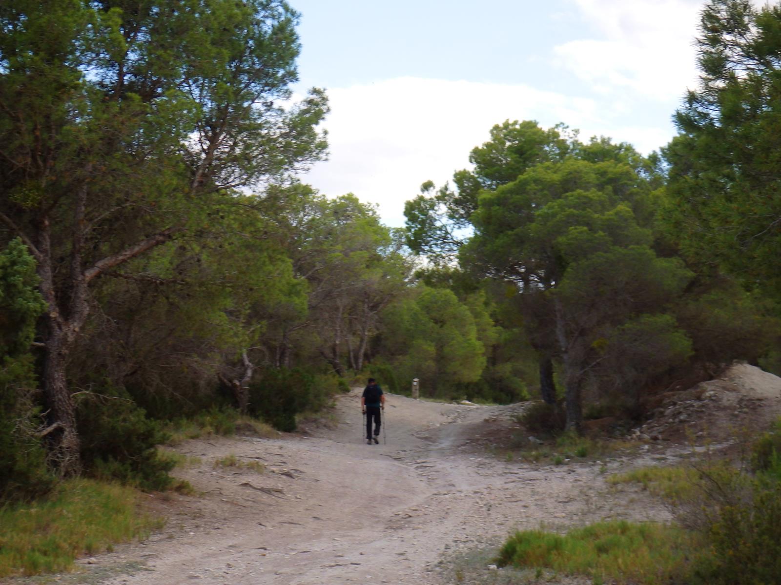 Al cabo de aproximadamente una hora ya hemos llegado a la Ermita de San Roque. Desde allí nos queda otra hora, más o menos, hasta llegar a destino. En vez de volver por el camino de la mañana, cogemos en una bifurcación la pista de la derecha, que se introduce en unos pinares. No es intencionado, nos hemos equivocado pero el resultado es el mismo, sólo que alargaremos unos tres kilómetros más, y cuando ya se va de vuelta, todo lo que sea alargar el camino no cae muy bien. Pero no nos queda otra.