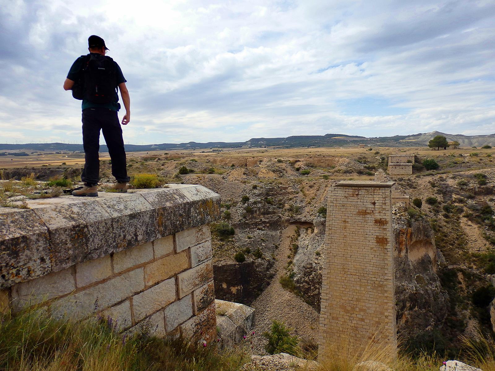 Seguimos. Nos acercamos a la zona donde acaba el terreno y comienza el vacío,justo donde empezaba el puente sobre el barranco. Enfrente y en el centro, la pilastra. Y más allá, el otro lado. Puedes imaginar las vías salvando el espacio entre ambas paredes, sólo que ahora no están. Y también imaginar lo que vería el maquinista al cruzar con aquellas máquinas de vapor arrastrando los vagones cargados a rebosar del preciado carbón.